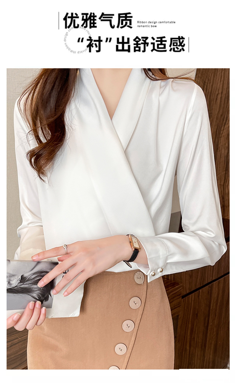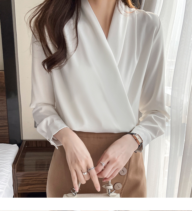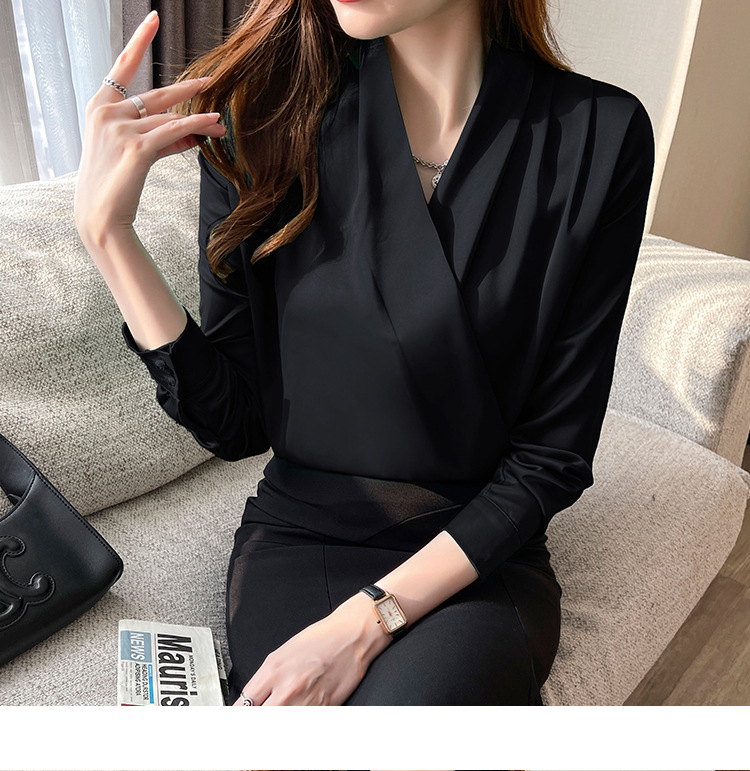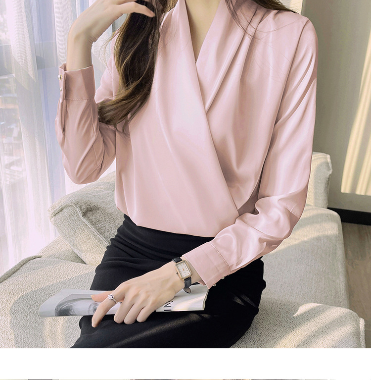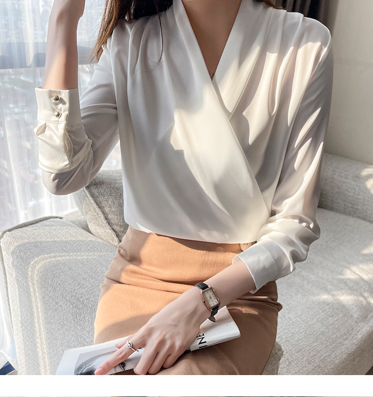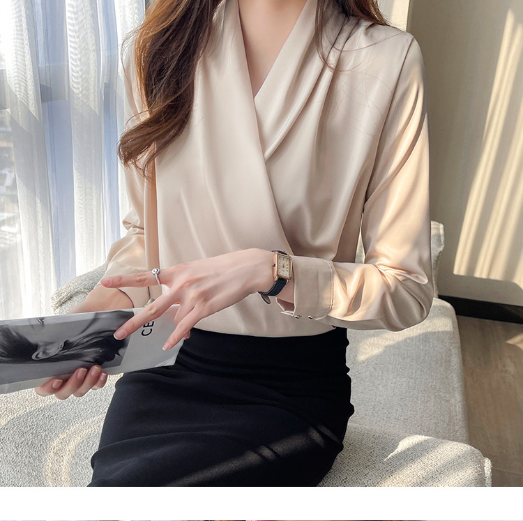 새틴 긴팔 셔츠 여자의 2024 봄 가을 새로운 디자인 센스 틈새 프로 V넥 셔츠 올 매치 쉬폰 셔츠스토어 가기
