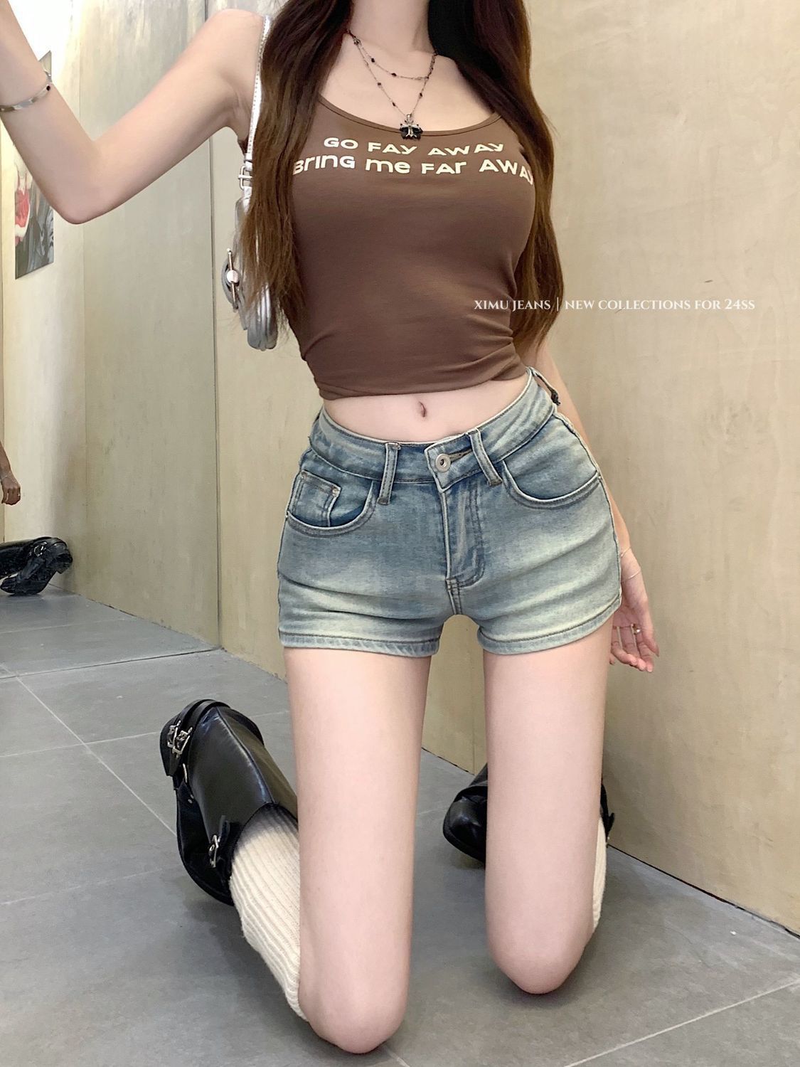 여성을위한 미국의 뜨거운 소녀 씻어 밝은 색상 데님 반바지 여름 복고풍 하이 스트리트 슬림 피트 엉덩이 덮는 핫 바지스토어 가기
