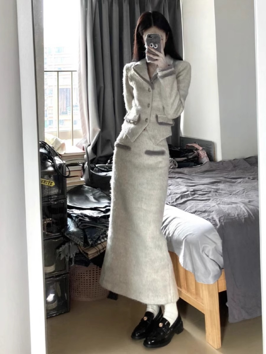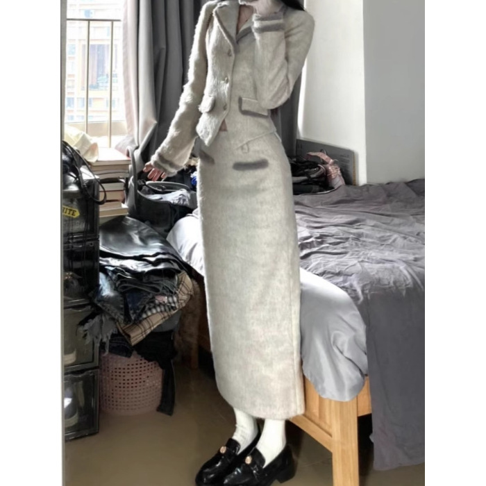 풍부한 딸 작은 향기로운 스타일의 양모 세트 여성의 가을과 겨울 분위기 색상 매칭 세트 재킷 반길이 스커트 투피스 세트스토어 가기