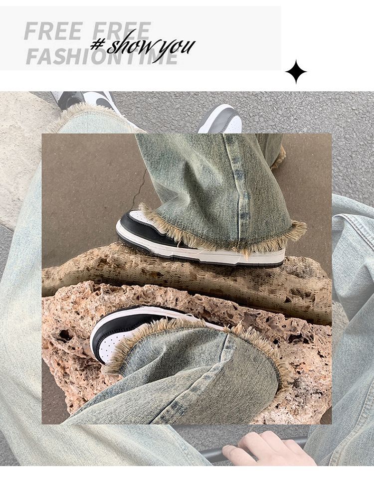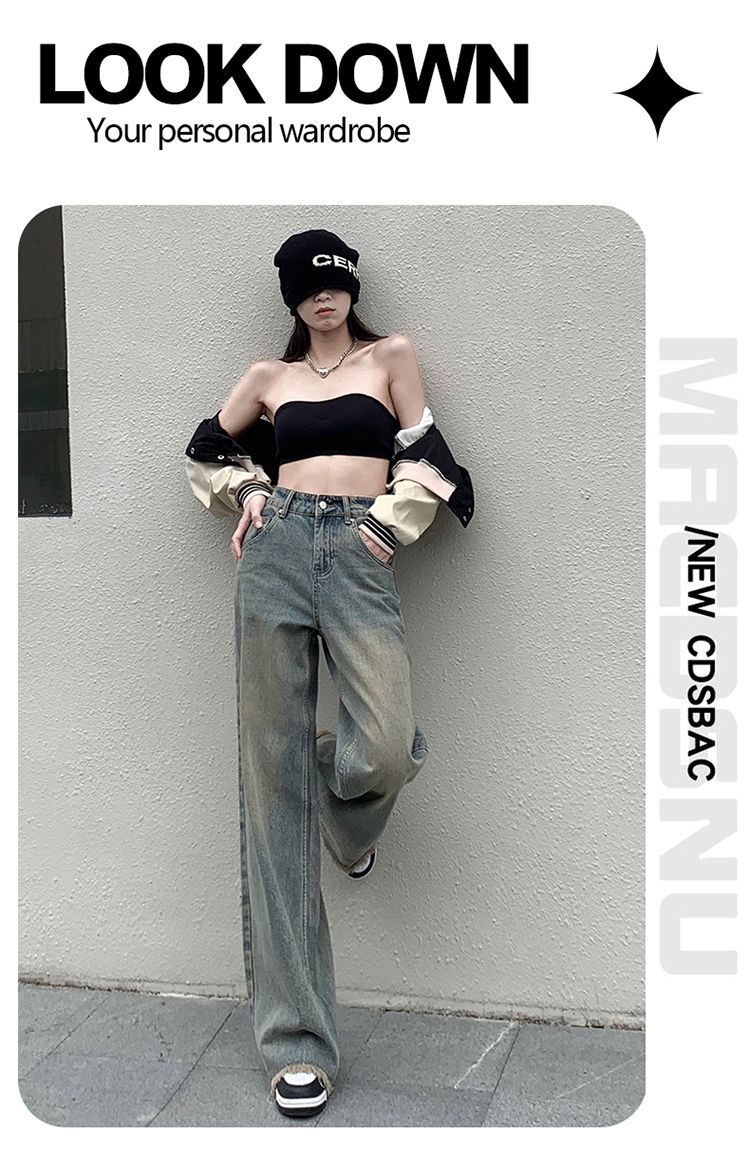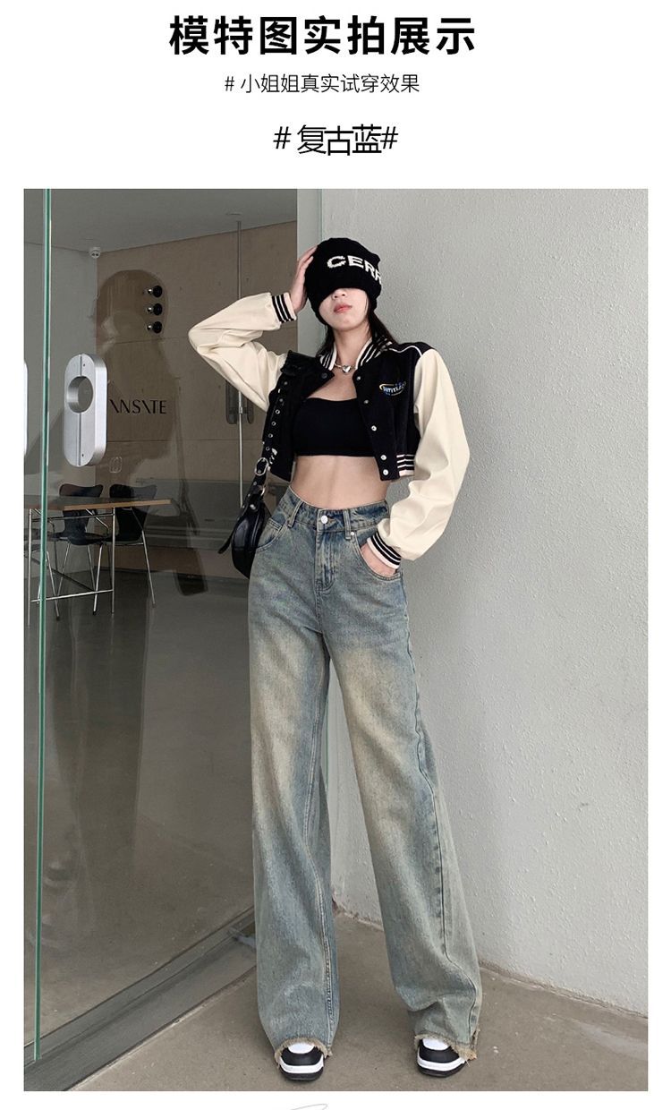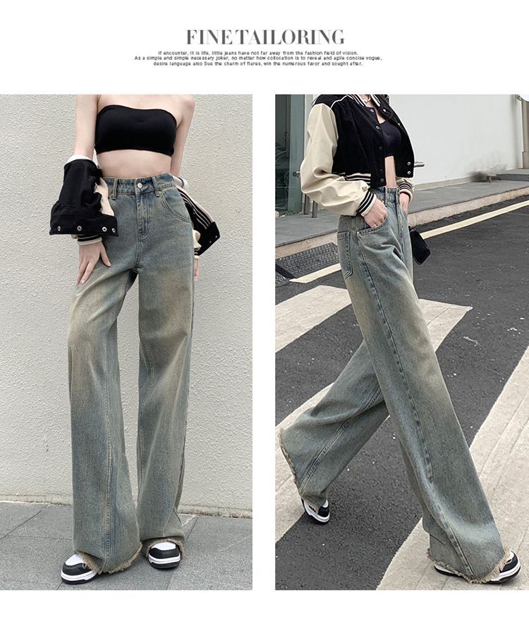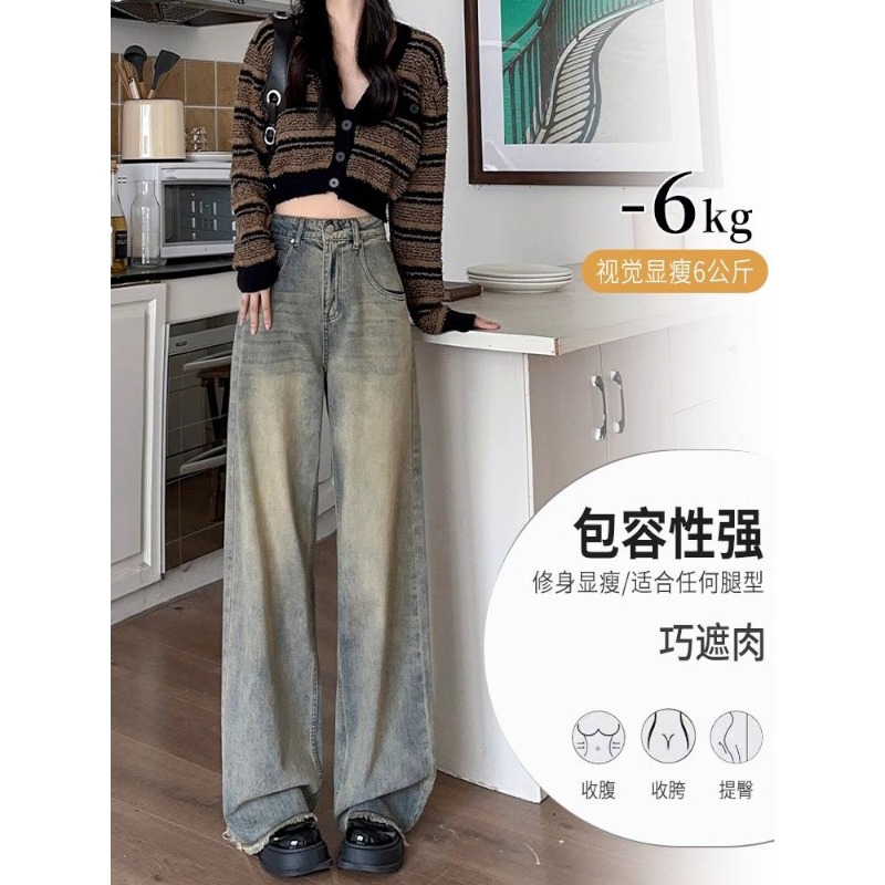 노란색 머드 컬러 레트로 향수를 불러 일으키는 넓은 다리 청바지 여성의 가을과 겨울 루즈 높은 허리 슬림 느슨한 플러스 사이즈 스트레이트 바지스토어 가기