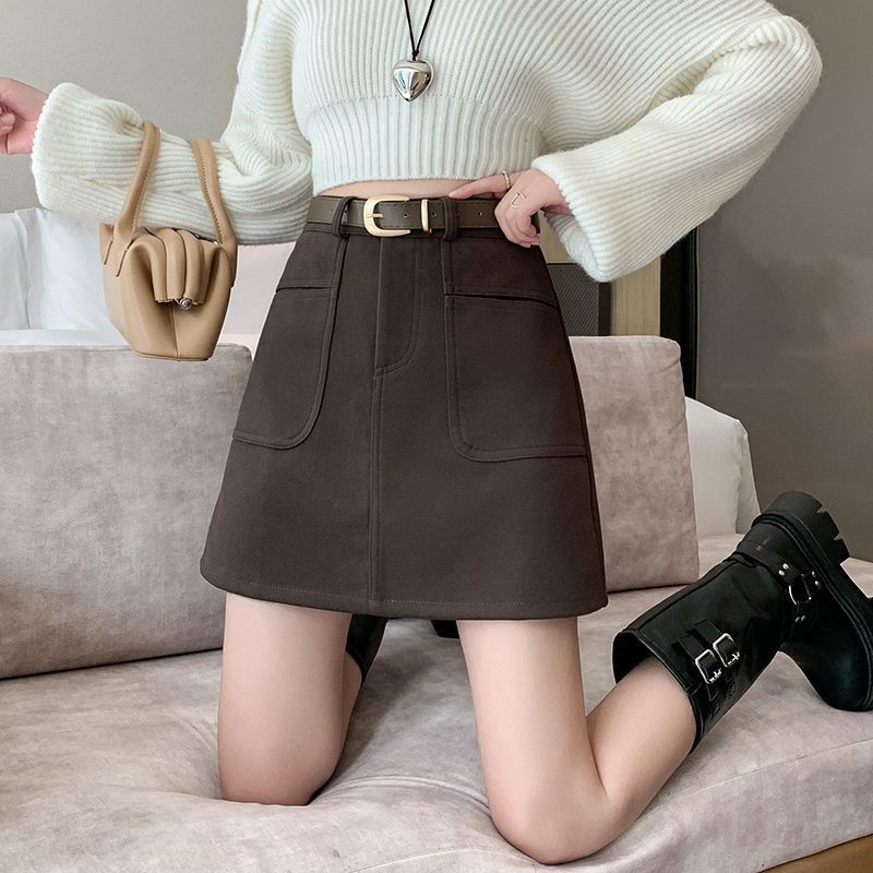 다크 브라운 양모 더블 포켓 스커트 가을과 겨울 여성의 새로운 높은 허리 슬리밍 폭발성 엉덩이 스커트스토어 가기