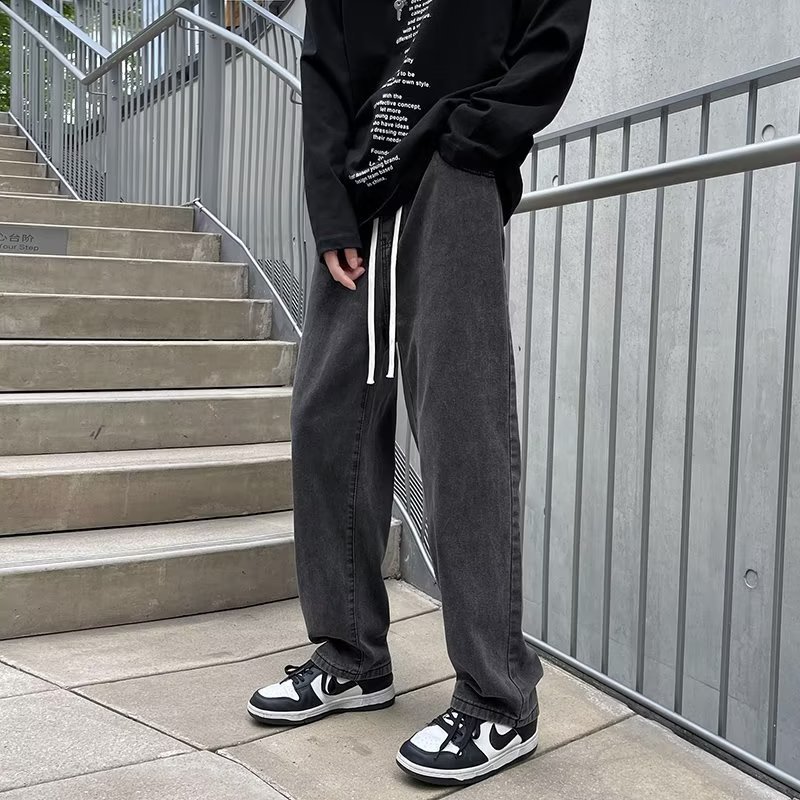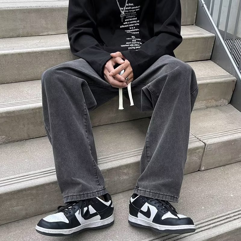 검은 회색 청바지 남자 봄 2024 새로운 느슨한 직선 바지 유행 브랜드 하이 스트리트 바이브 바람 바지 남자