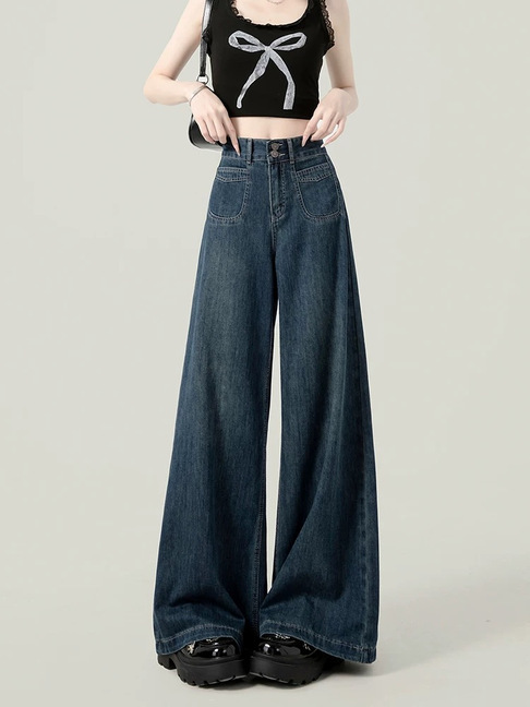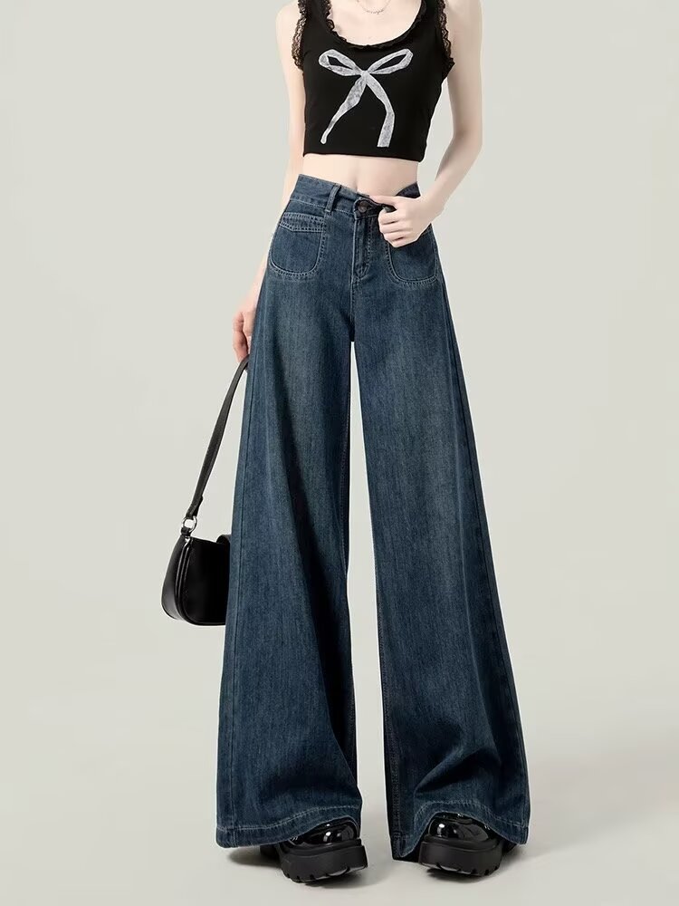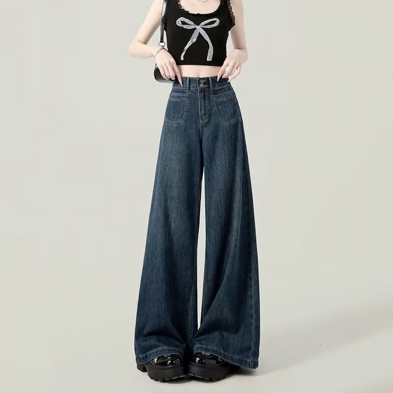 다크 블루 넓은 다리 청바지 여성의 2024 새로운 캐주얼 게으른 딥핑 봄과 가을을위한 느슨한 슬리밍 스트레이트 팬츠