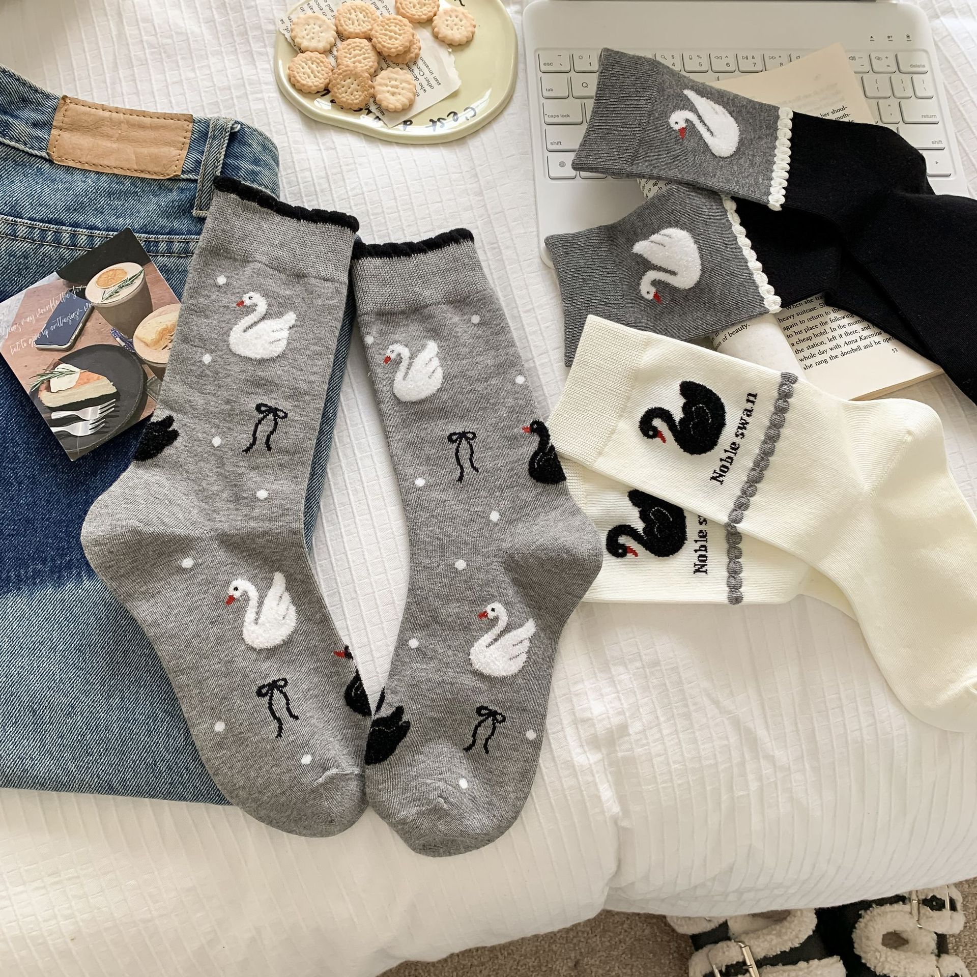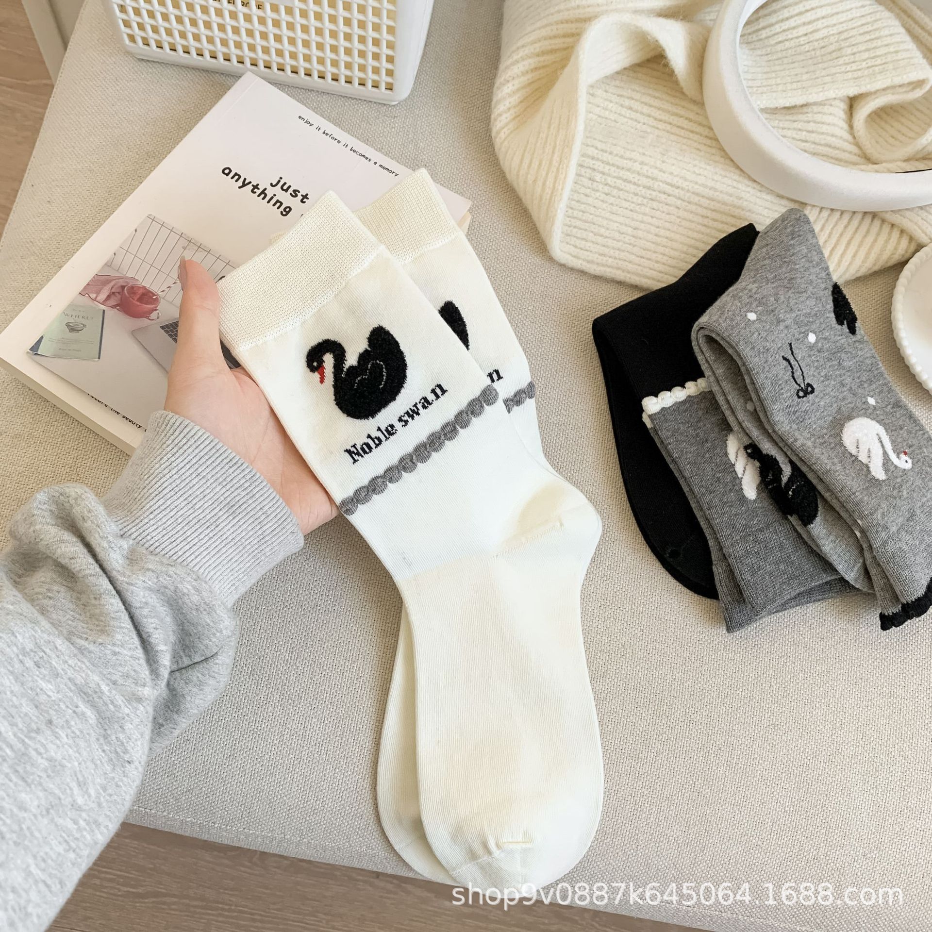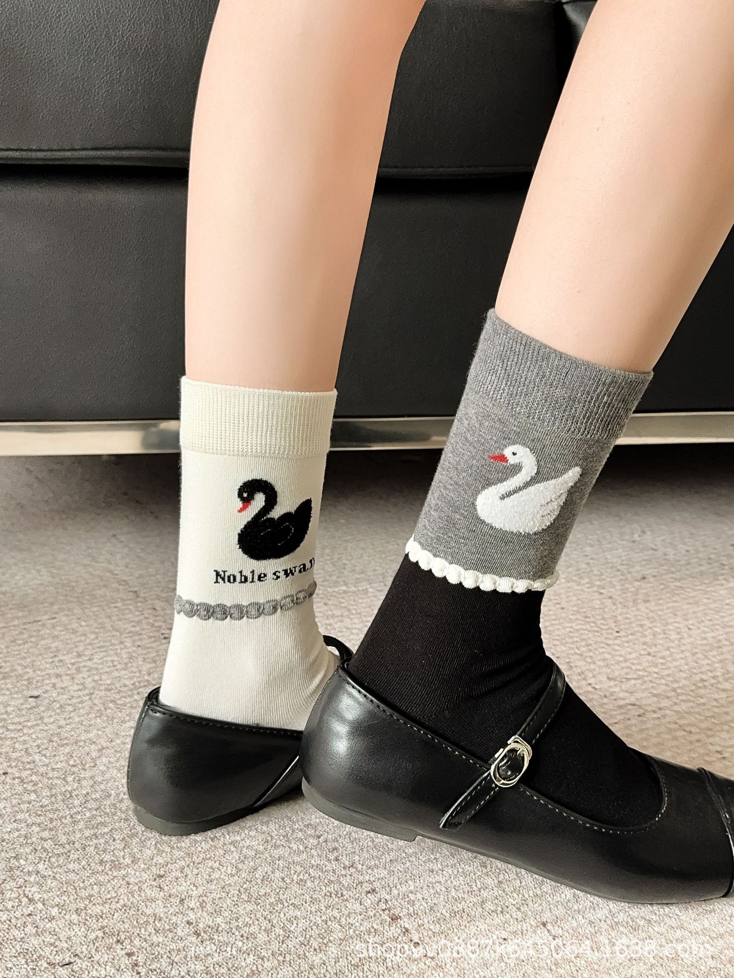 흑인과 백인 백조의 잠금한 양말 여성 만화 빗질 코튼 중순 가을과 겨울 중추절 인터넷 인기 Ins 트렌디 한 Collocation 작은 가죽 신발스토어 가기