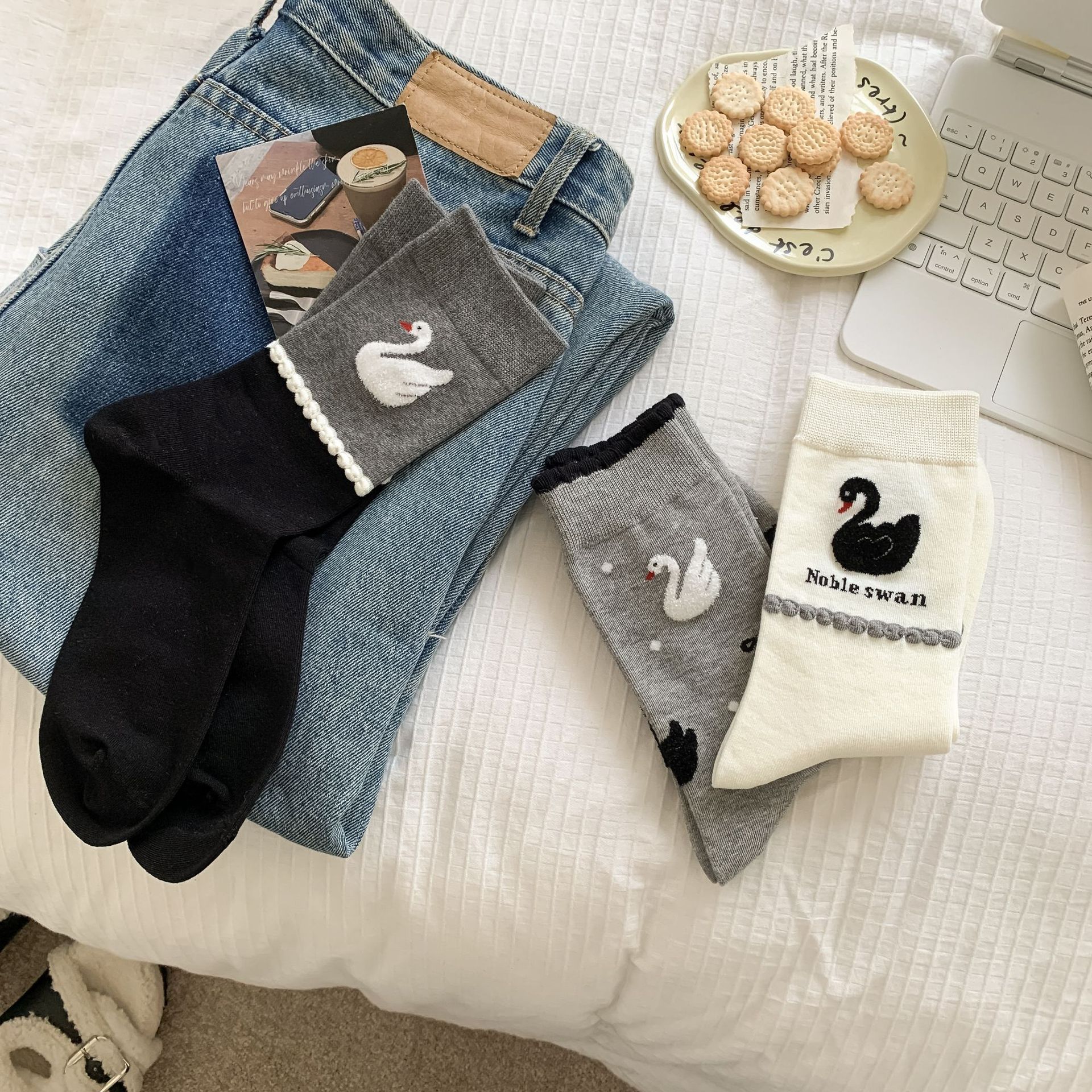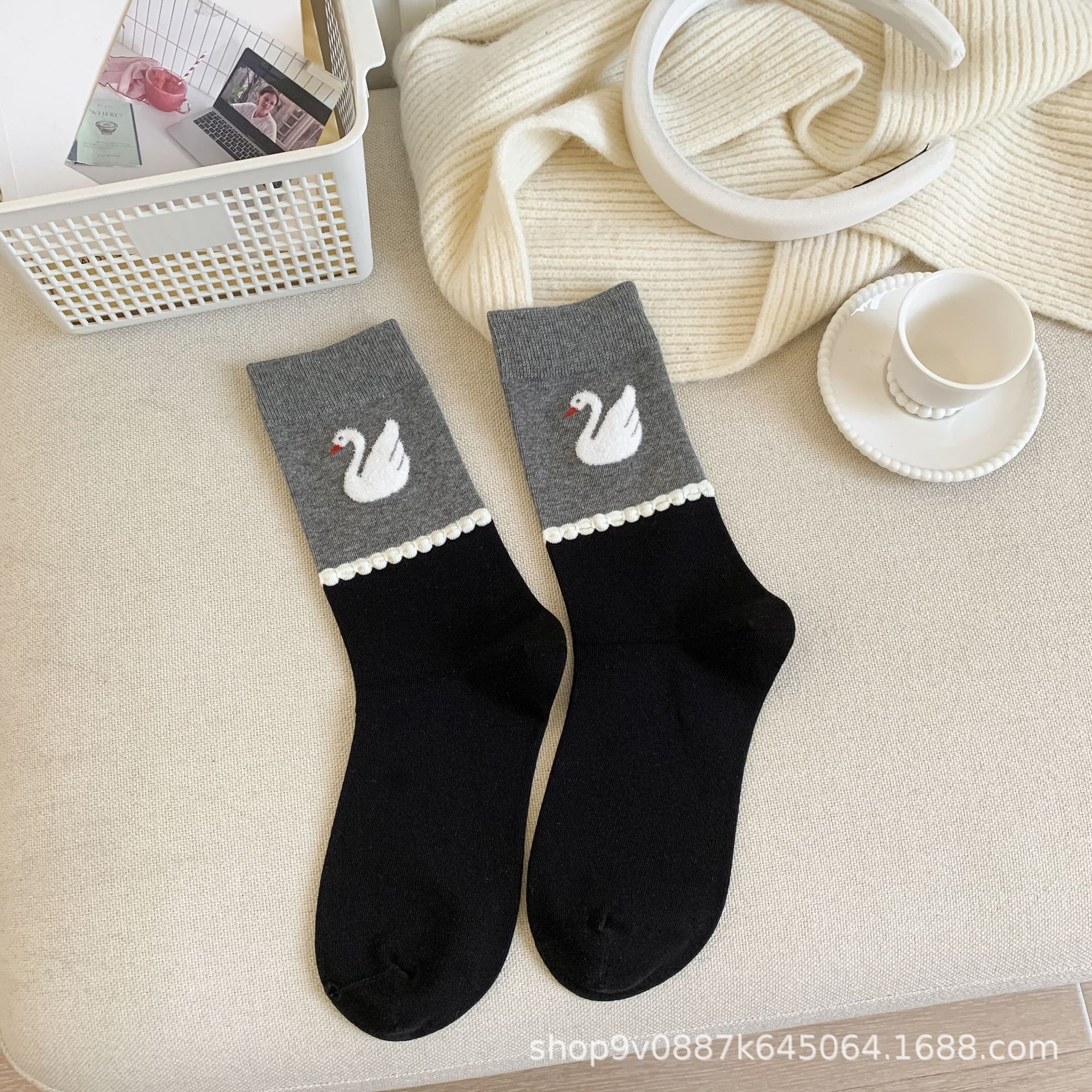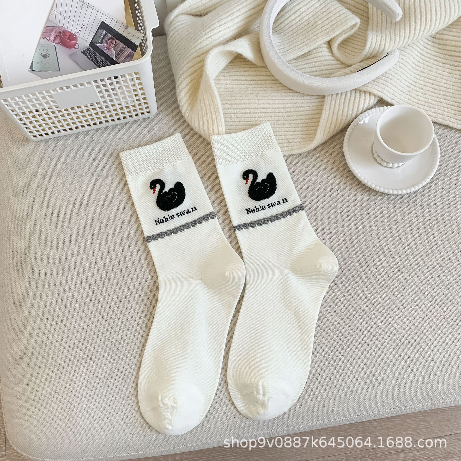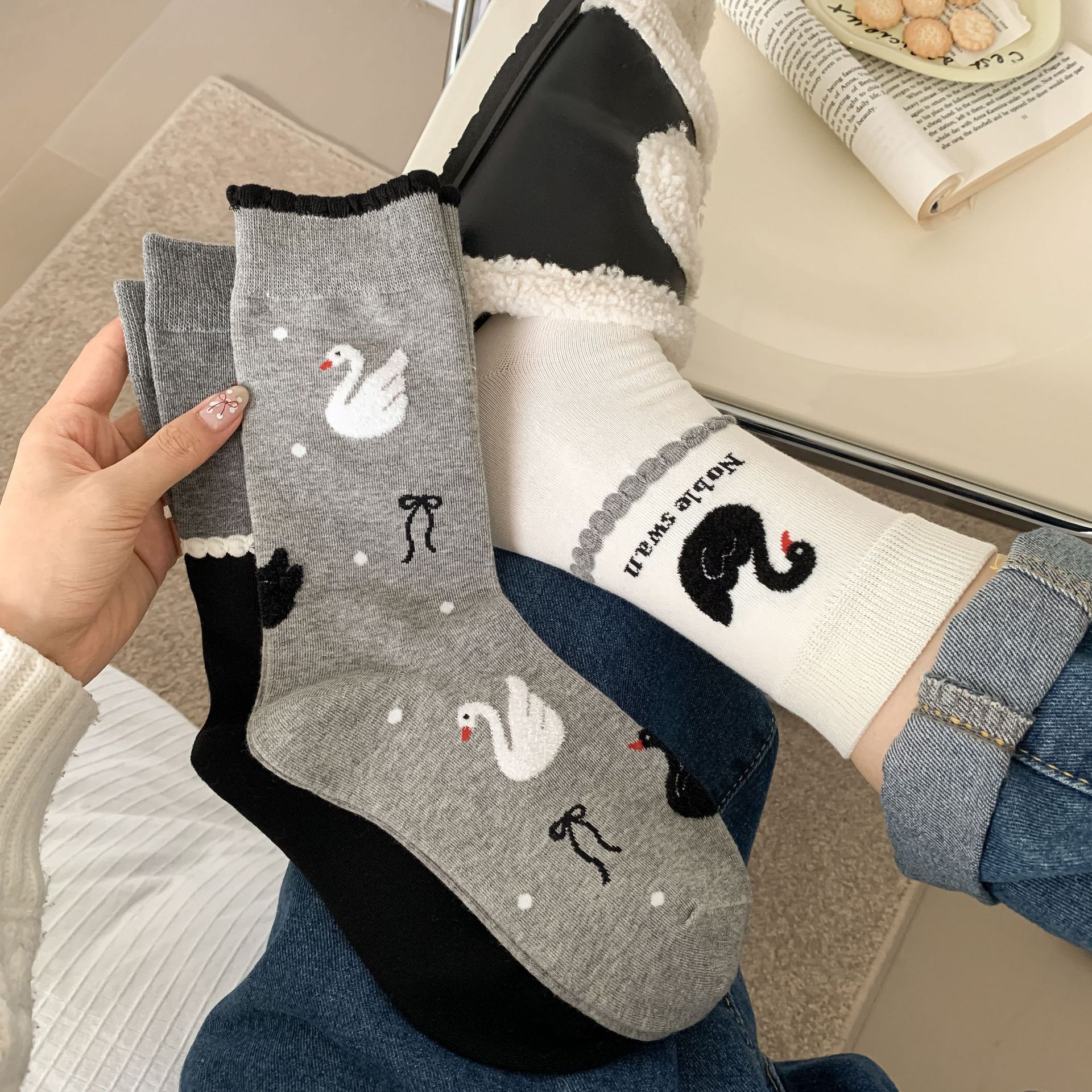 흑인과 백인 백조의 잠금한 양말 여성 만화 빗질 코튼 중순 가을과 겨울 중추절 인터넷 인기 Ins 트렌디 한 Collocation 작은 가죽 신발스토어 가기