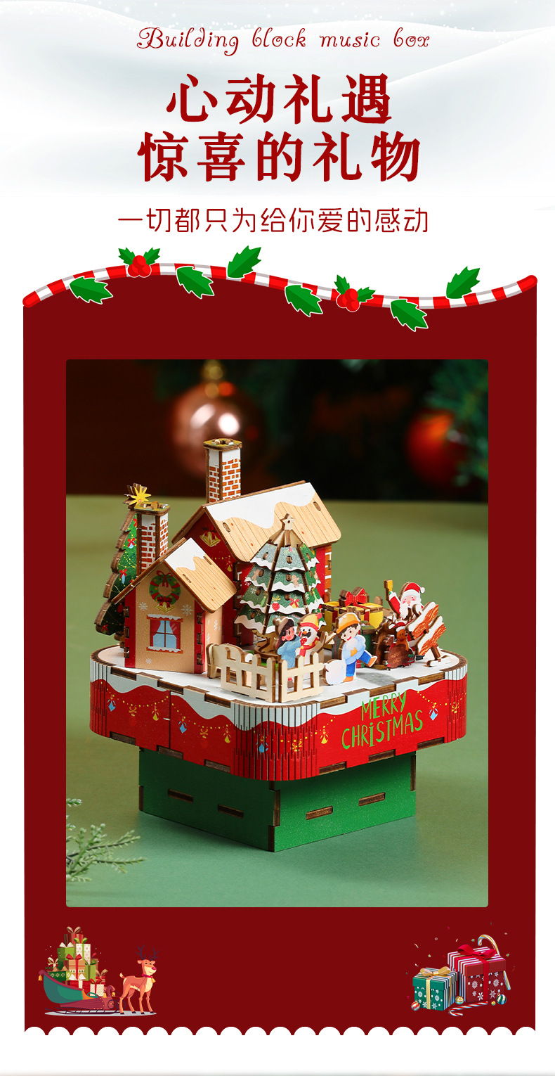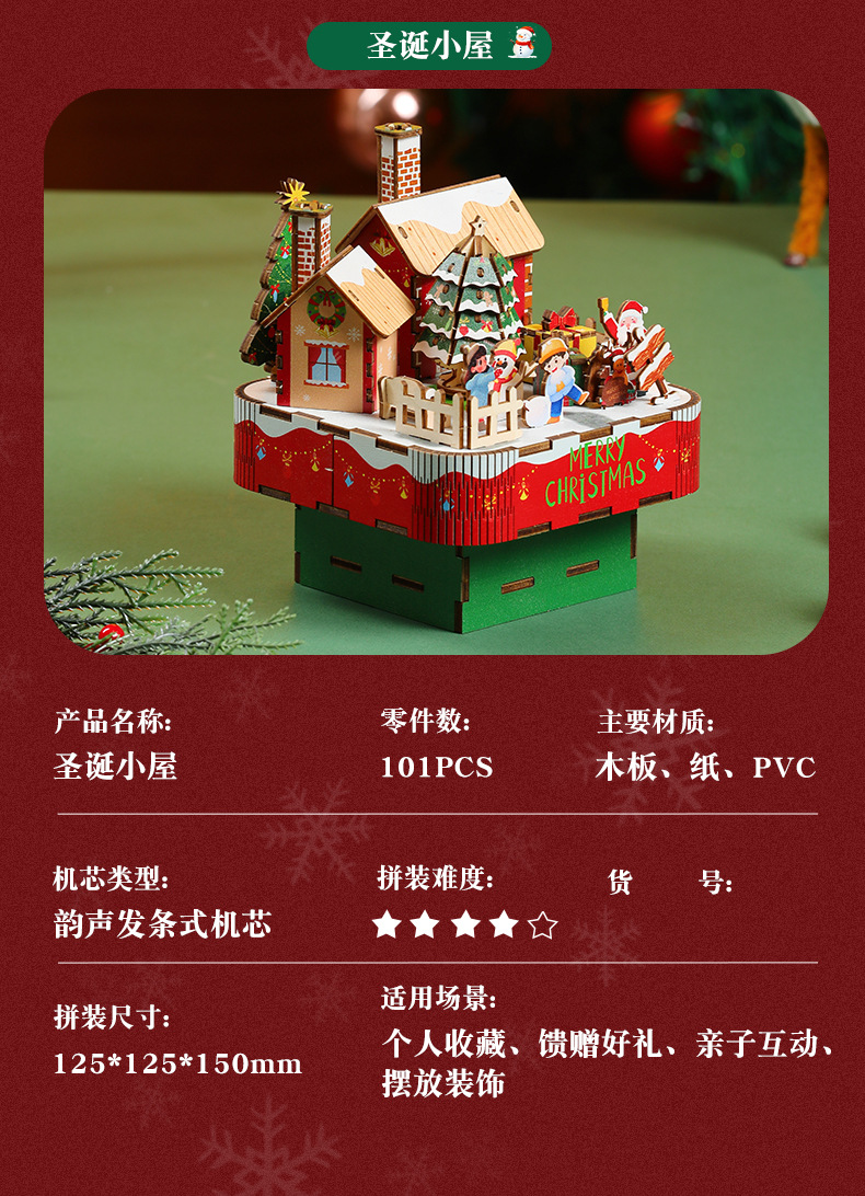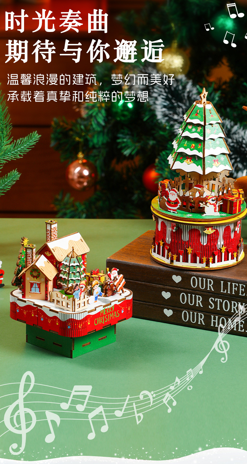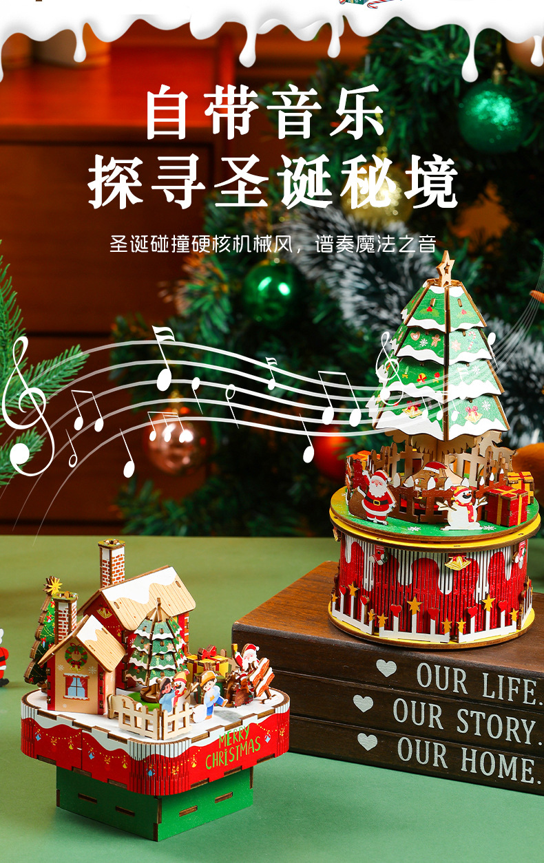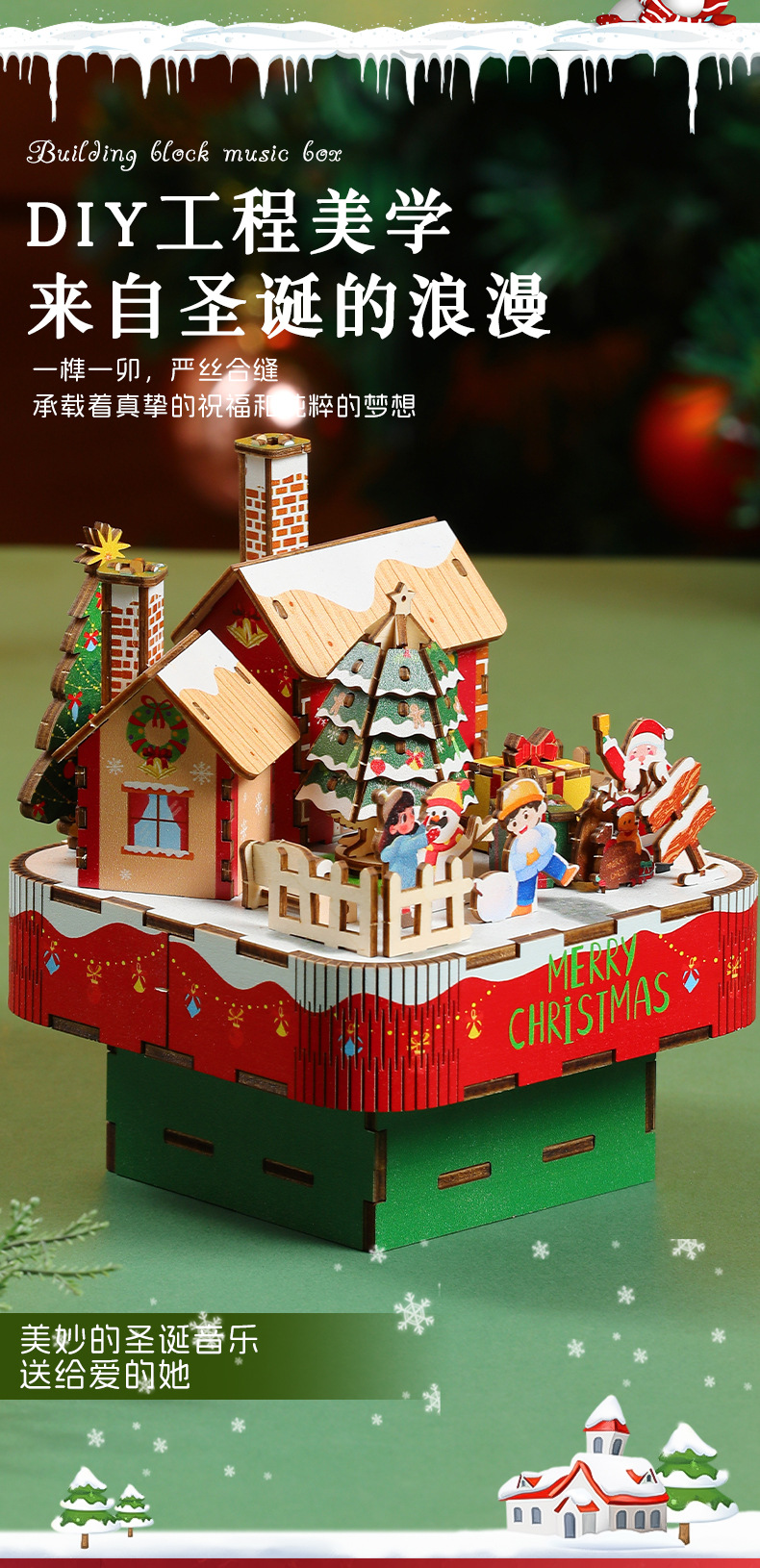 나무 퍼즐 뮤직 박스 크리스마스 캐빈 3D 수제 미니 모델 장식 선물 국경 퍼즐 장난감스토어 가기