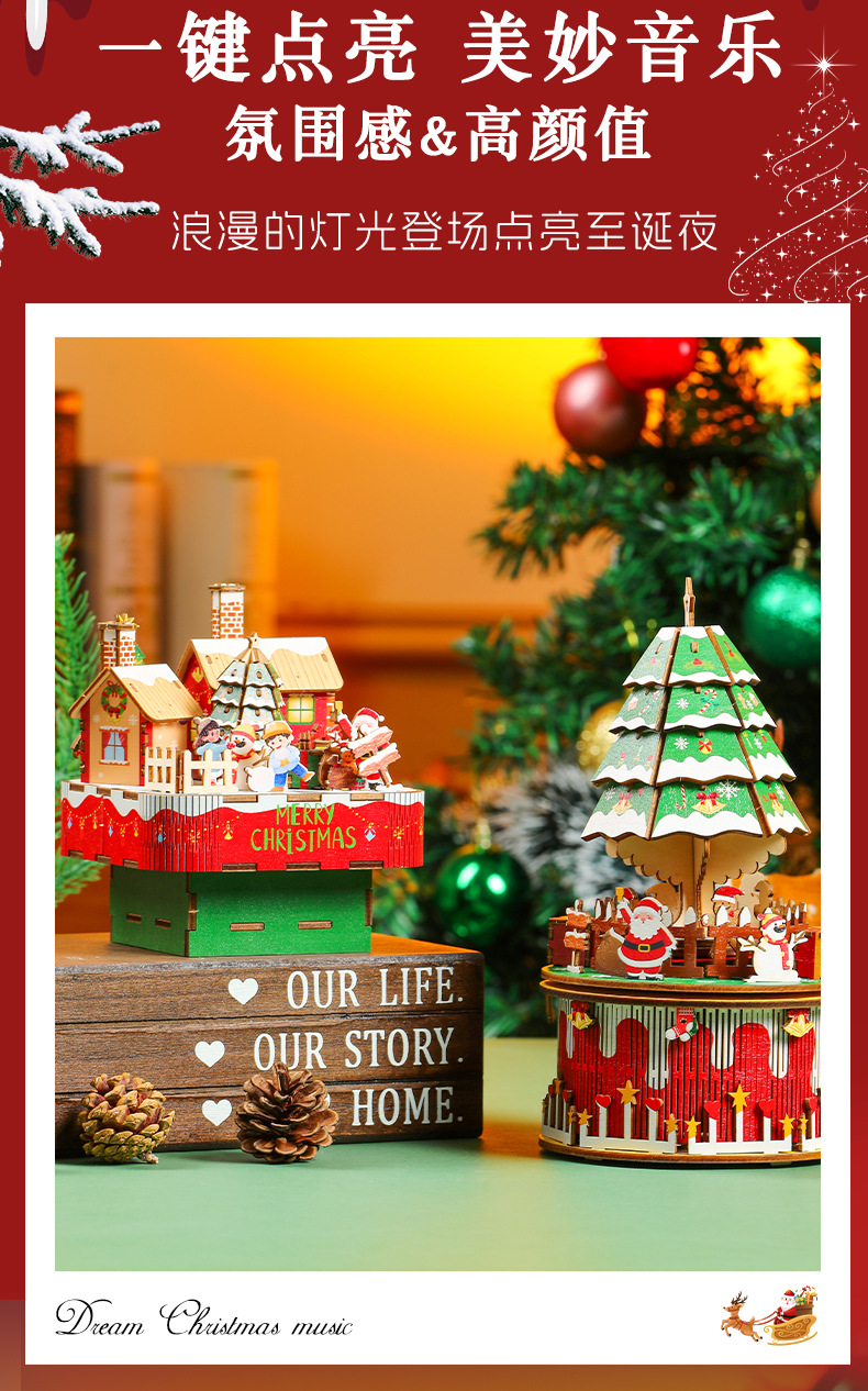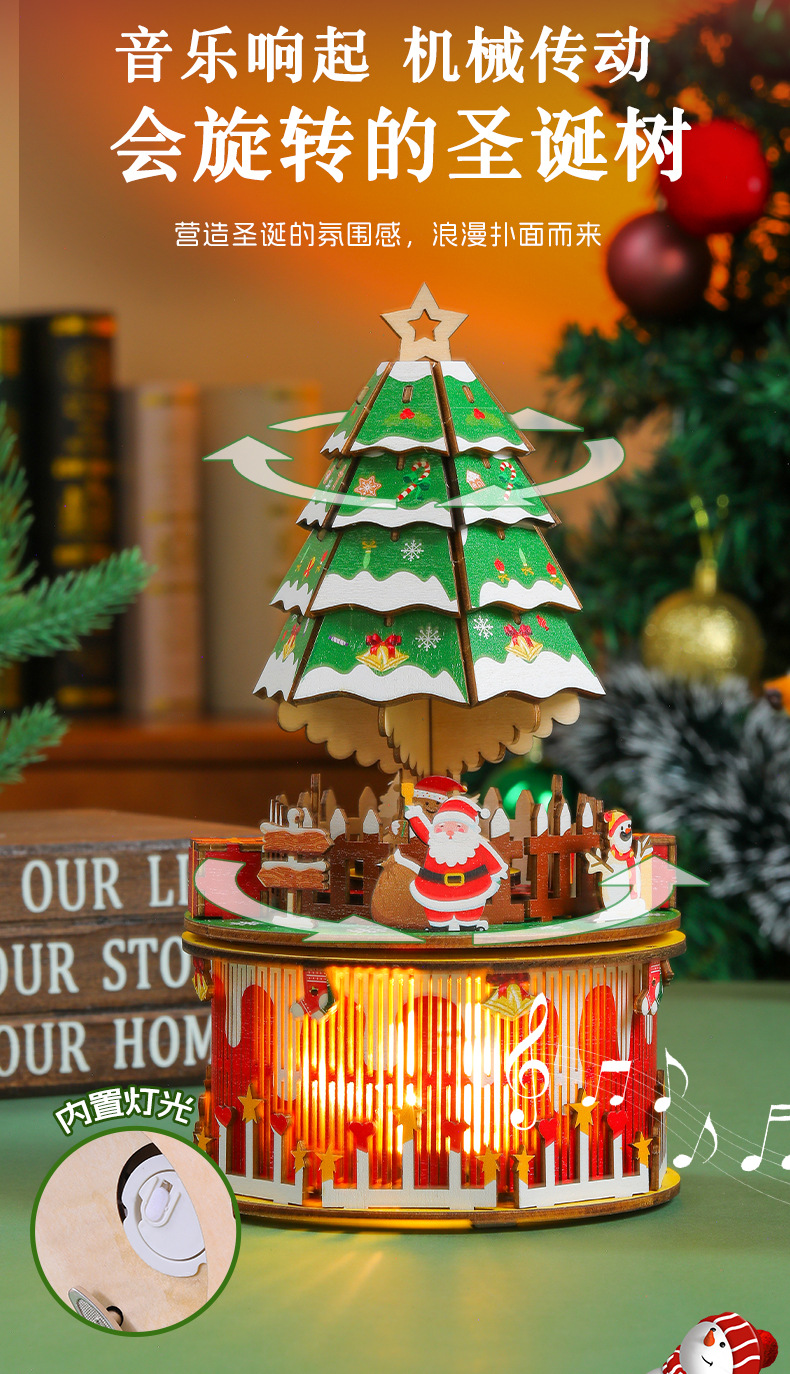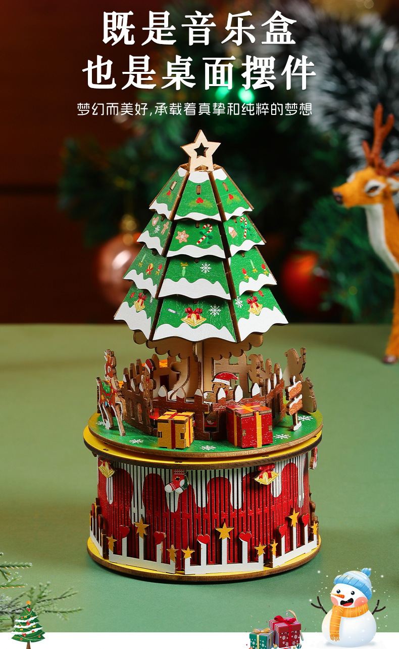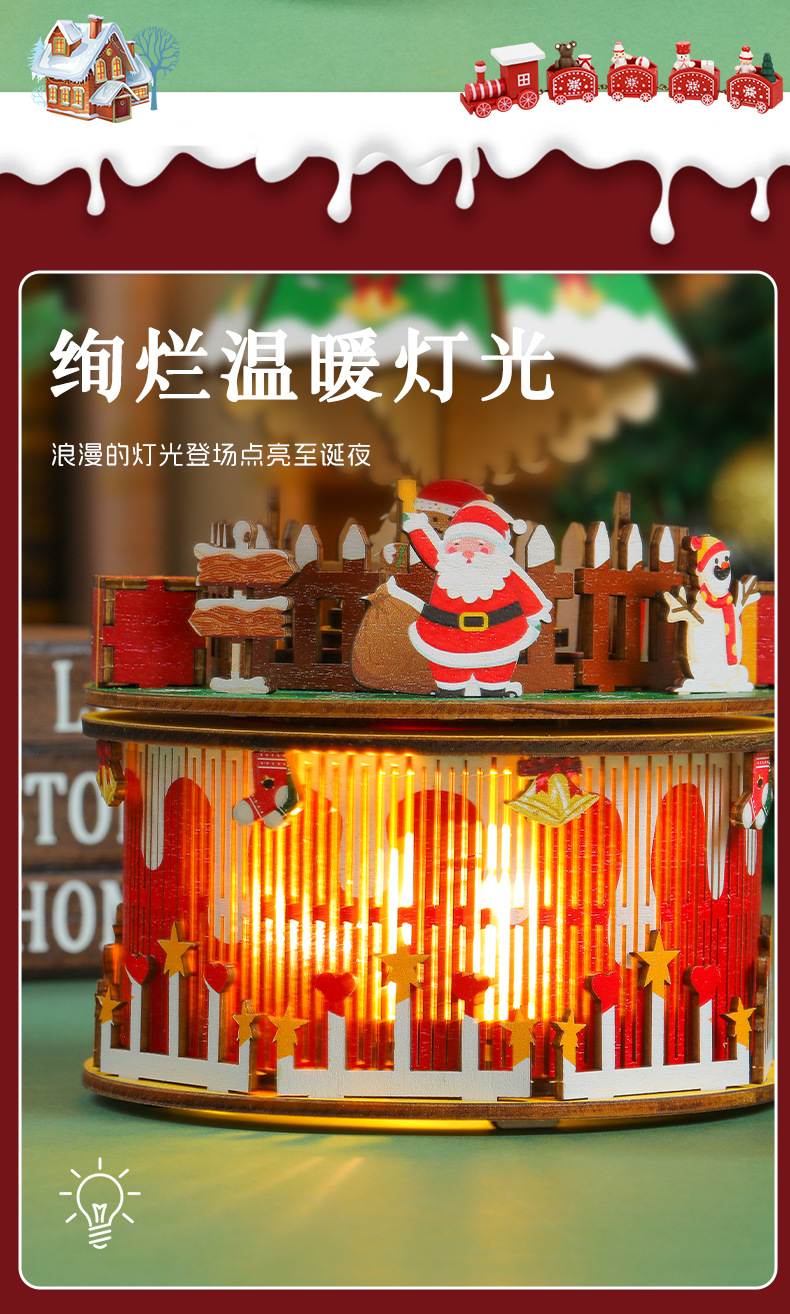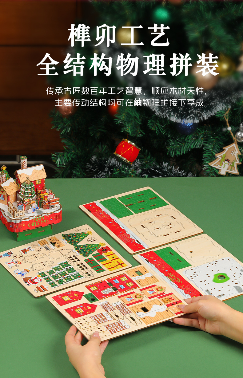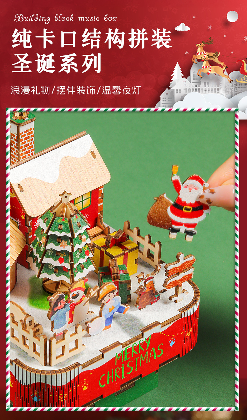 나무 퍼즐 뮤직 박스 크리스마스 캐빈 3D 수제 미니 모델 장식 선물 국경 퍼즐 장난감스토어 가기