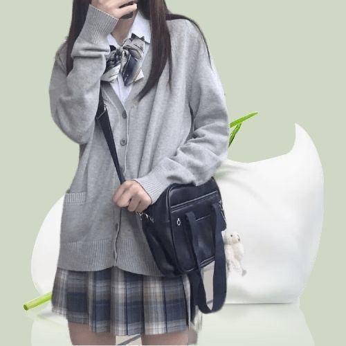 • 라이트 그레이 스웨터 + 차콜 그레이 체크 스커트 + 나비넥타이 + 긴팔 셔츠