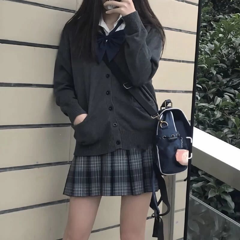 • 다크 그레이 스웨터 + 차콜 그레이 체크 스커트 + 나비넥타이 + 긴팔 셔츠