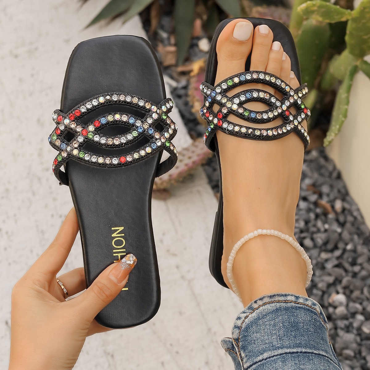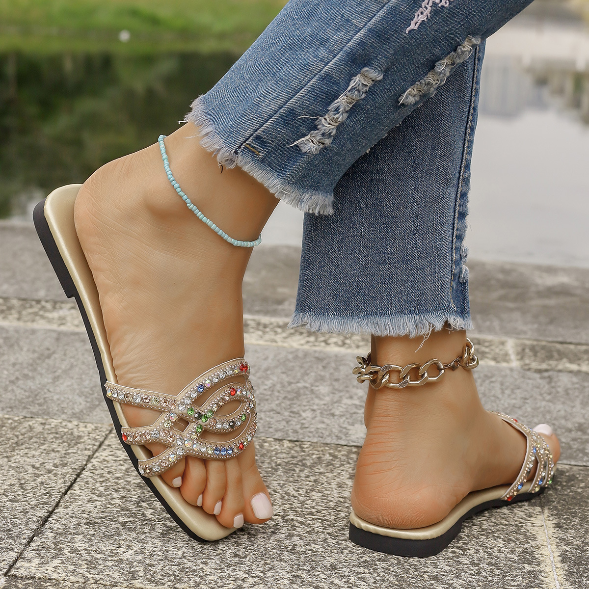 국경 간 플러스 사이즈 플랫 샌들 및 슬리퍼 여성용 여름 아우터웨어 2024 새로운 스타일 스퀘어 헤드 라인스톤 비치 슬리퍼