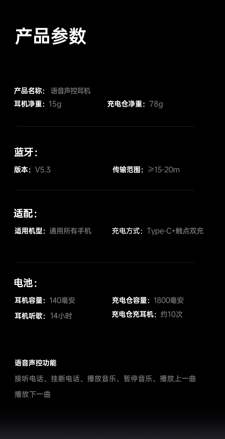 • 흰색 단일 귀 + 충전 박스(음성 제어 + 등록)