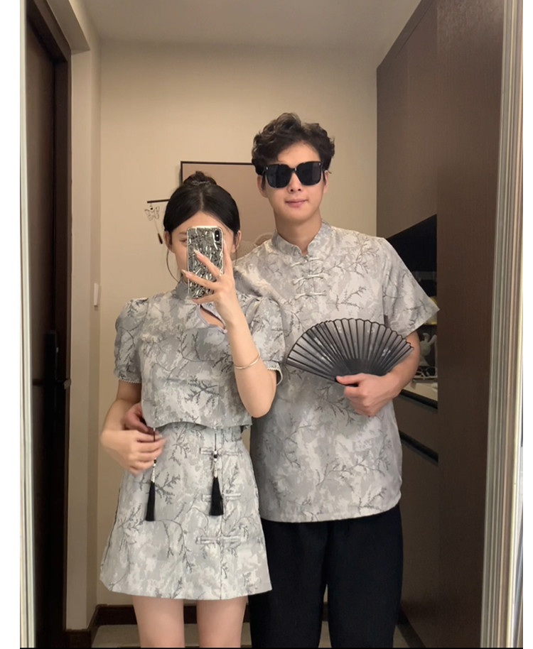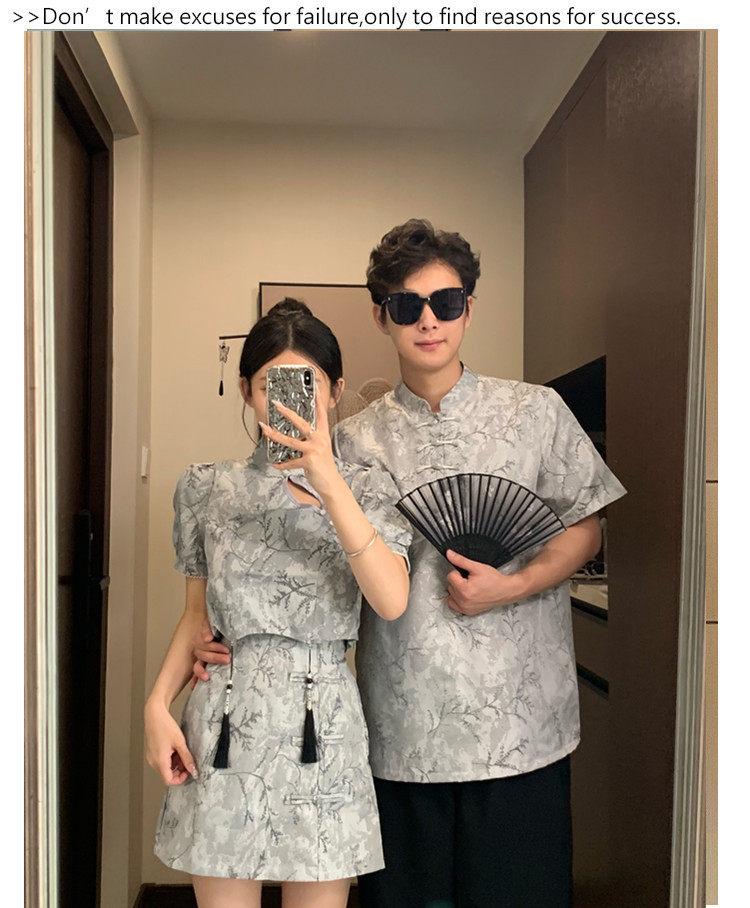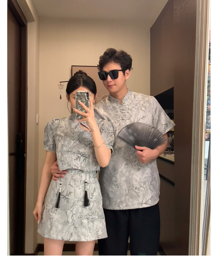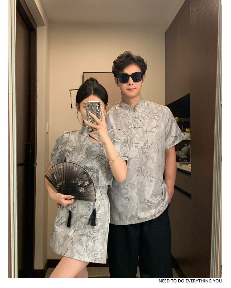 새로운 중국 스타일 국가 스타일 새로운 여름 개선 된 플레이트 버튼 컬러 청삼 여성용 반팔 스커트 인테리어 스탠드 칼라 탑스토어 가기