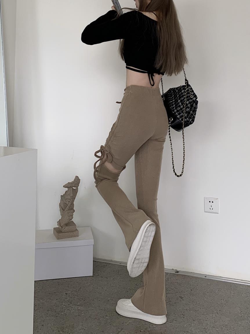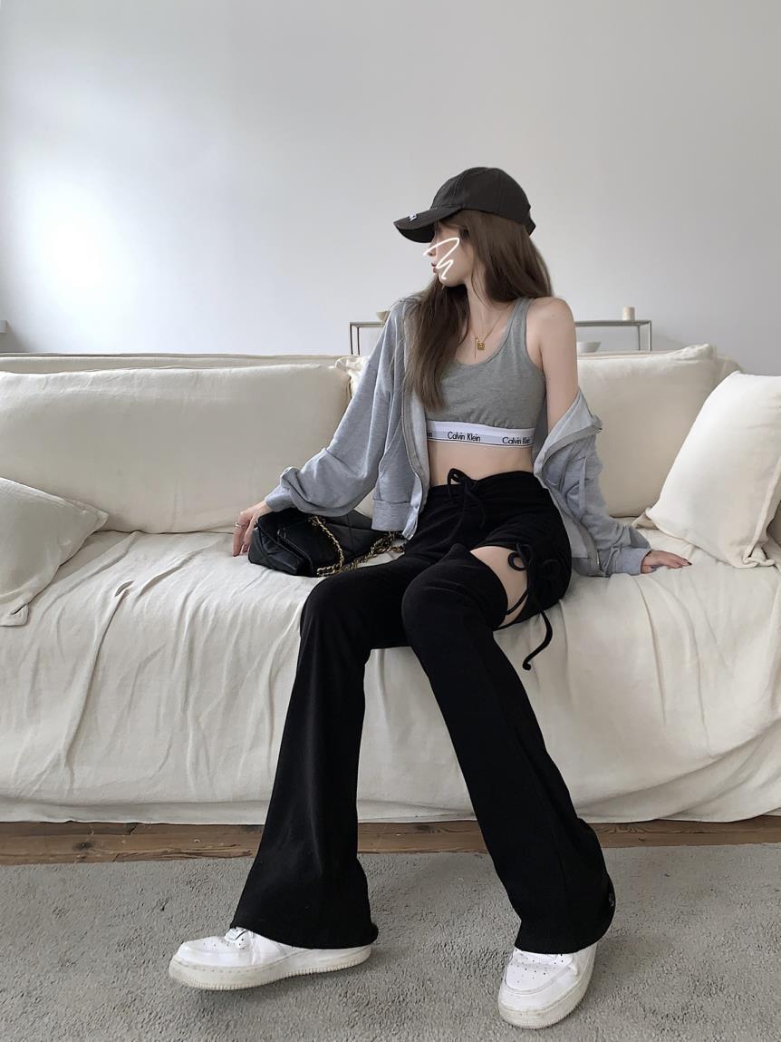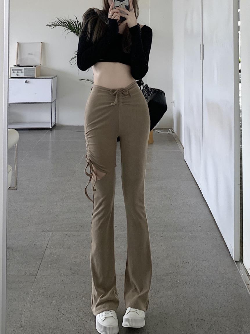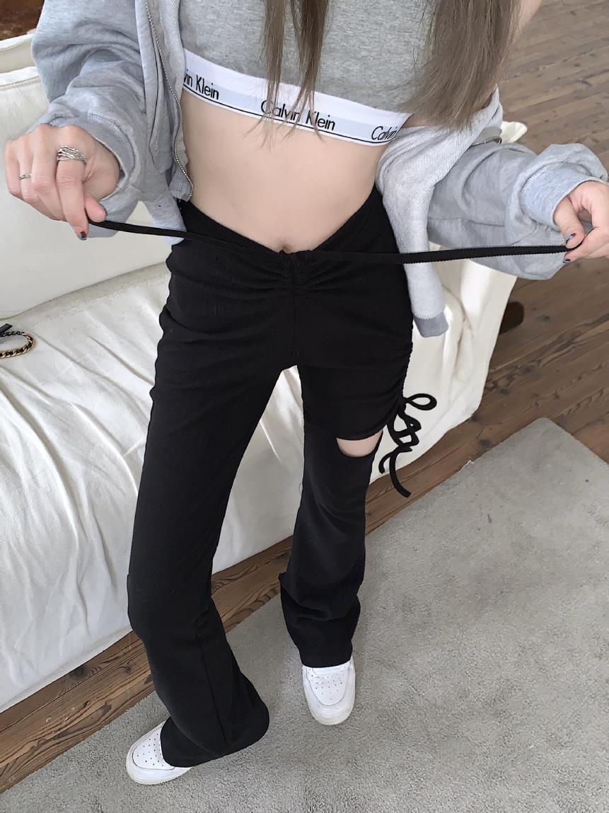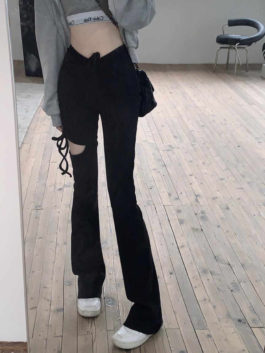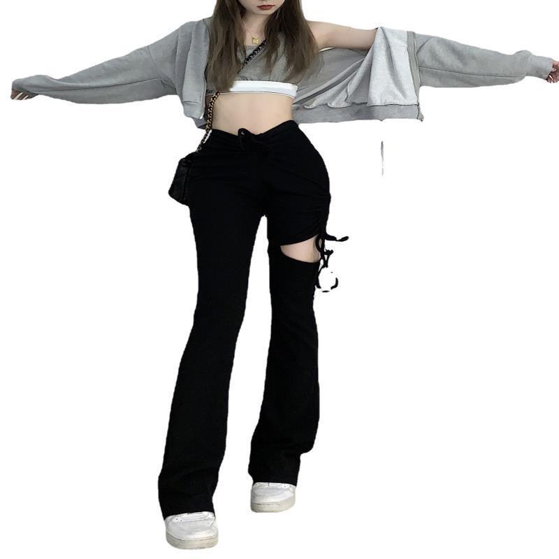 블랙 드로우 스트링 중공 캐주얼 바지 여성용 봄 높은 허리 디자인 센스 작은 발 마이크로 혼 바지스토어 가기