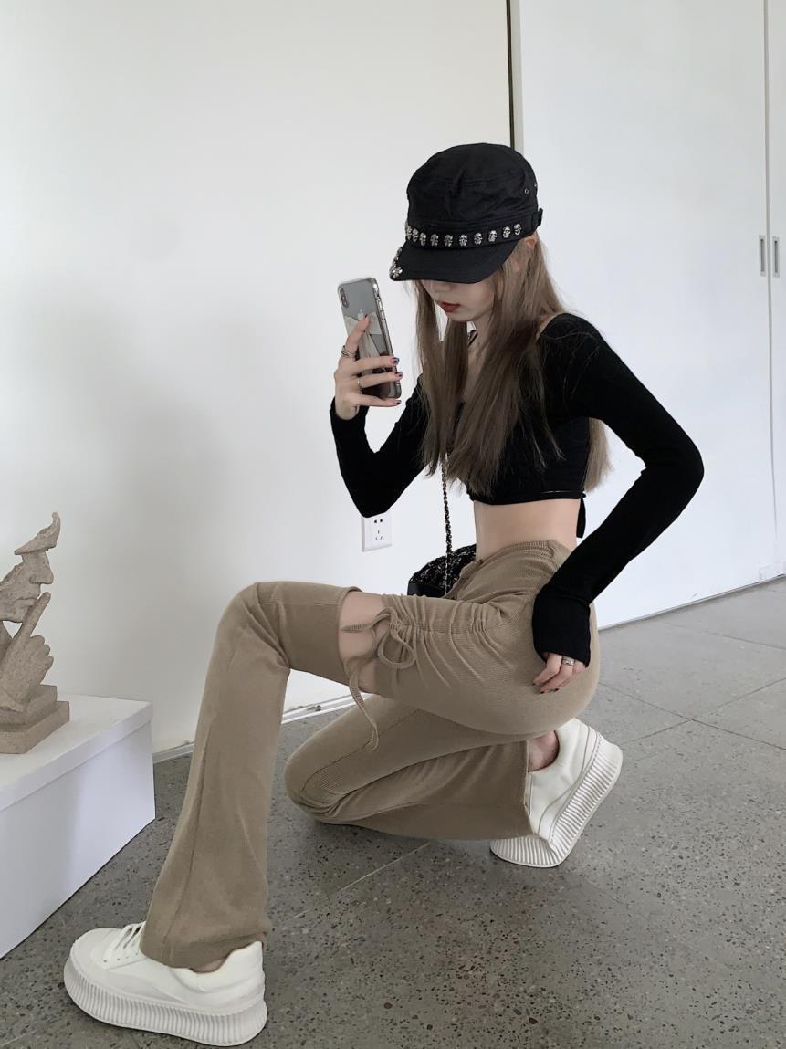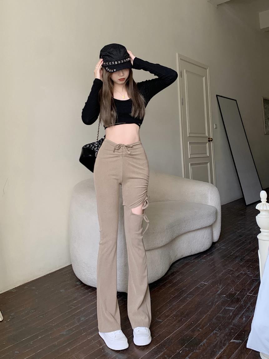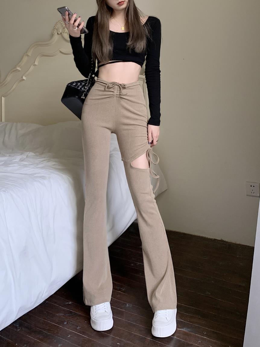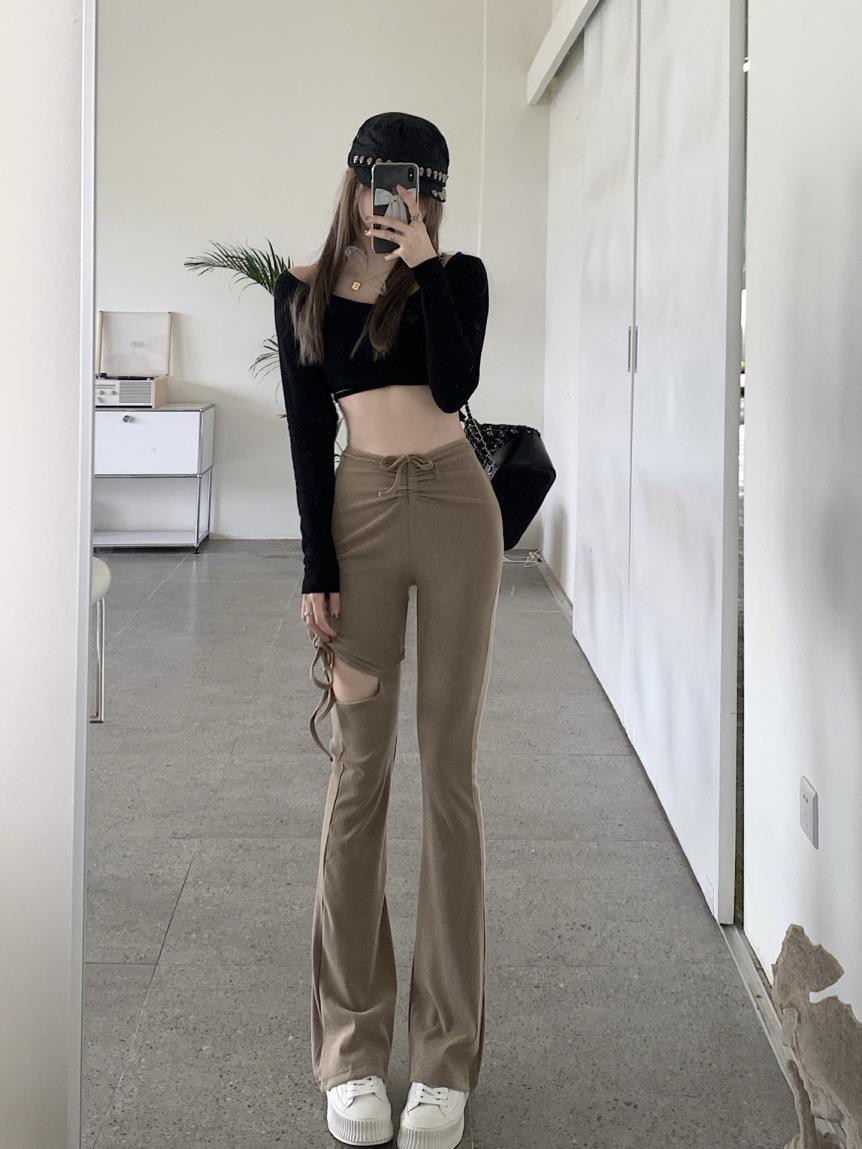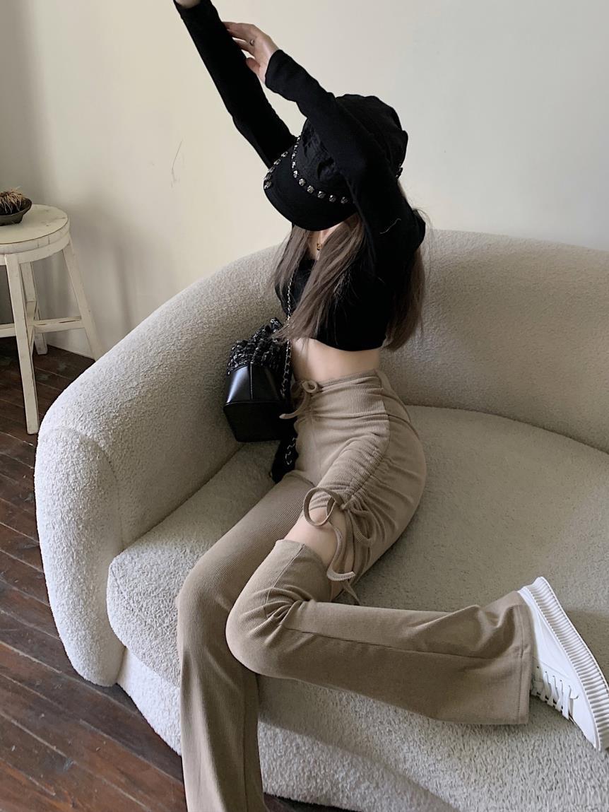 블랙 드로우 스트링 중공 캐주얼 바지 여성용 봄 높은 허리 디자인 센스 작은 발 마이크로 혼 바지스토어 가기