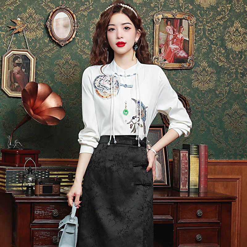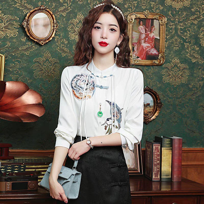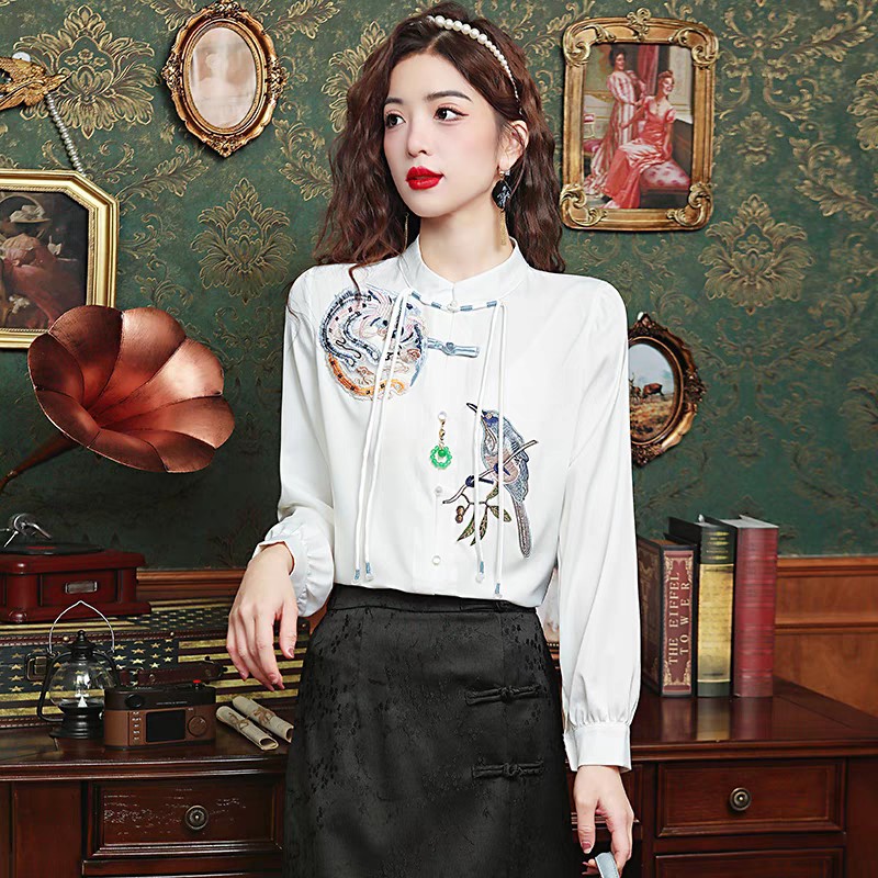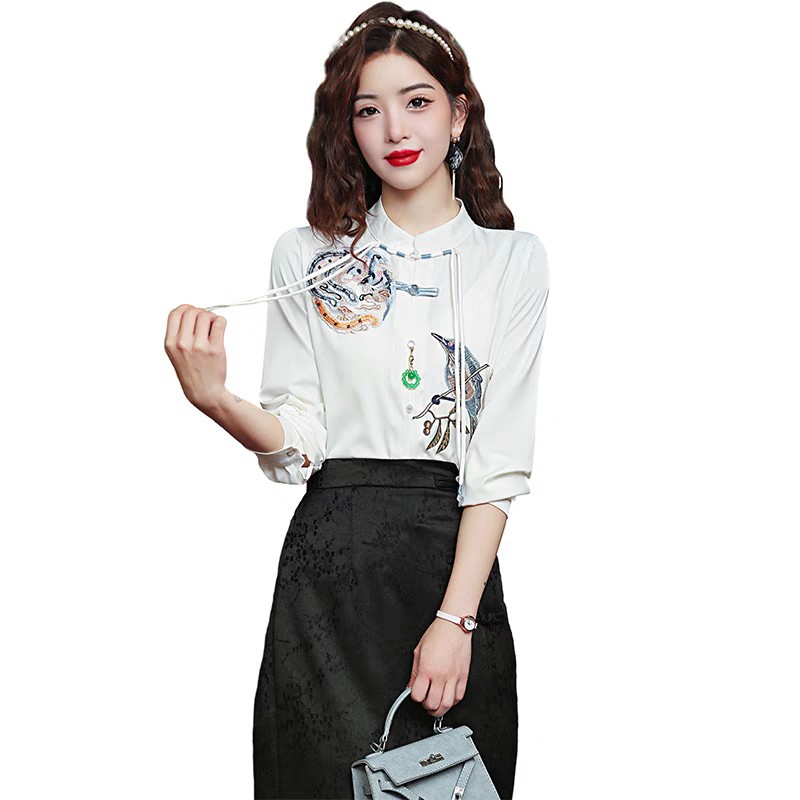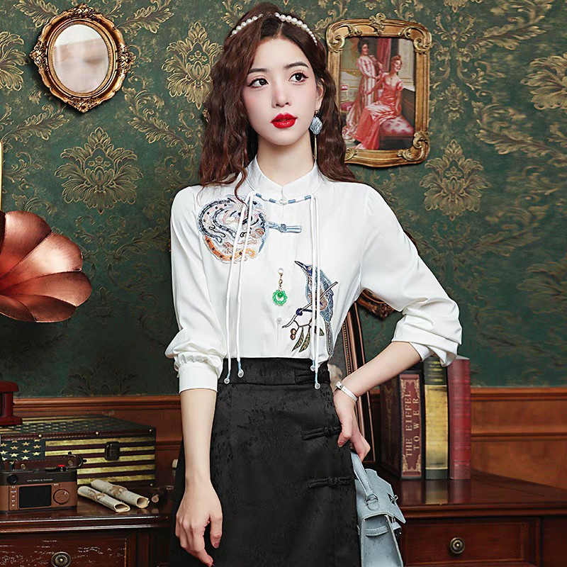중공업 새로운 중국 스타일 흰색 자수 셔츠 여성용 긴 소매 봄 새로운 쉬폰 작은 셔츠 국가 스타일 개선 당나라 원피스
