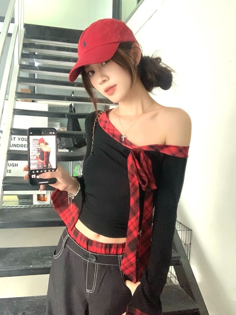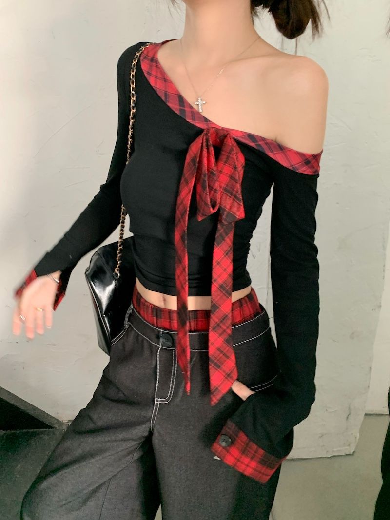 블랙 슬랜트 어깨 바느질 긴팔 티셔츠 여성용 가을과 겨울 봄 스파이스 소녀 중단 허리 슬림 핏 슬리밍 내부 쇼트 탑 트렌디