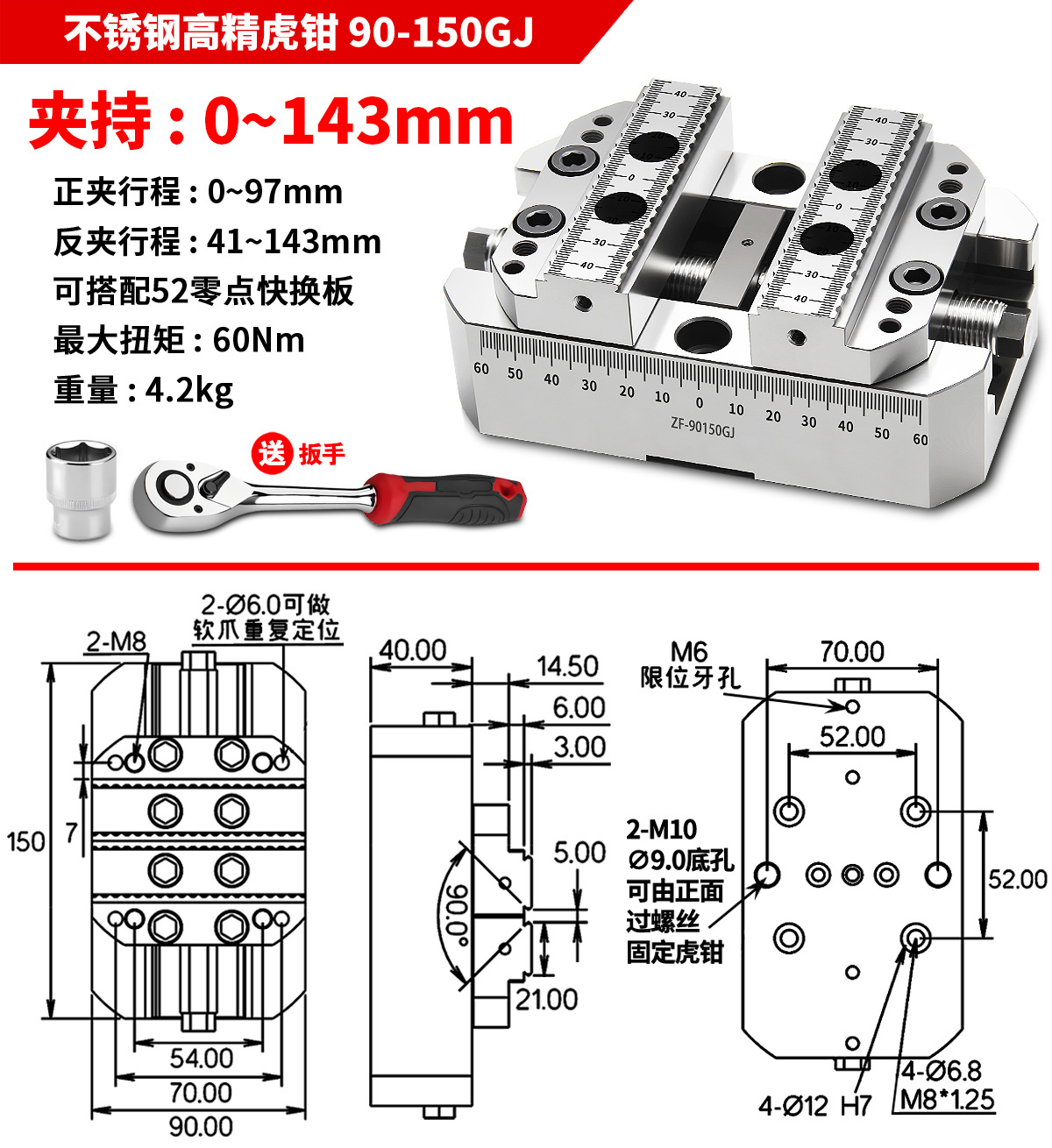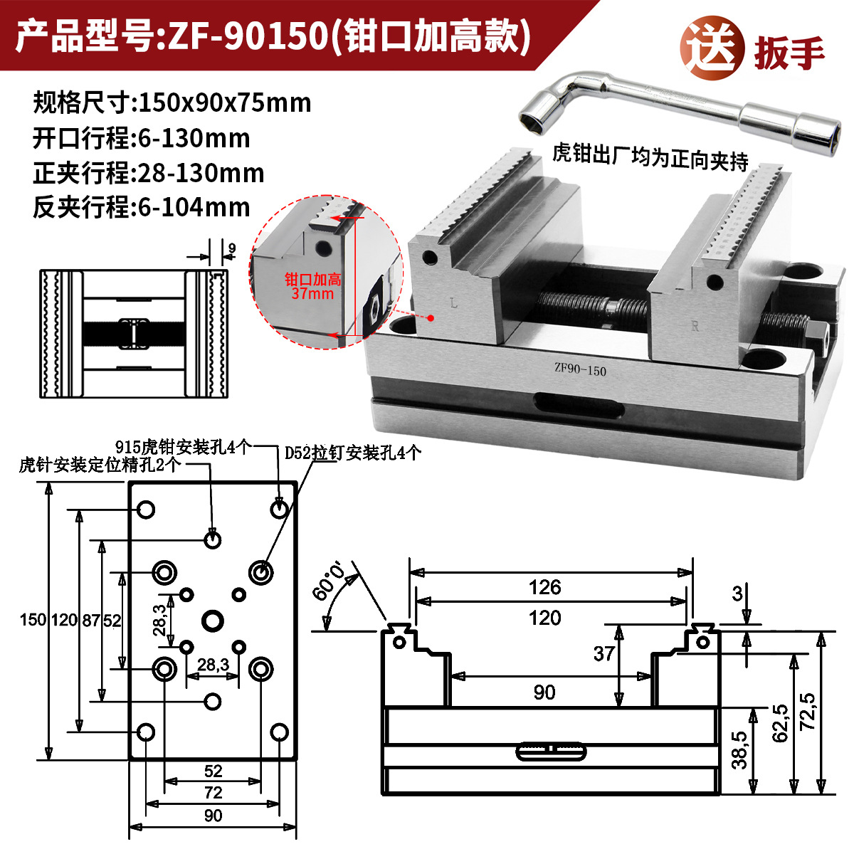 • ZF90-150 셀프 센터링 바이스, 37mm 높이 조절 가능
