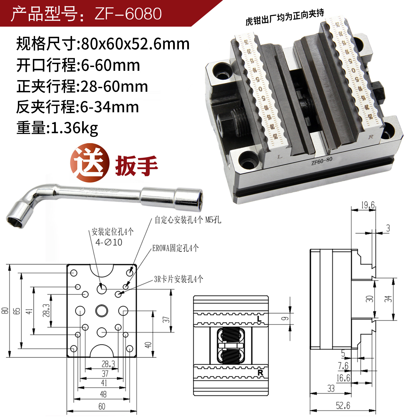 • ZF60-80 셀프 센터링 바이스, 37mm 높이 조절 가능