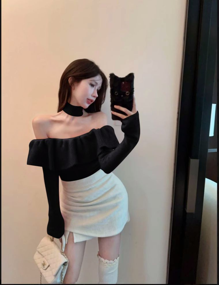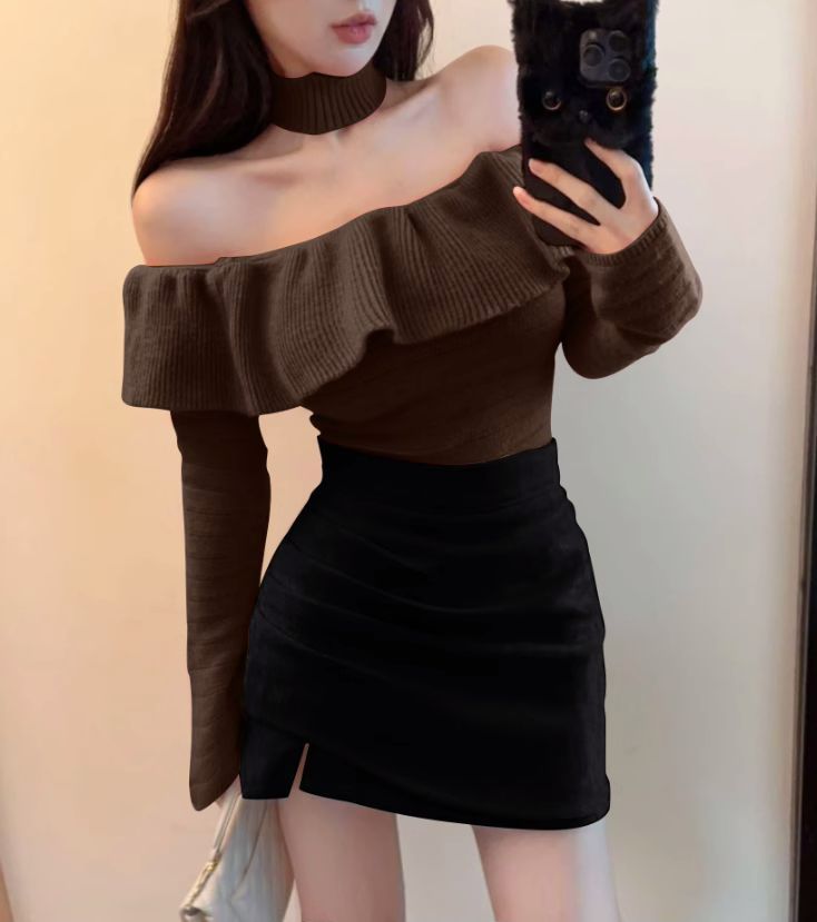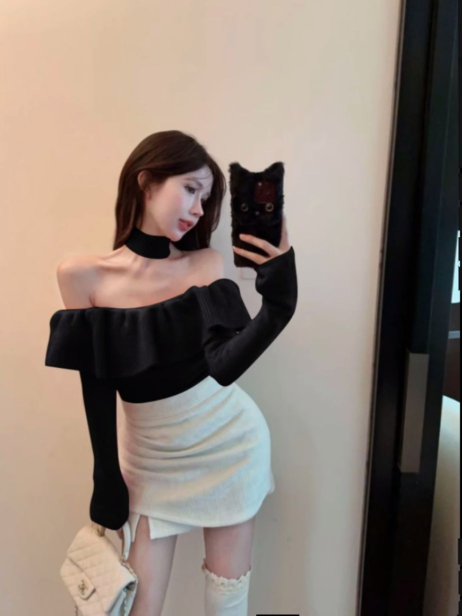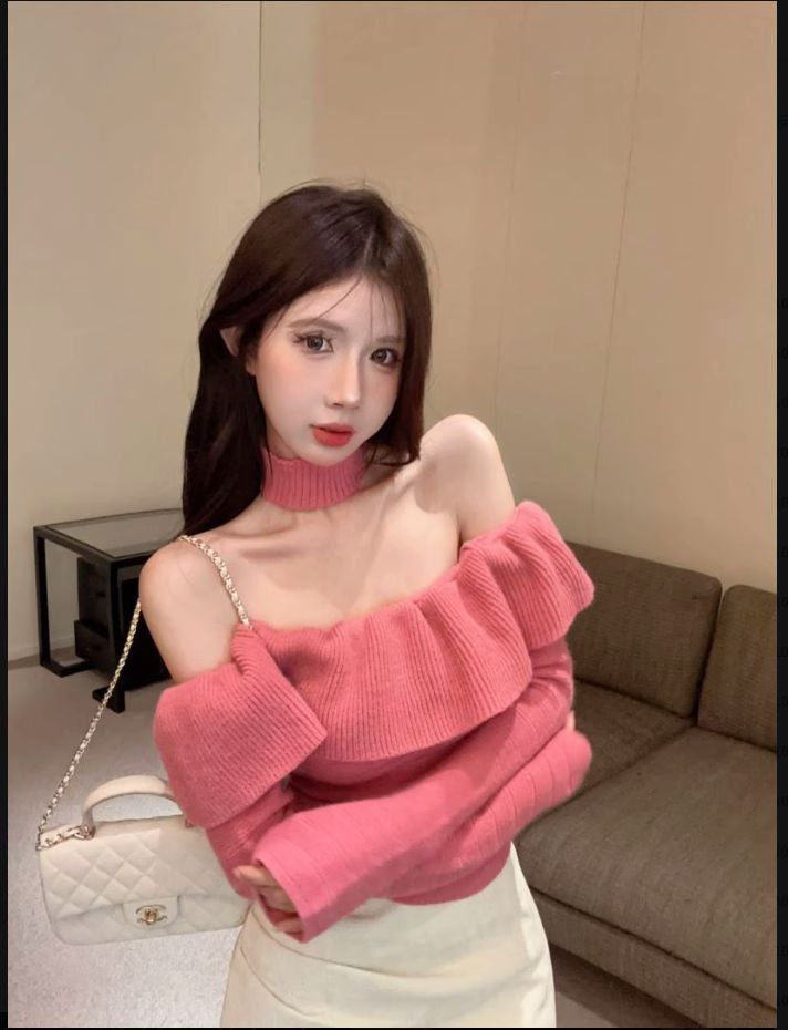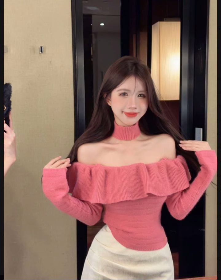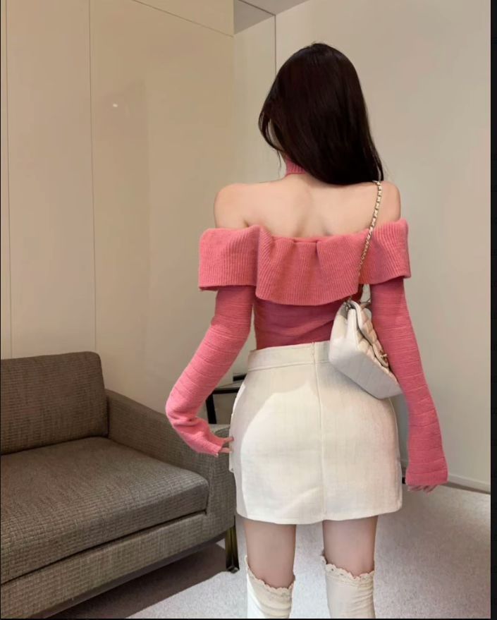 스파이스 걸스 순수한 나이 웨스턴 스타일 니트웨어 탑 여성의 가을과 겨울 긴 소매 주름진 어깨베이스 스웨터