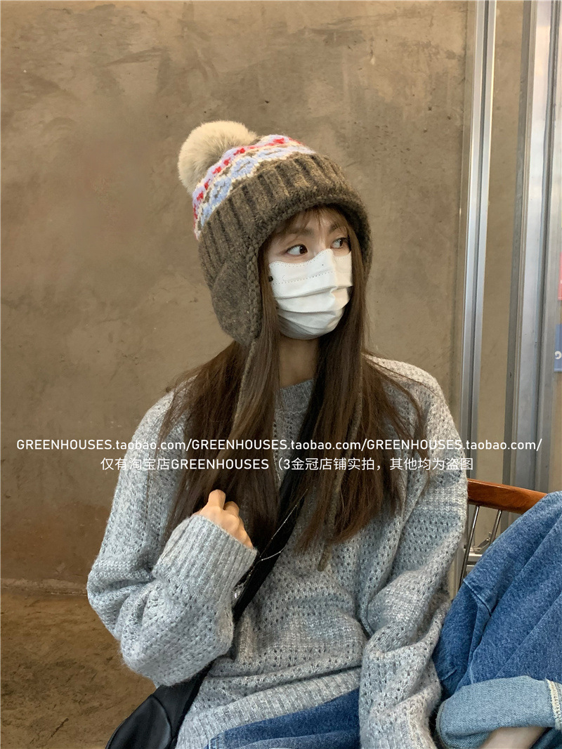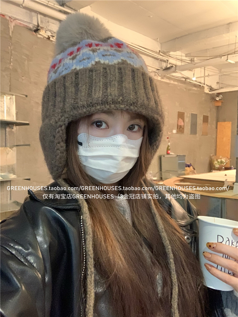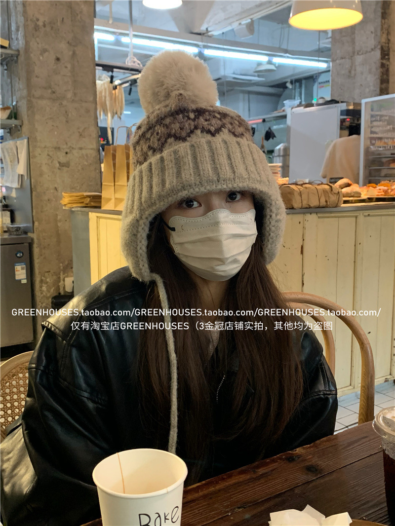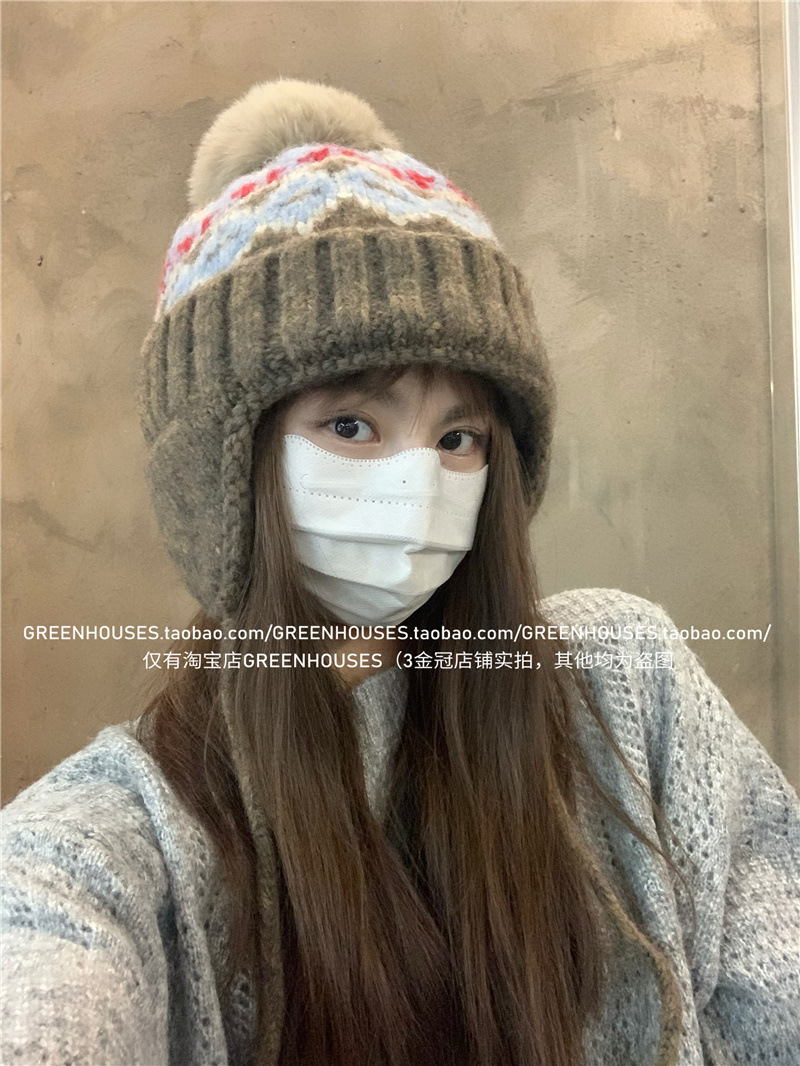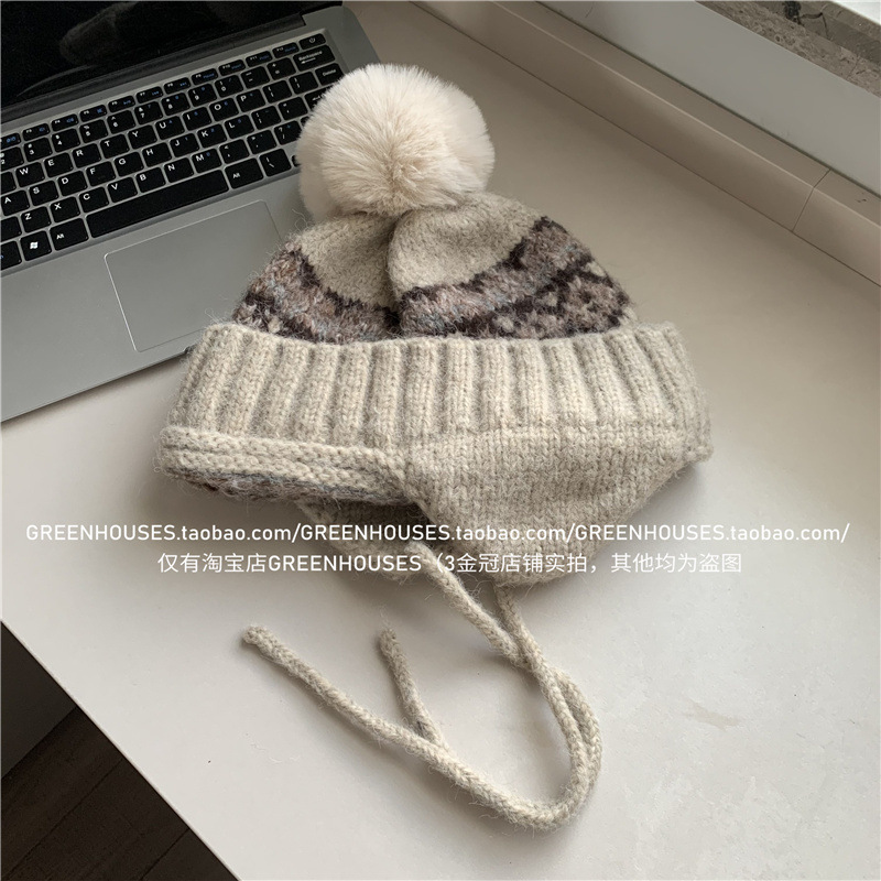 2024 한국 새로운 페어 아일랜드 레트로 울 모자 여성 두꺼운 따뜻한 귀 보호 레이 펑 모자 가을과 겨울 니트 모자