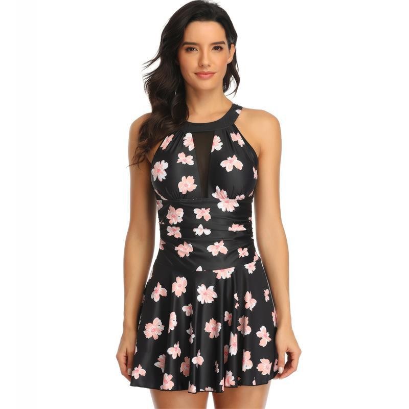 유럽과 미국의 국경 간 새로운 섹시한 수영복 고급 솔리드 컬러 원피스 메쉬 교수형 목 소매 수영복 여성용스토어 가기