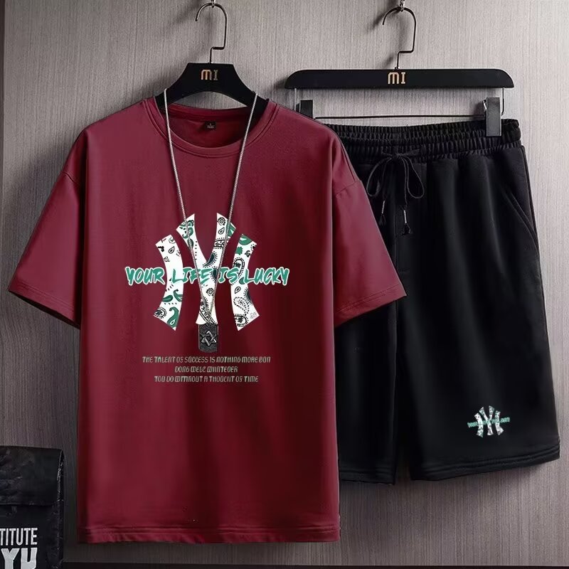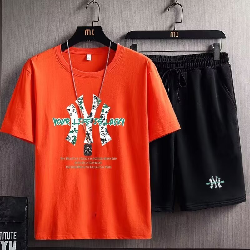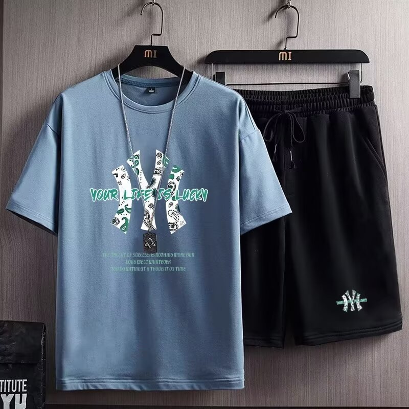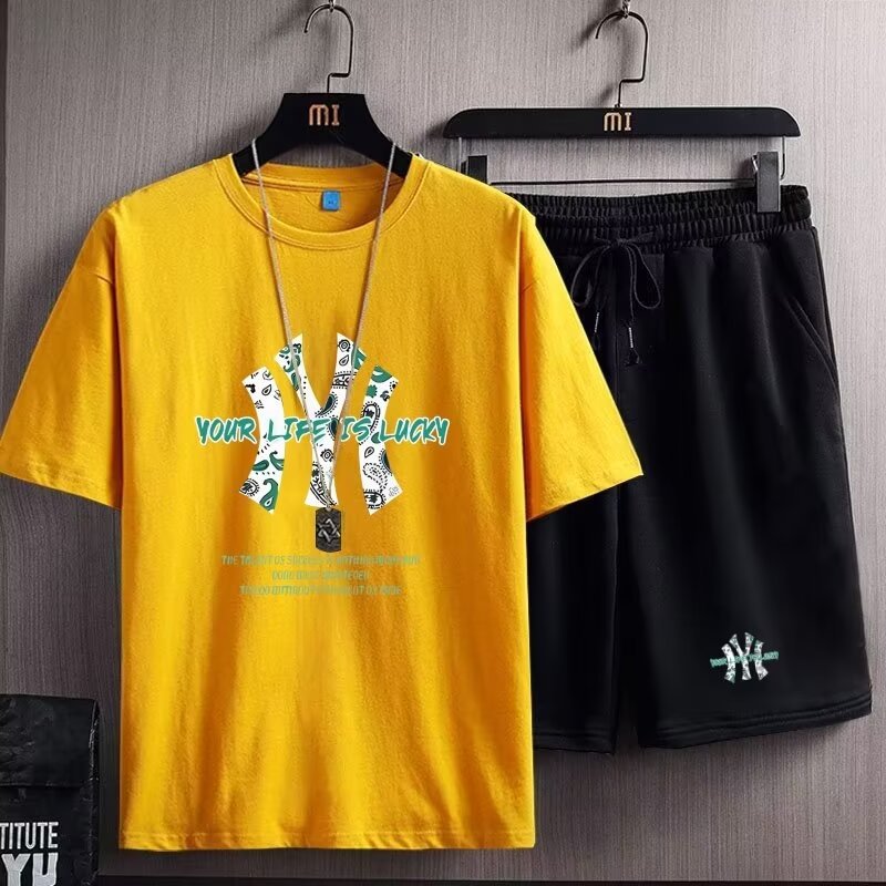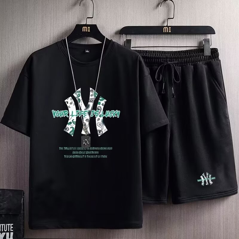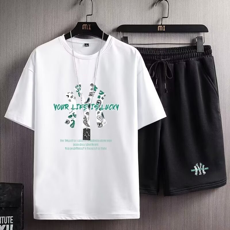 여름 새 남자 반팔 티셔츠 반바지 세트 한국 패션 느슨한 올매치 스포츠 레저 투피스 세트