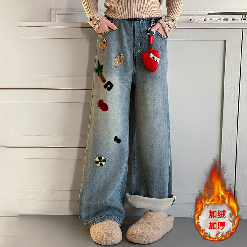 여아 바지 2025 신상 중대형 아동 가을 겨울용 기모 안감 일자핏 슬림 데님 팬츠 여아 루즈핏 와이드 팬츠