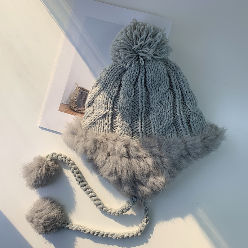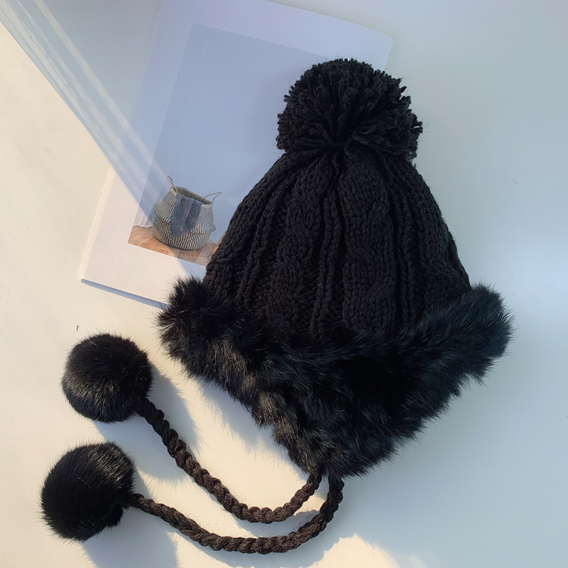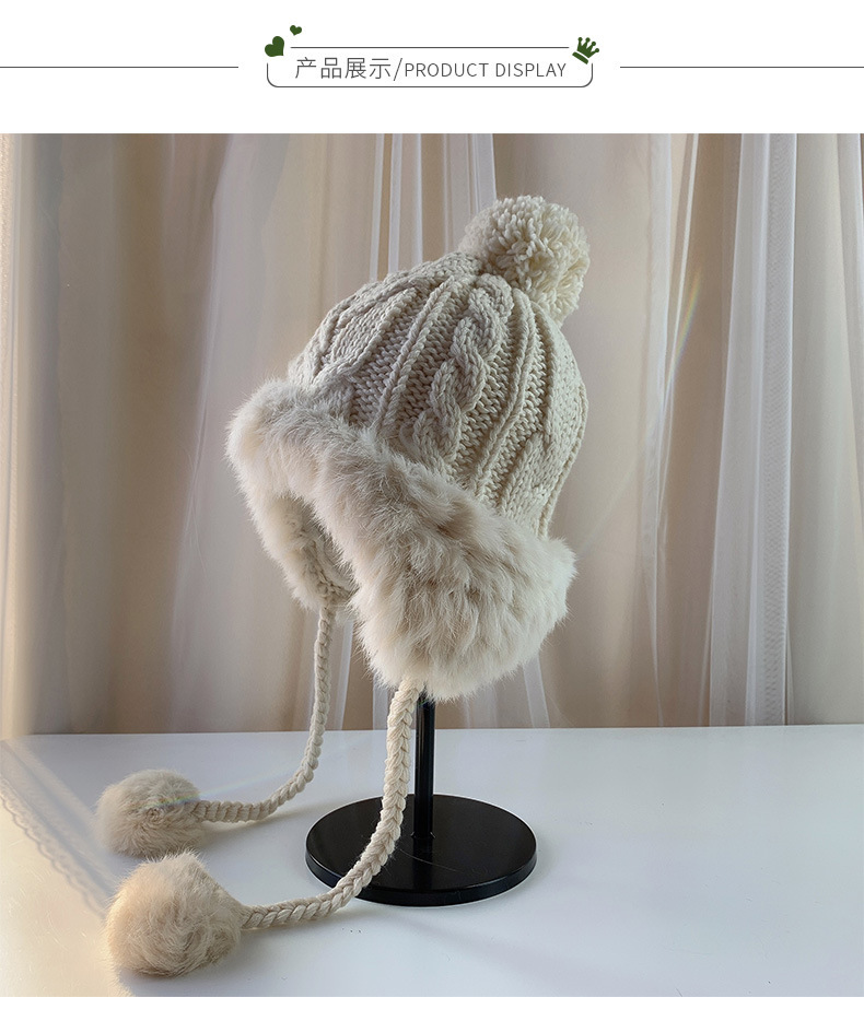 모피 공 귀 보호 여행 봉제 니트 양모 모자 여성의 두꺼운 따뜻한 감기 방지 레이 펑 모자 2024 년 가을 및 겨울