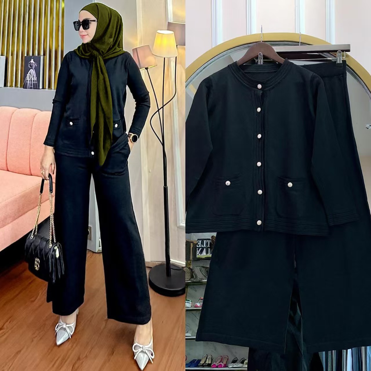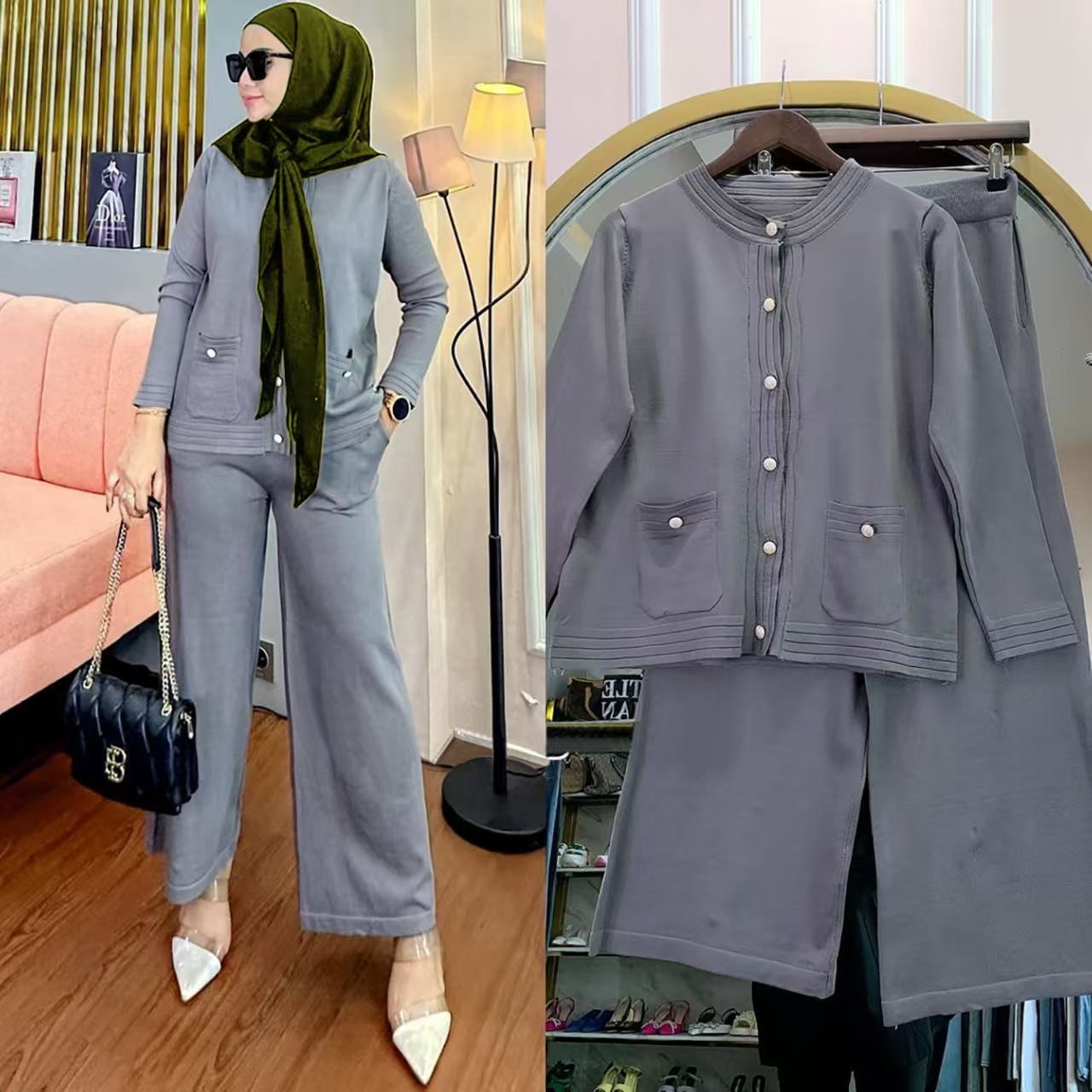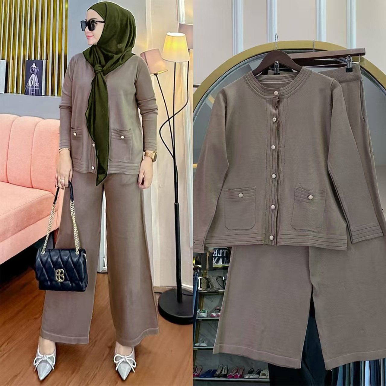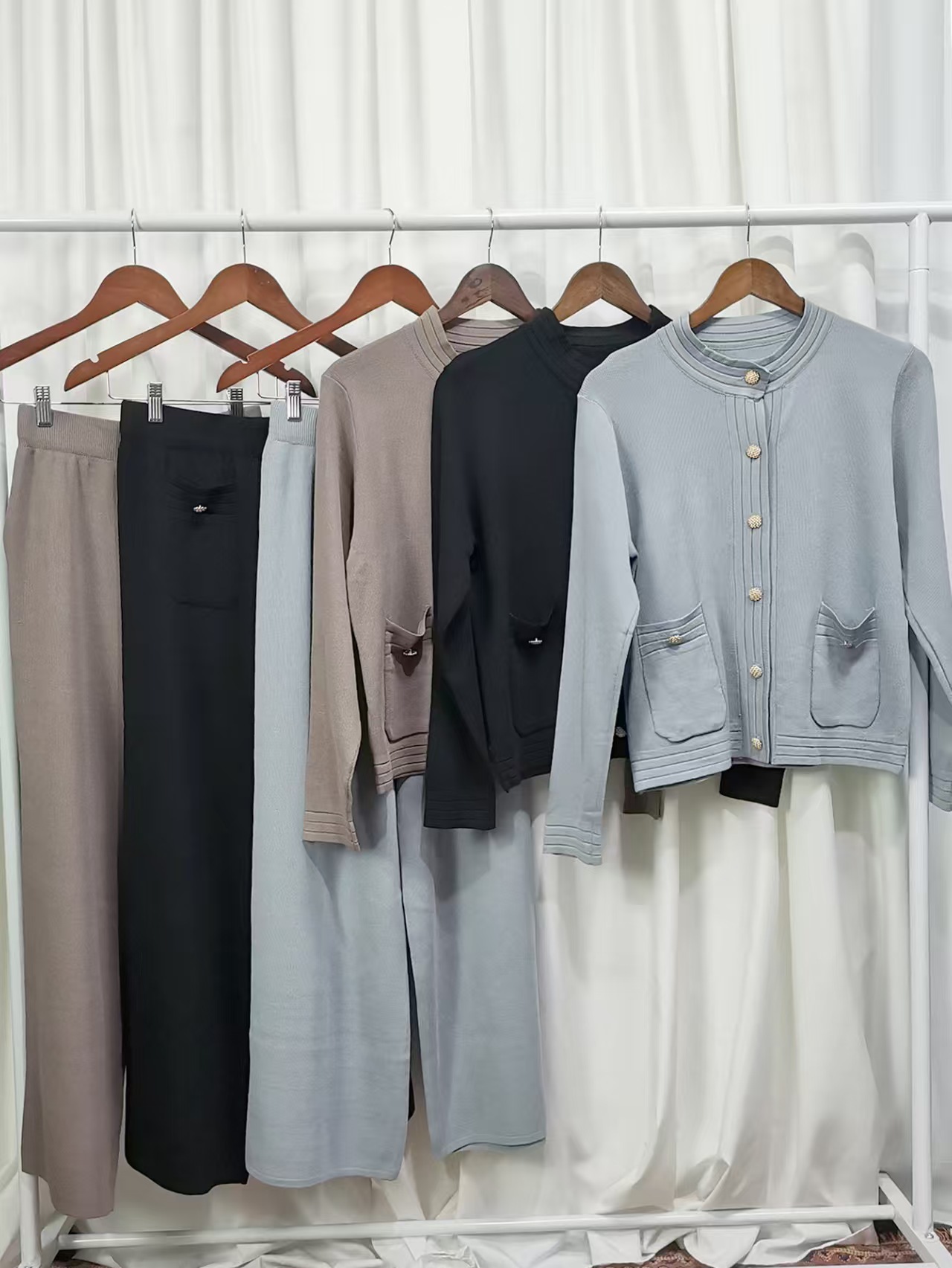 니트 세트 여성용 라운드 넥 싱글 브레스트 긴팔 니트 스웨터 포켓 와이드 레그 바지 패션 캐주얼 투피스 여성용 세트