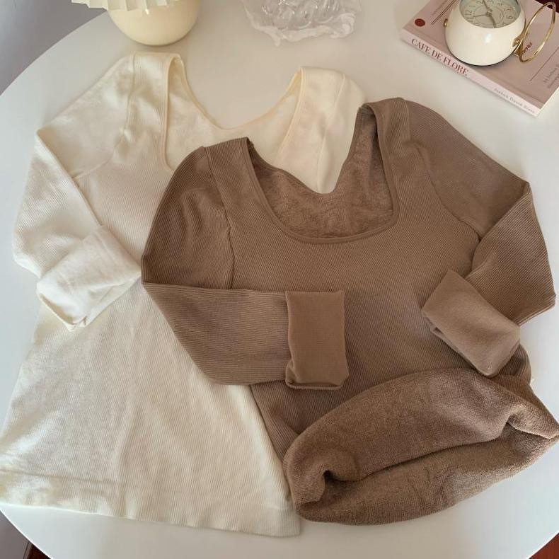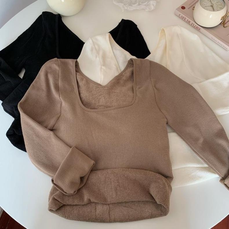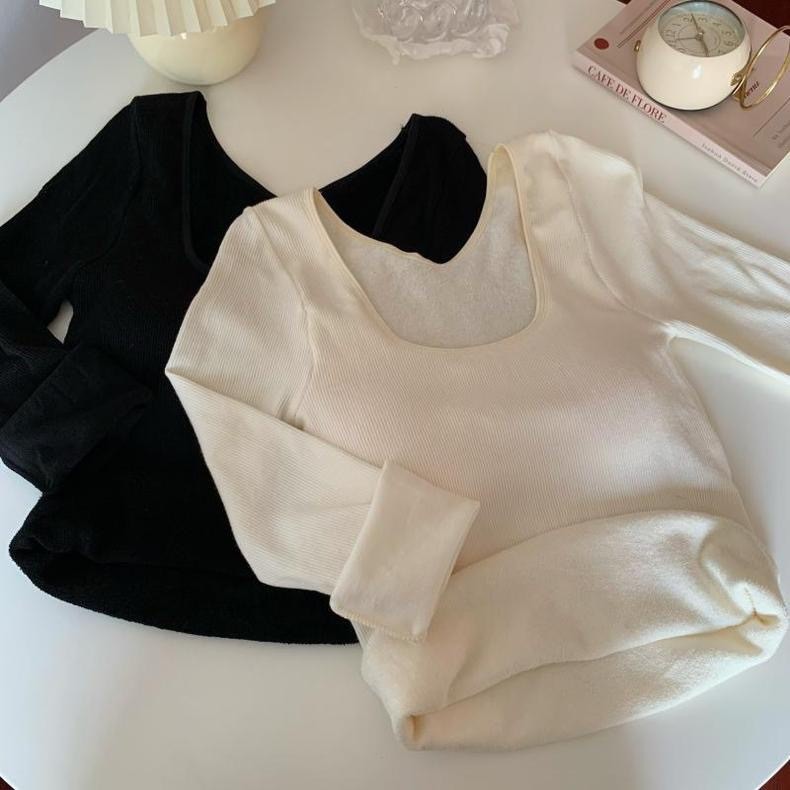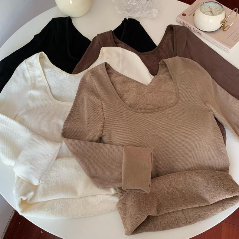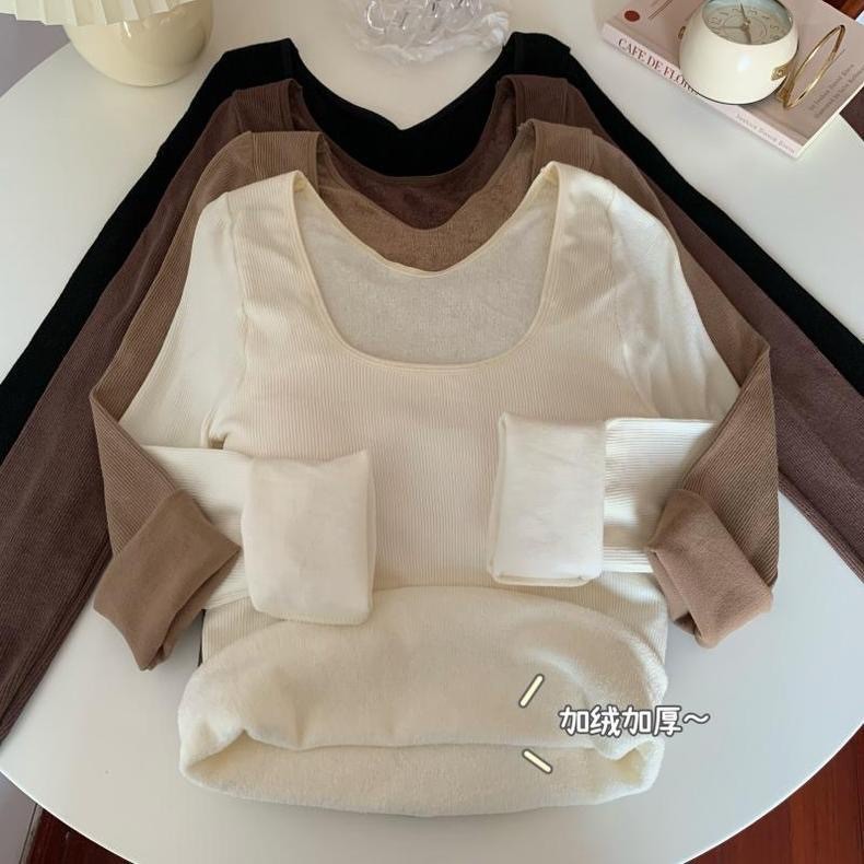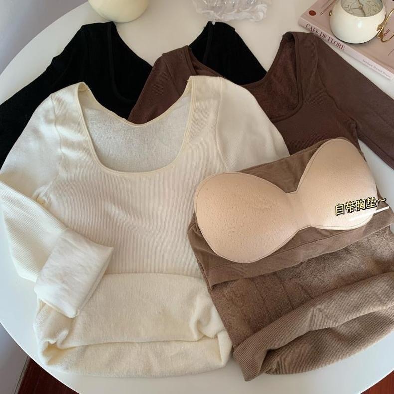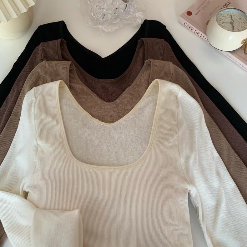 가을과 겨울 기모 테리 높은 탄성 밴드 가슴 패드 열 속옷 기본 셔츠 겉옷 기본 따뜻한 긴 소매 최고 여성스토어 가기
