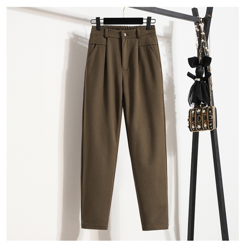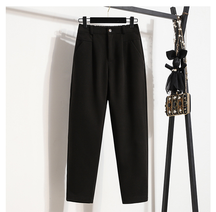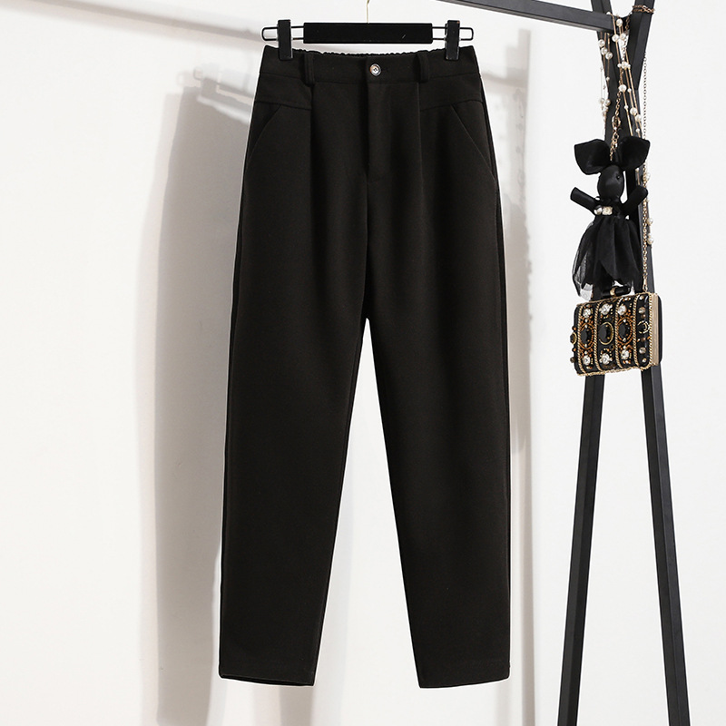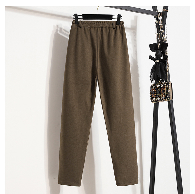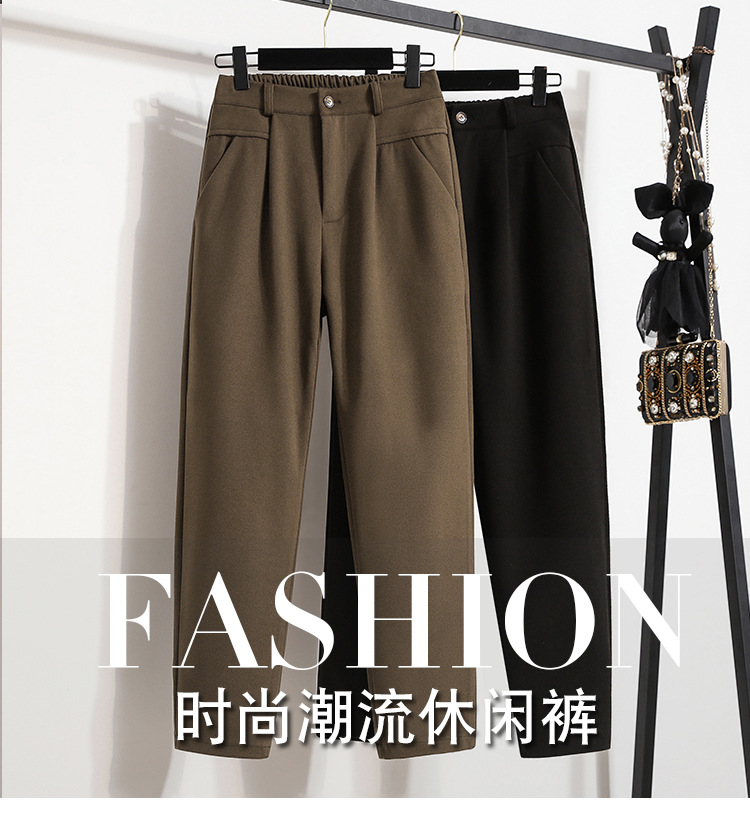 진짜 샷 재고 따뜻한 모직 탄성 허리 플러스 사이즈 하렘 바지 2024 겨울 새로운 통통녀 슬림 캐주얼 바지
