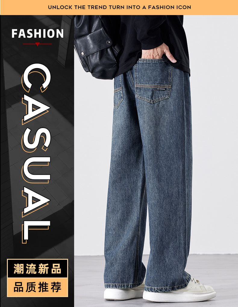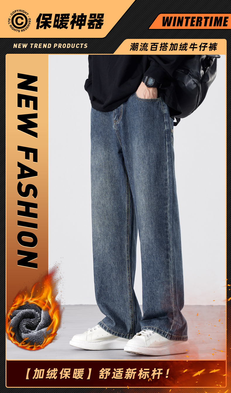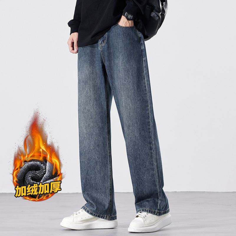 2024新款美式加绒复古水洗垂感阔腿直筒牛仔裤男士半松紧百搭长裤
