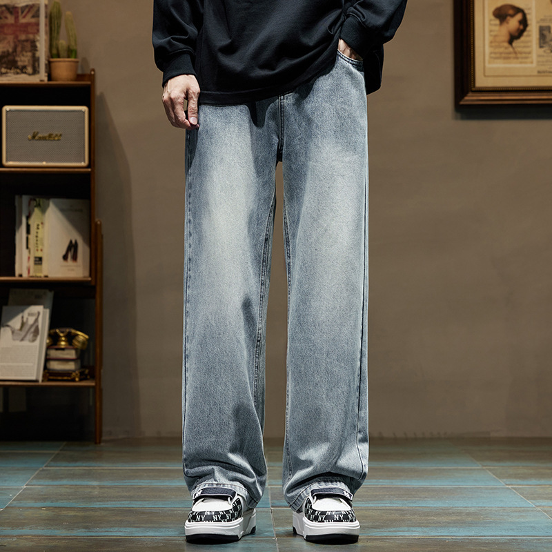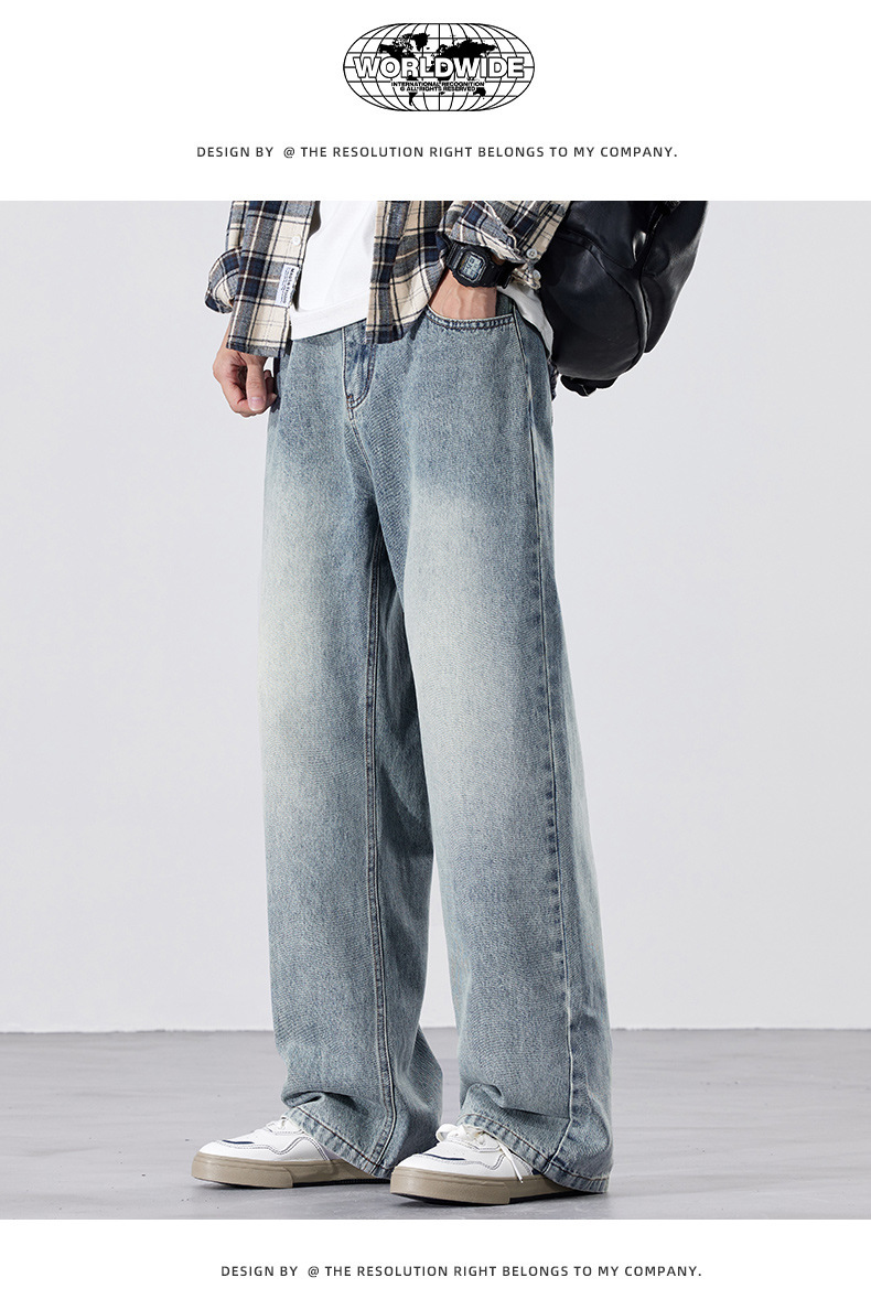 2024 새로운 미국 스타일 기모 빈티지 세척 와이드 레그 스트레이트 청바지 남자 반 탄성 올 매치 바지스토어 가기