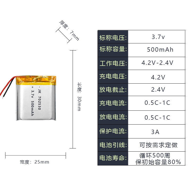 폴리머 리튬 배터리 702530 500mah3.7V 야외 삼원 배터리 손 따뜻하게 밤 빛 충전 장난감스토어 가기