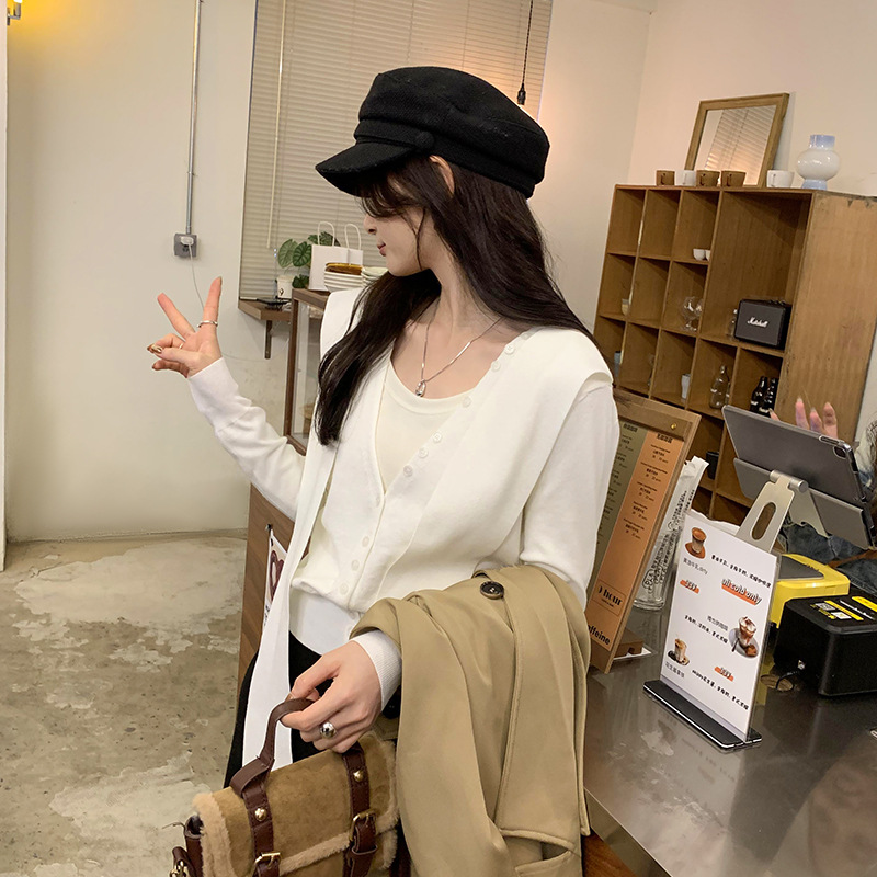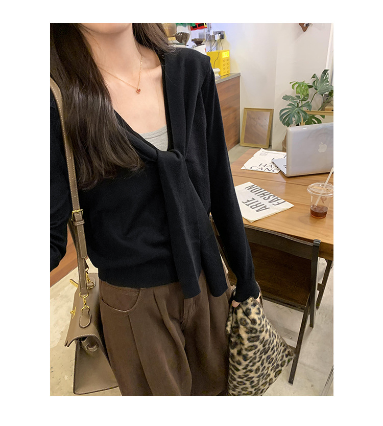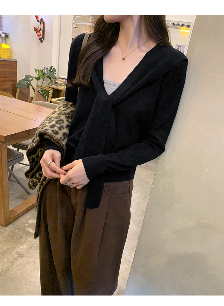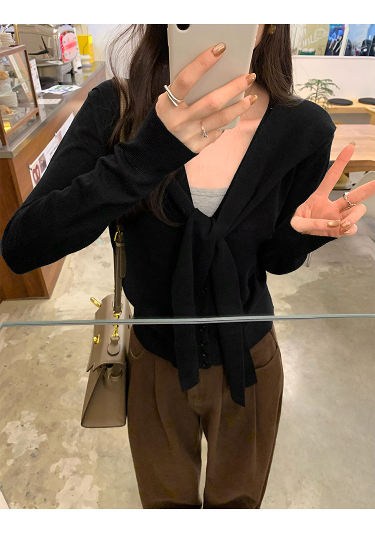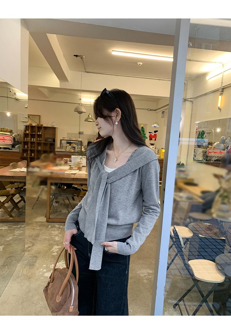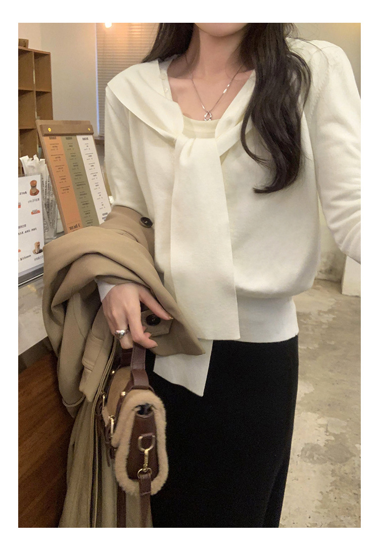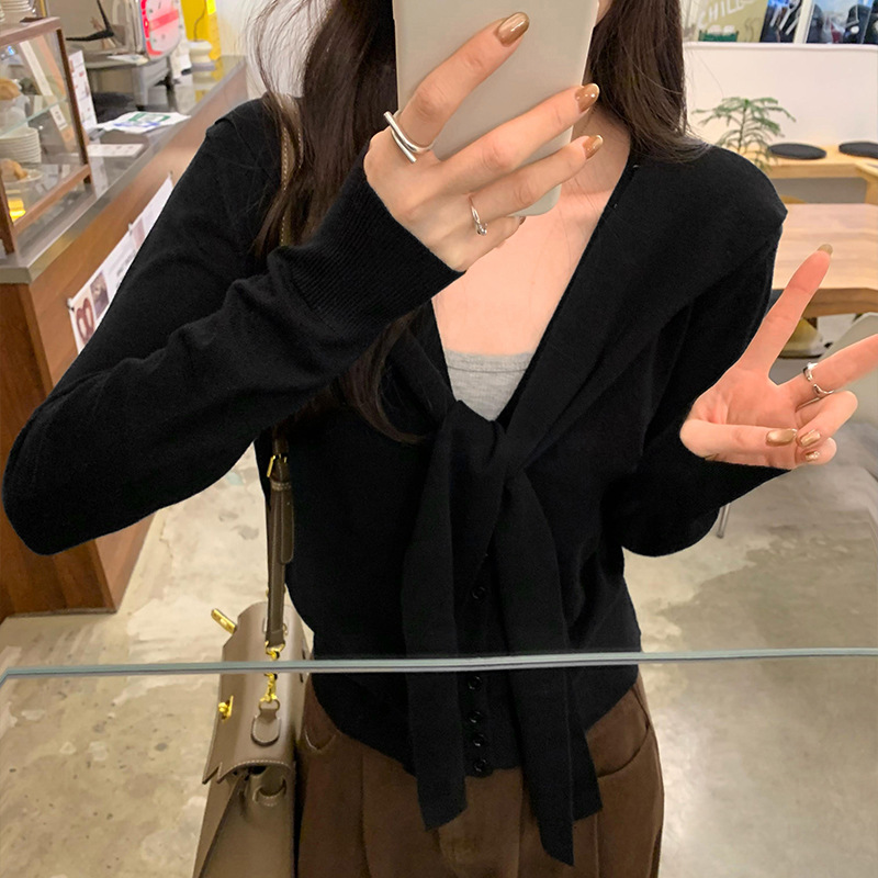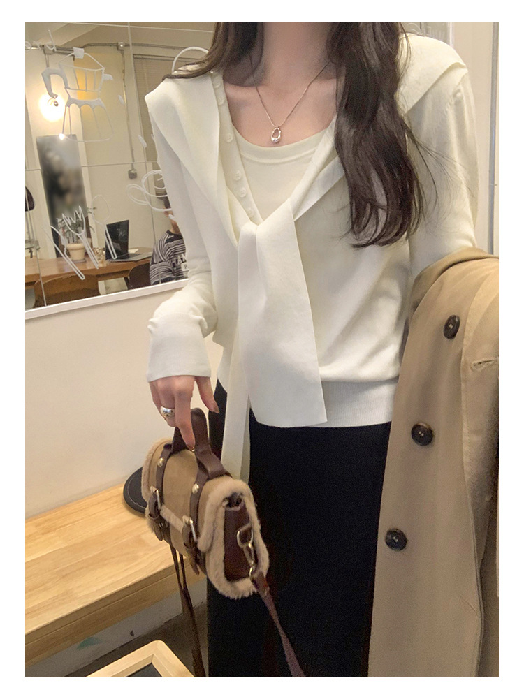 단색 가짜 2 종 목도리 긴팔 양모 니트 카디건 재킷 여성의 2024 년 가을과 겨울 새로운 슬리밍 디자인 센스 탑