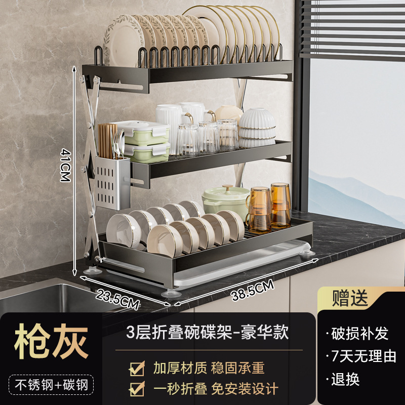 접이식 접시 보관 랙 주방 펀치없는 접시 랙 드레인 랙 카운터 탑 멀티 레이어 접시, 젓가락 및 숟가락 보관 랙스토어 가기