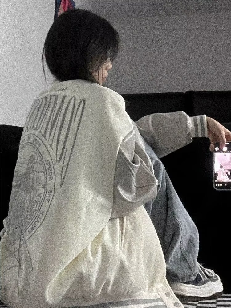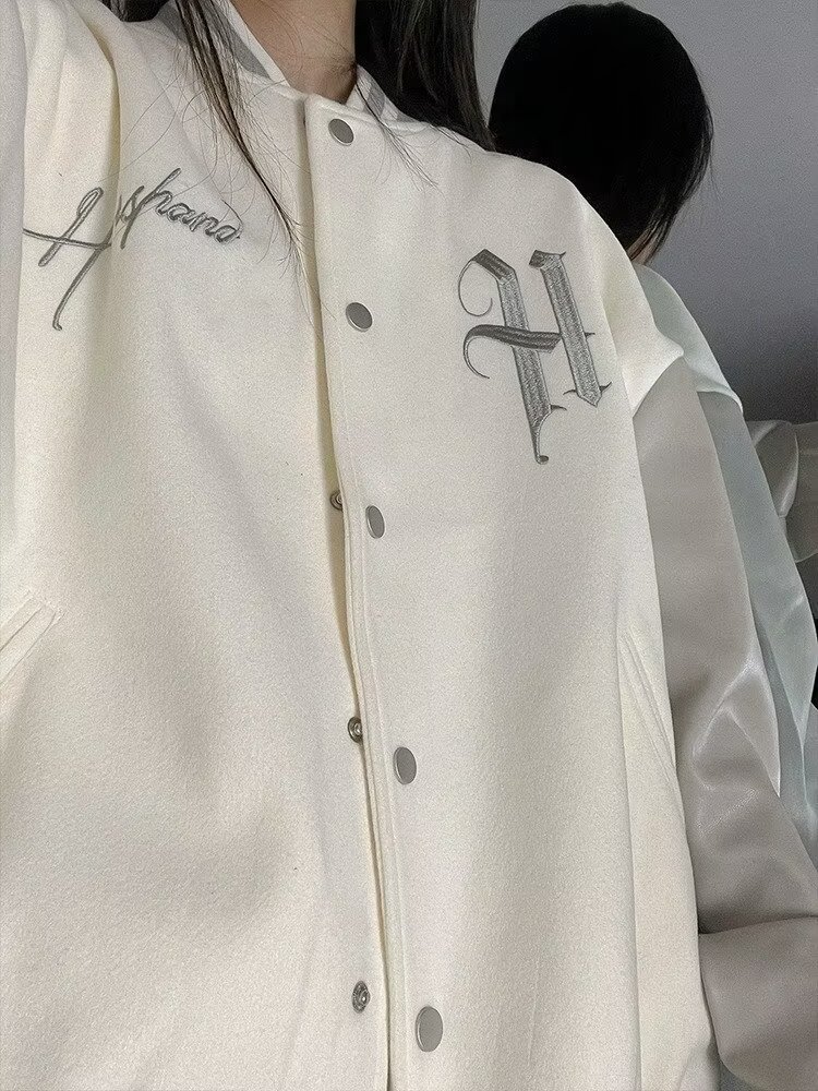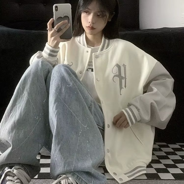 美式复古拼接刺绣字母棒球服外套女春秋季情侣装小众开衫夹克上衣