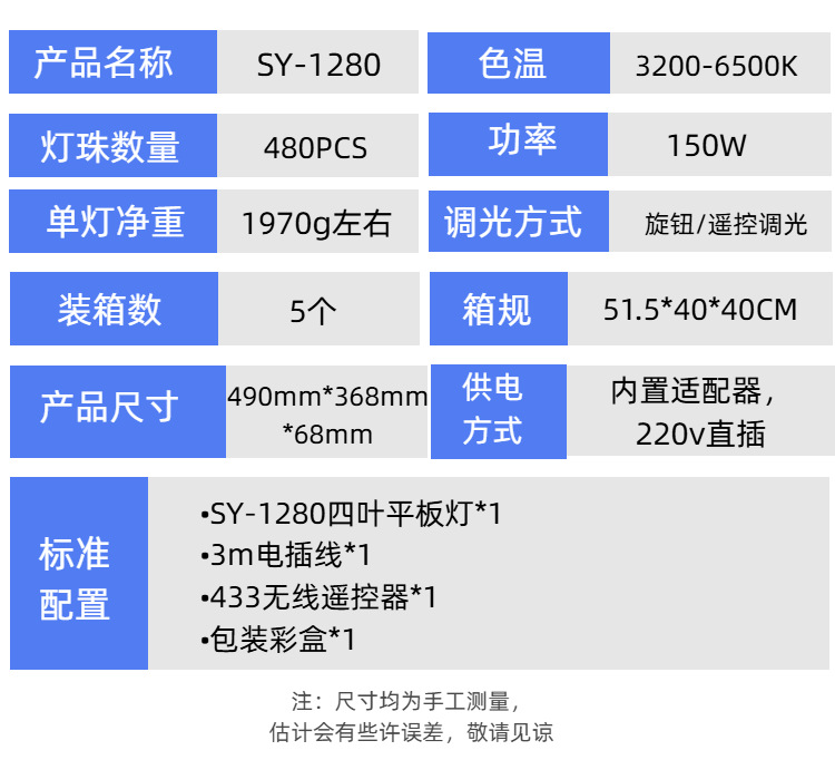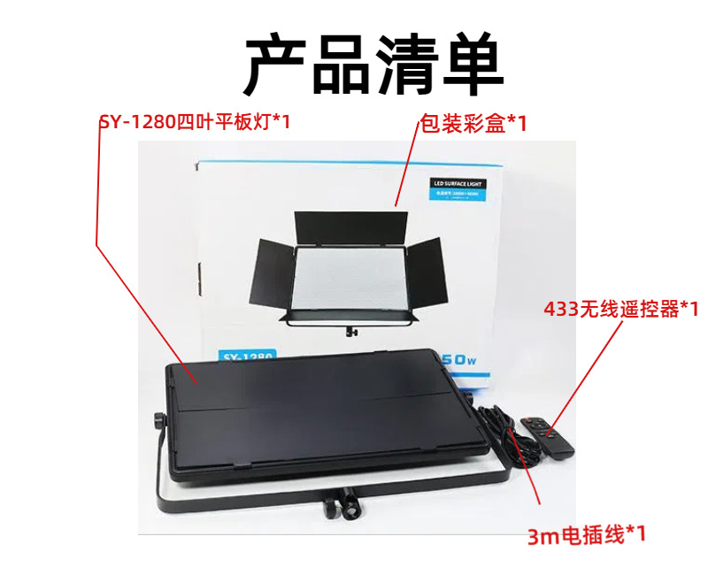 • SY-1280 4엽 평면 패널 조명(단일 조명에는 전기 플러그*1+433 무선 리모콘*1이 포함되어 있습니다)