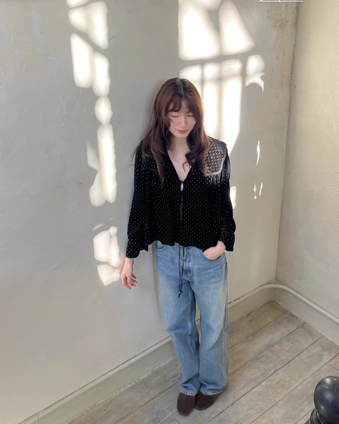 한국 vi * 일반 새로운 STELLA 설문 조사 Dot 벨벳 레이스 업 셔츠스토어 가기