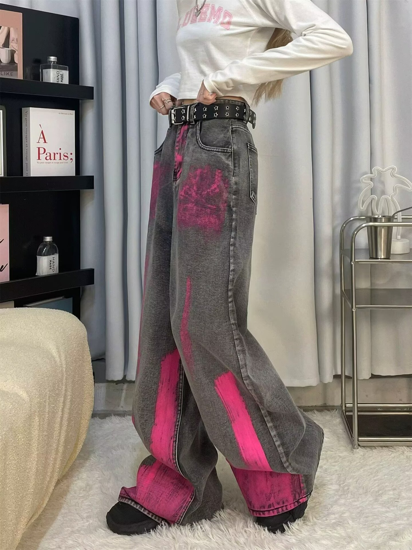 아메리칸 바이브 레트로 핑크 그래피티 그레이 청바지 남자 하이 스트리트 느슨한 스트레이트 와이드 레그 트렌디 팬츠스토어 가기