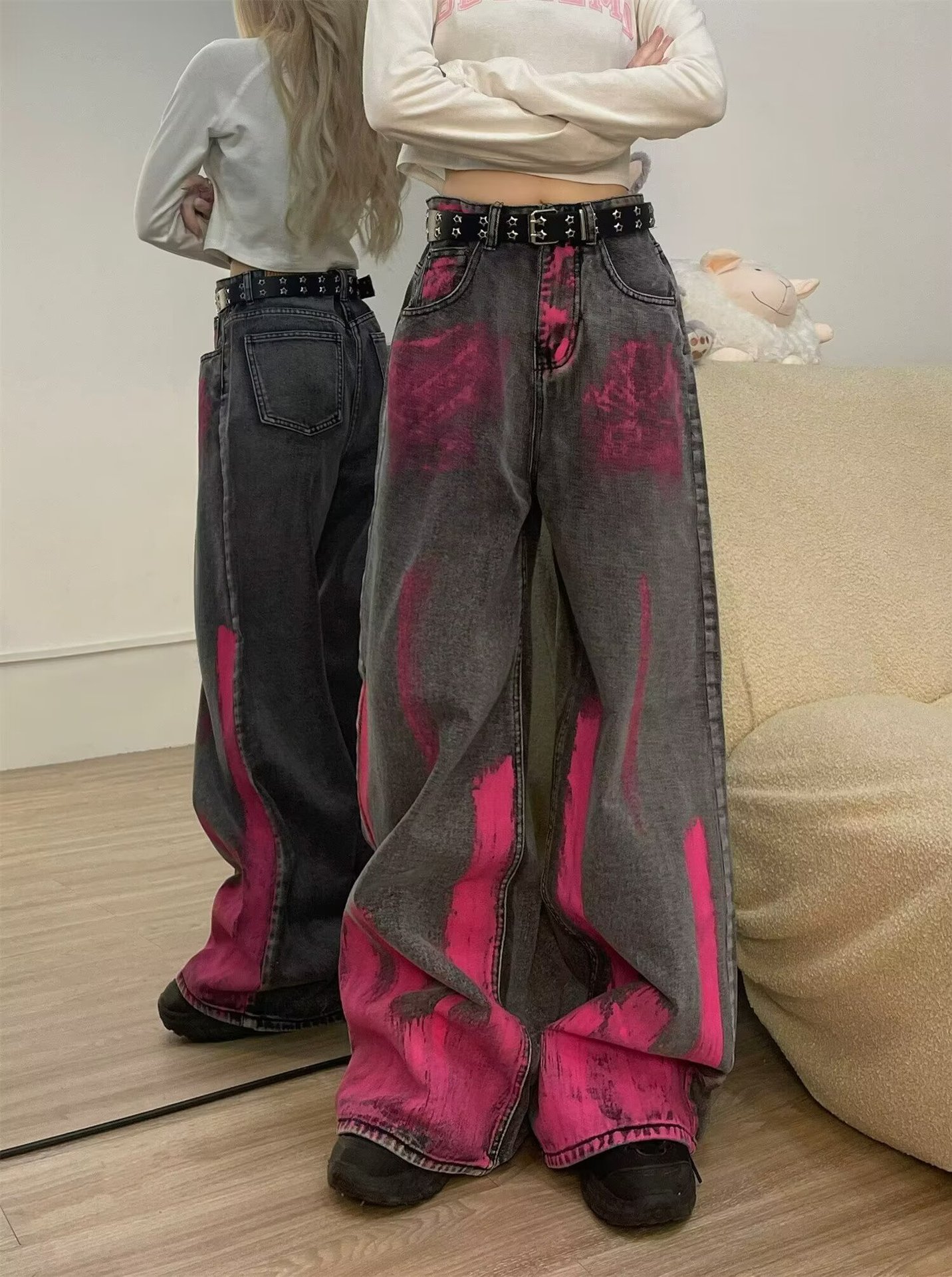 아메리칸 바이브 레트로 핑크 그래피티 그레이 청바지 남자 하이 스트리트 느슨한 스트레이트 와이드 레그 트렌디 팬츠