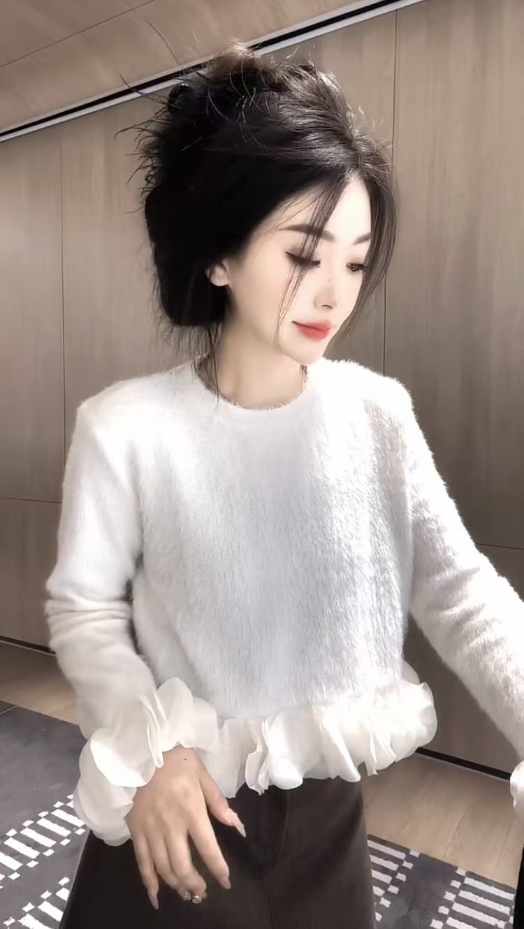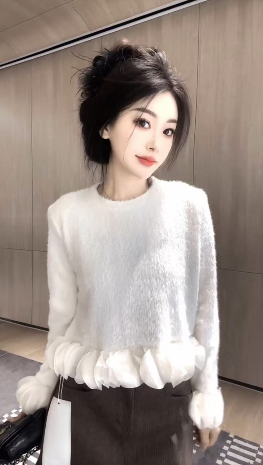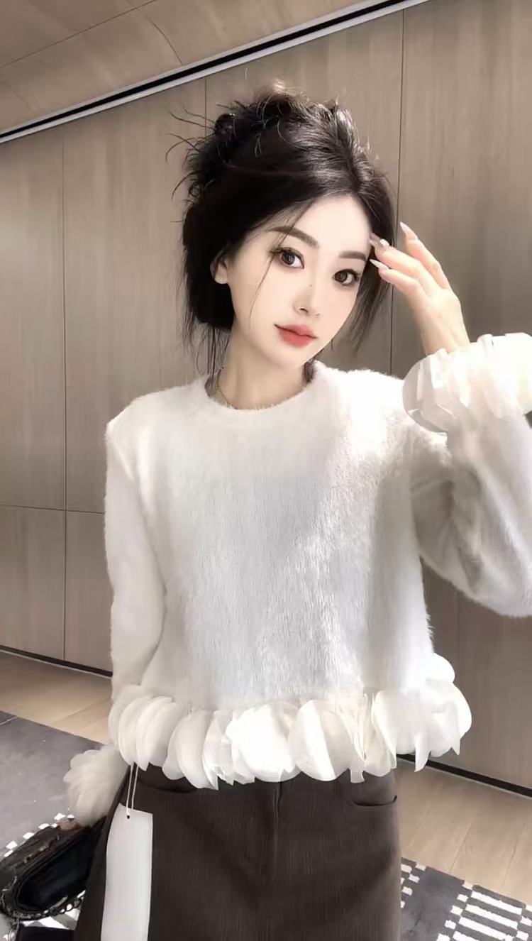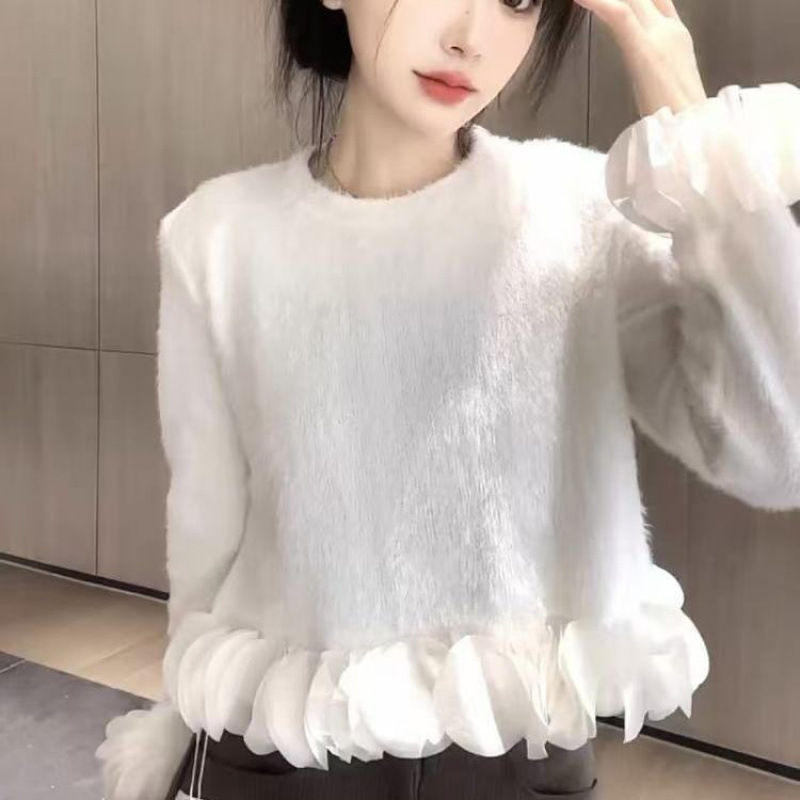 가을 새로운 부드러운 스타일 달콤한 나이를 줄이는 느슨한 올매치 스티칭 꽃잎 크루 넥 스웨터 여성용 스웨터베이스 셔츠스토어 가기