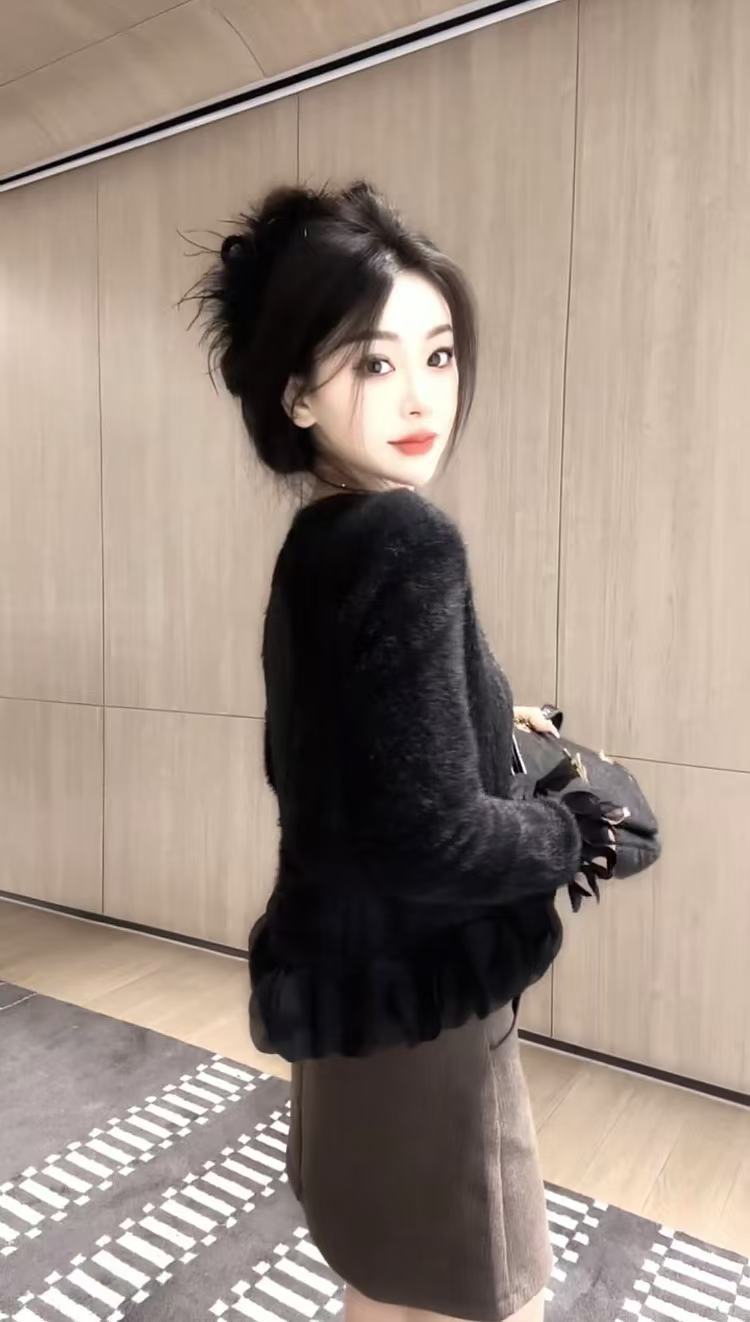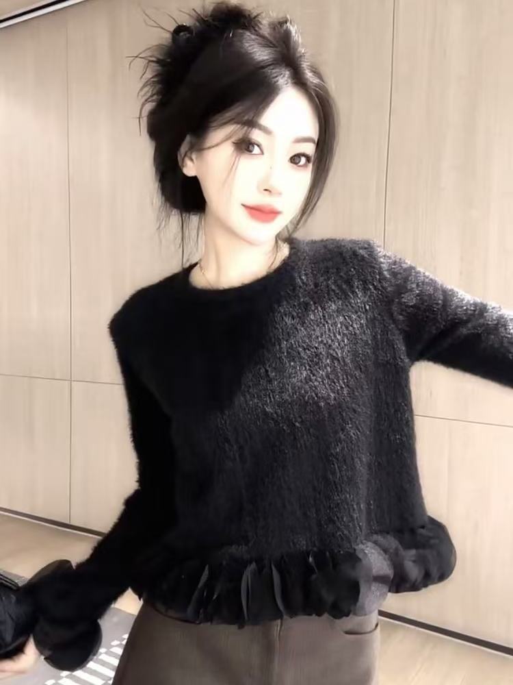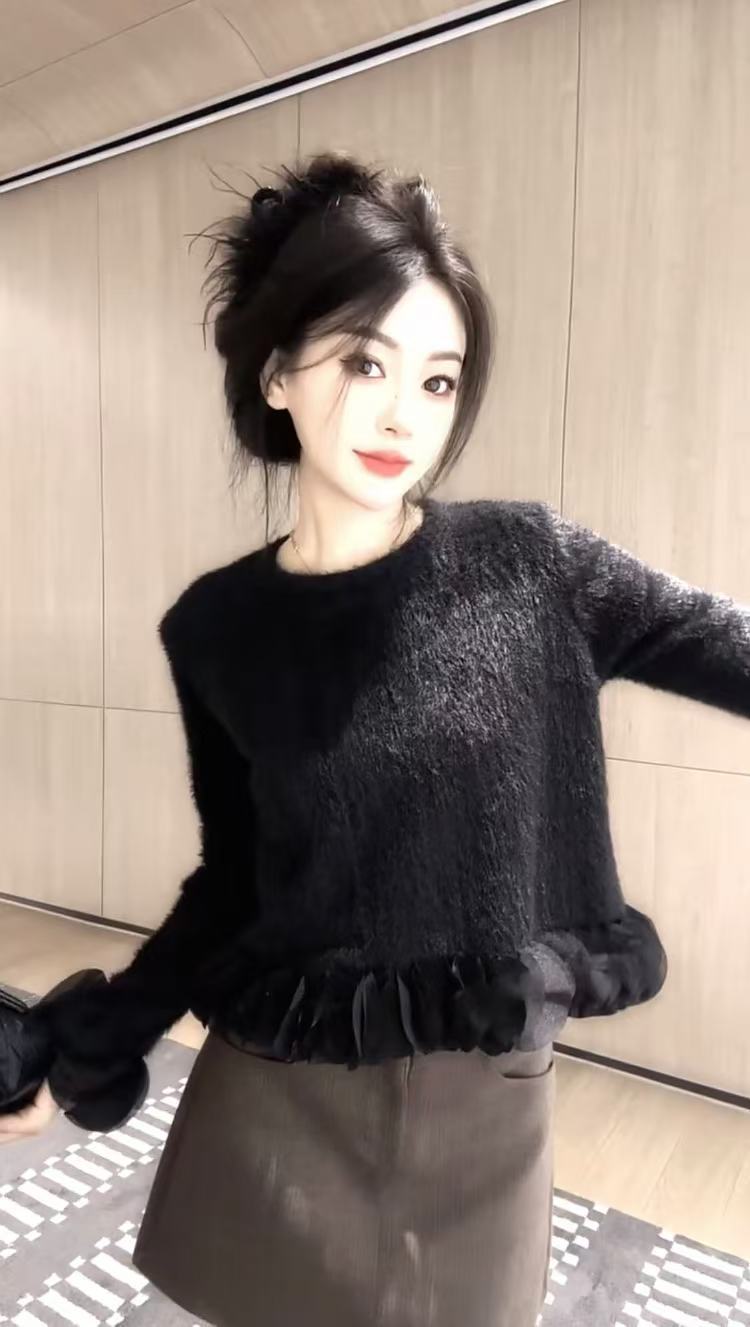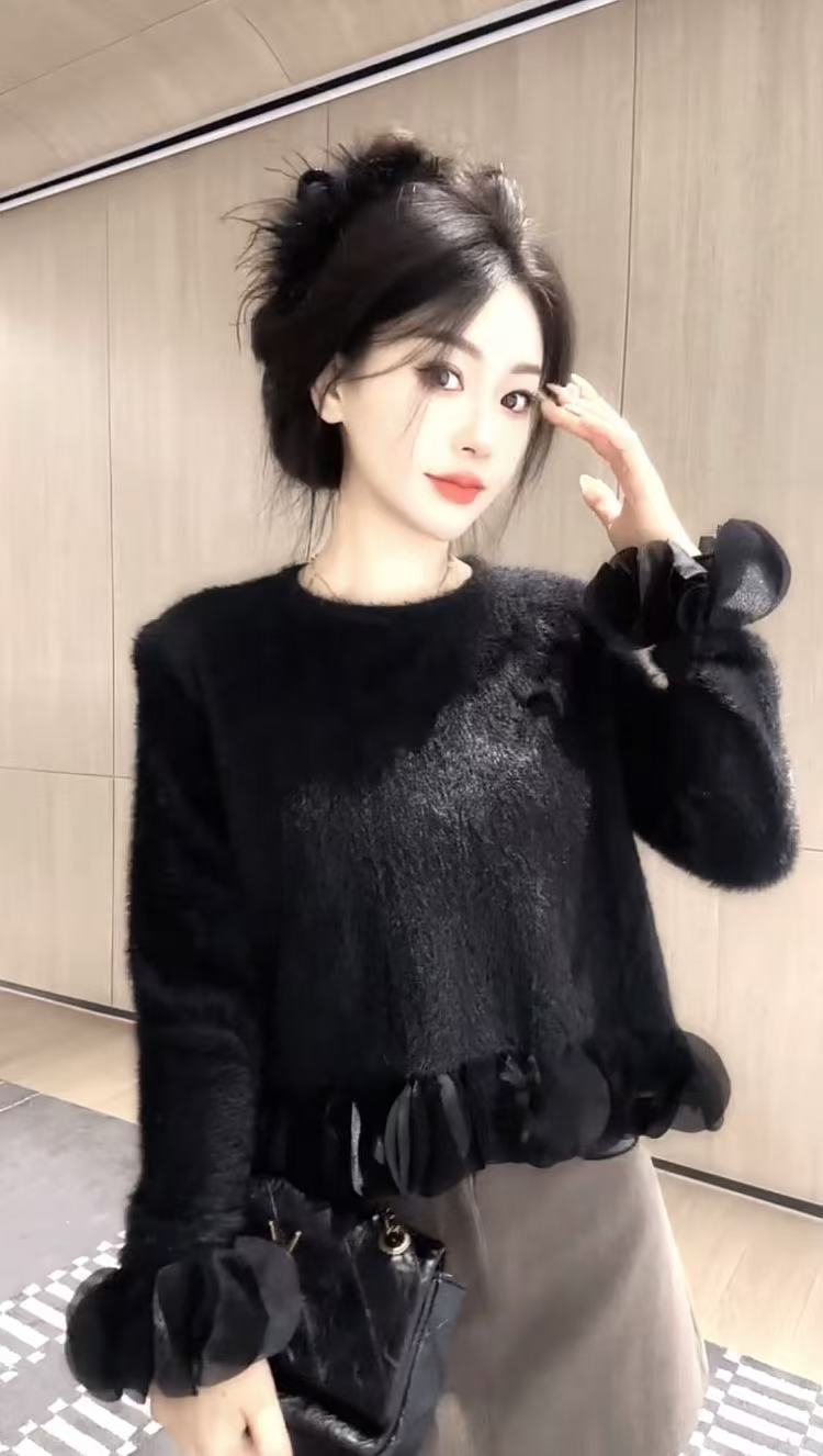 가을 새로운 부드러운 스타일 달콤한 나이를 줄이는 느슨한 올매치 스티칭 꽃잎 크루 넥 스웨터 여성용 스웨터베이스 셔츠스토어 가기