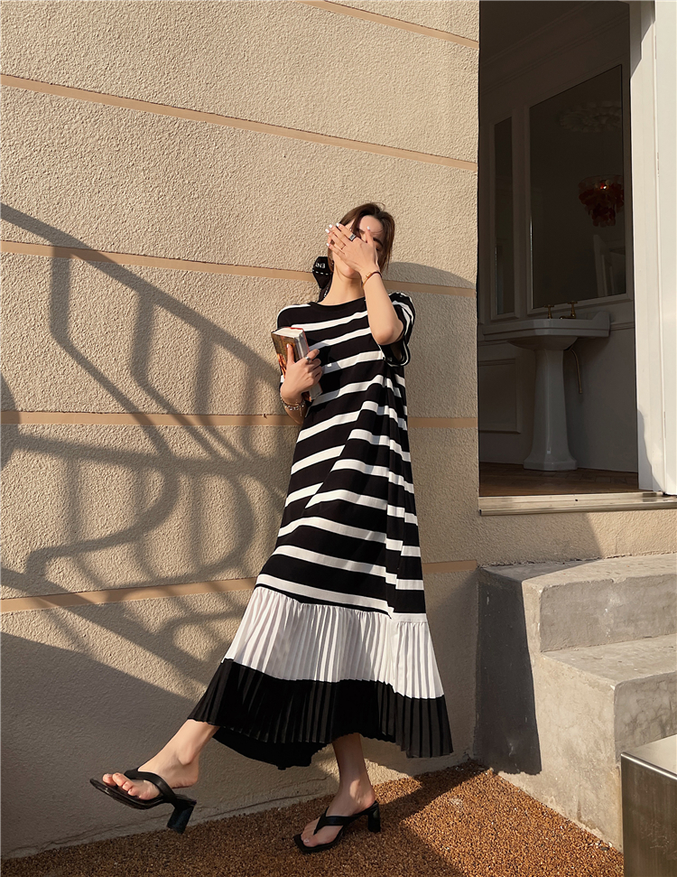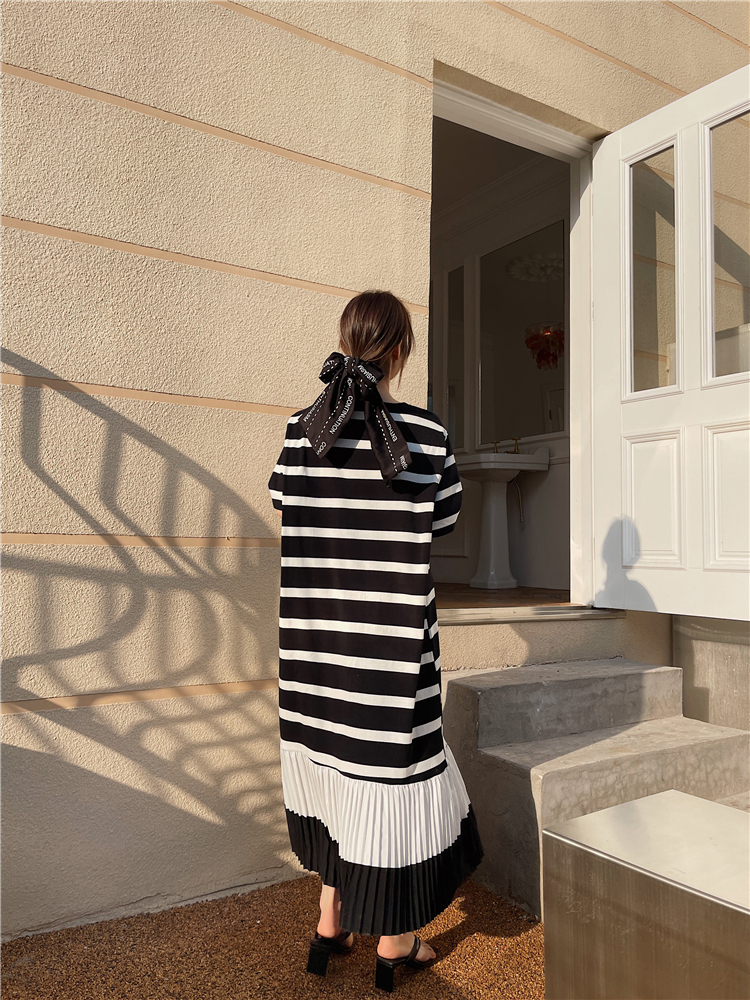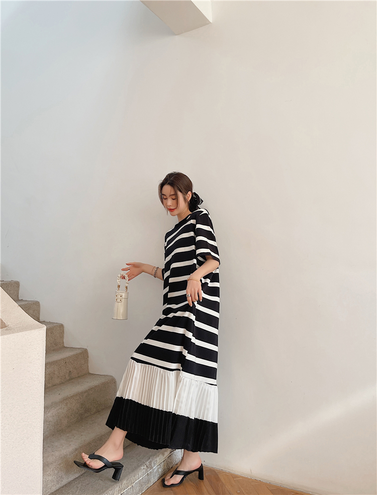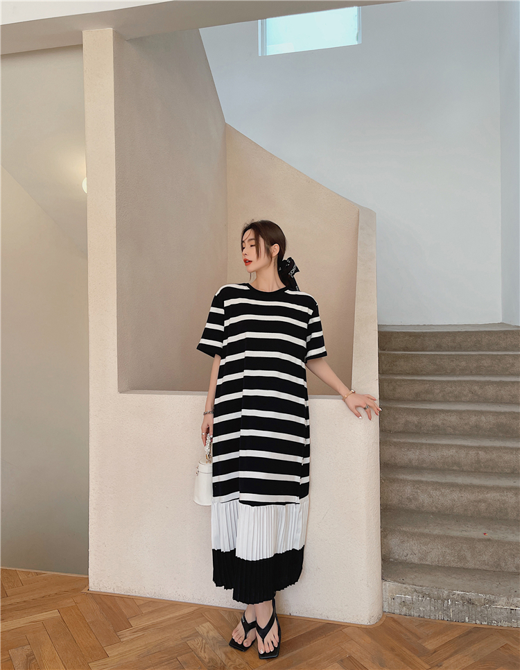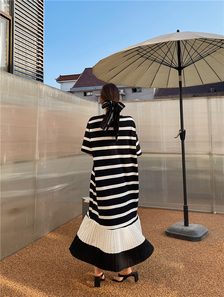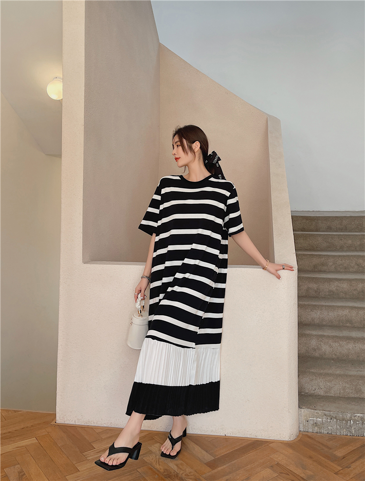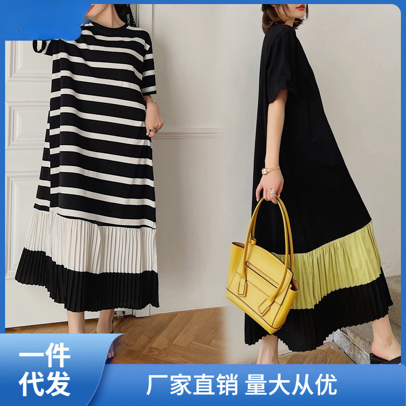 바느질 주름 대조 원피스 여자 2023 년 여름 새 줄무늬 긴 무릎 플러스 사이즈 느슨한 티셔츠 Na You