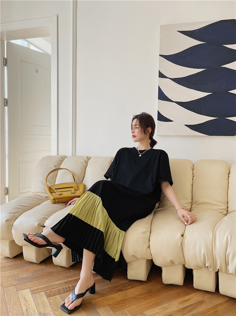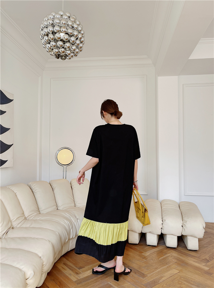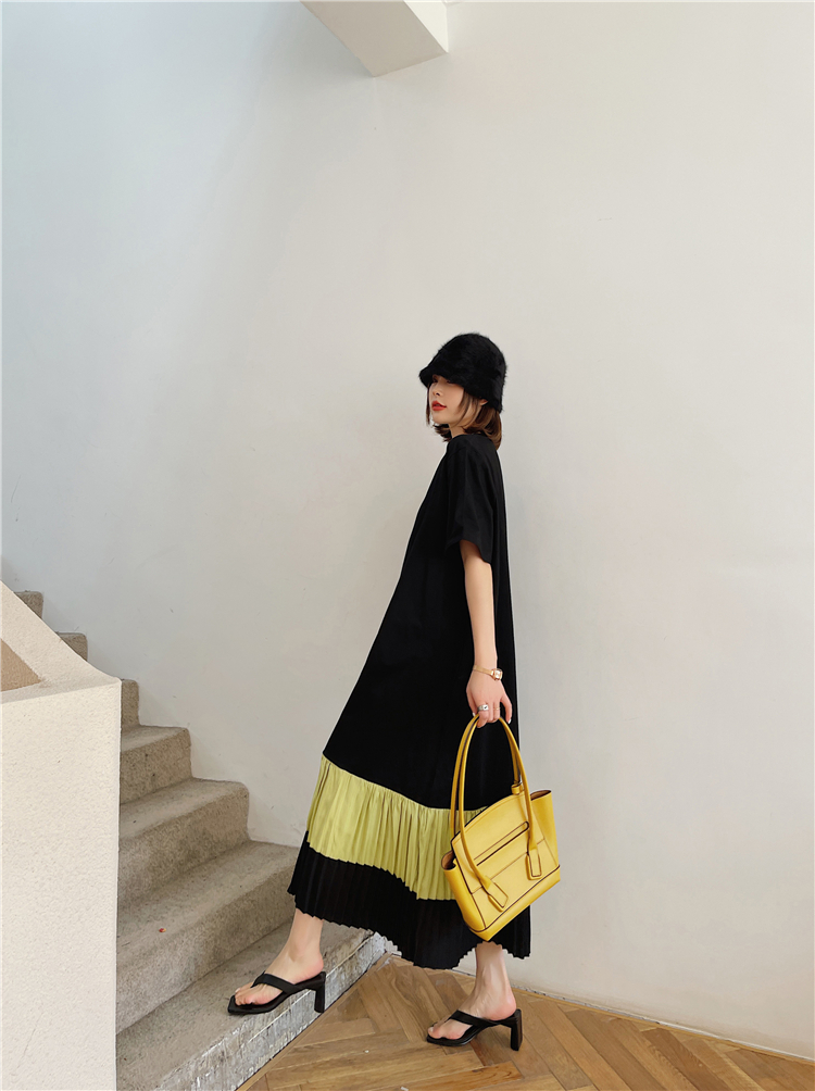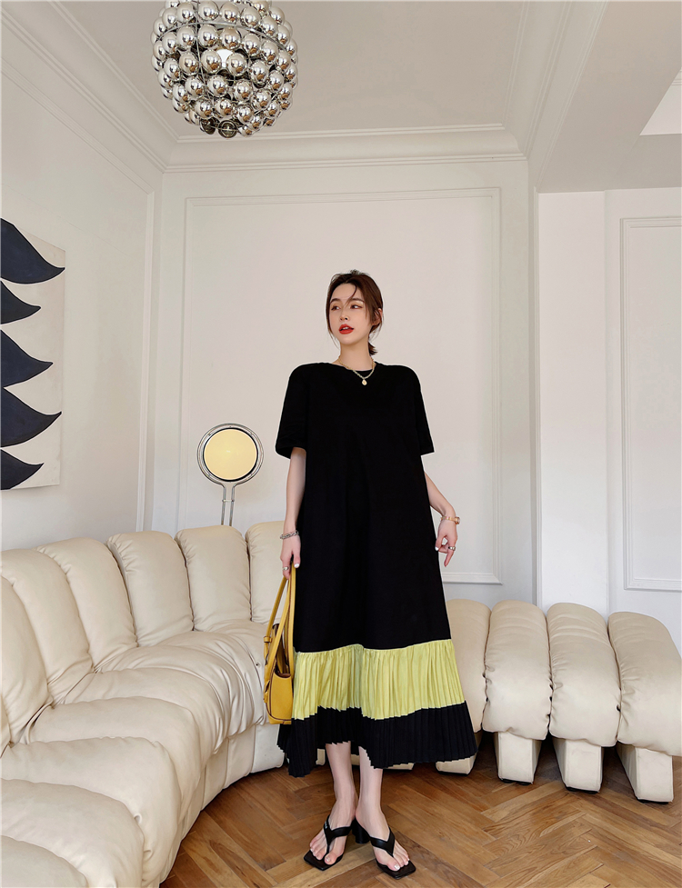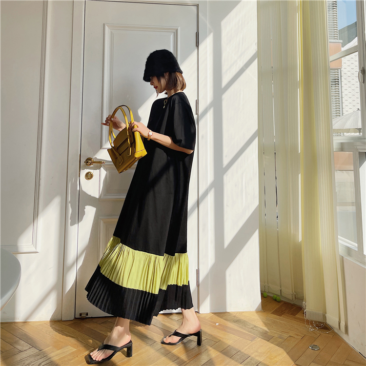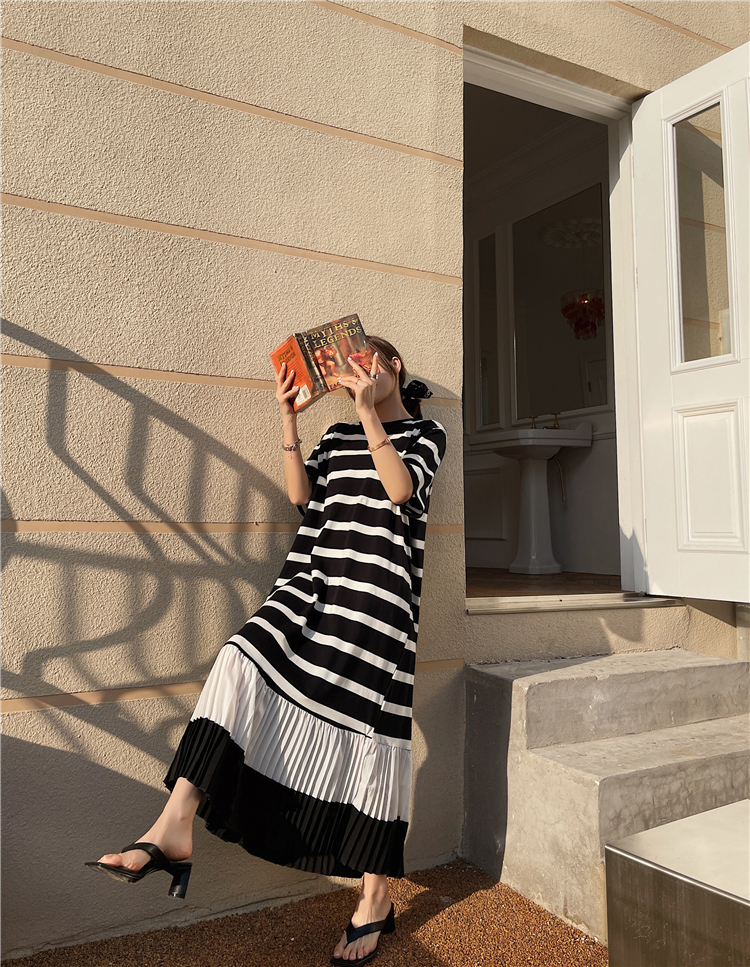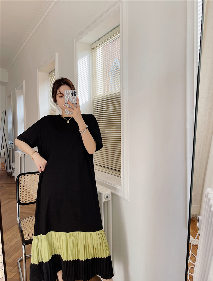 바느질 주름 대조 원피스 여자 2023 년 여름 새 줄무늬 긴 무릎 플러스 사이즈 느슨한 티셔츠 Na You