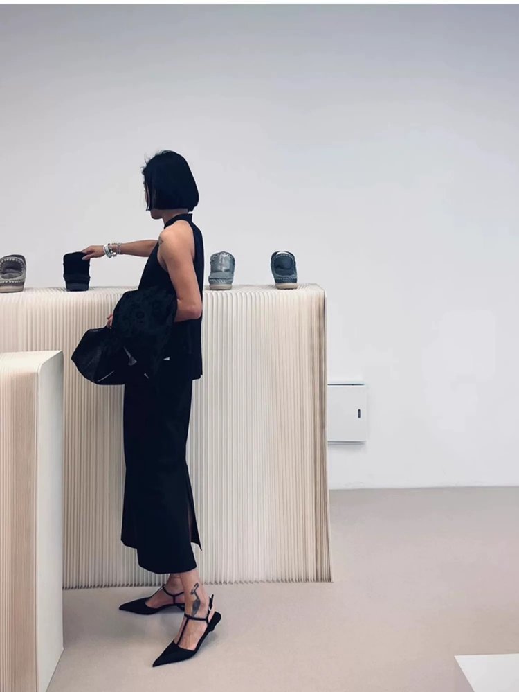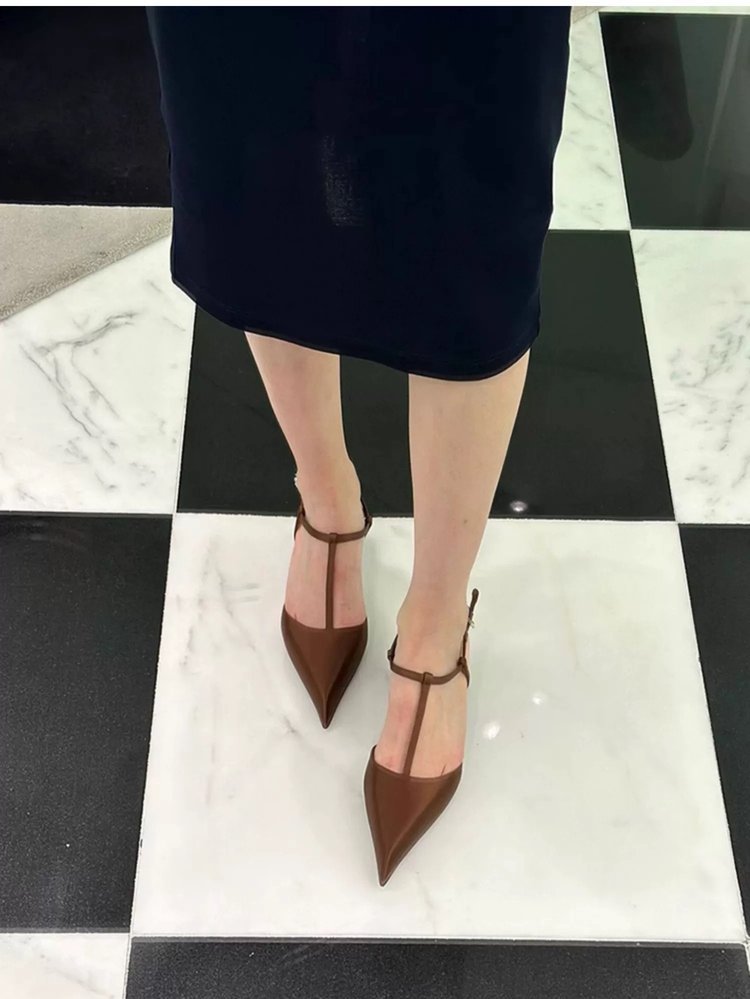 로얄 자매 스타일 삼각형 발 뒤꿈치 여성을위한 빈 전면 가방 샌들 2025 새로운 여름 T 버클 프랑스어 지적 발가락 하이힐스토어 가기