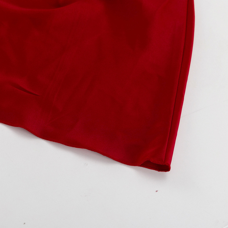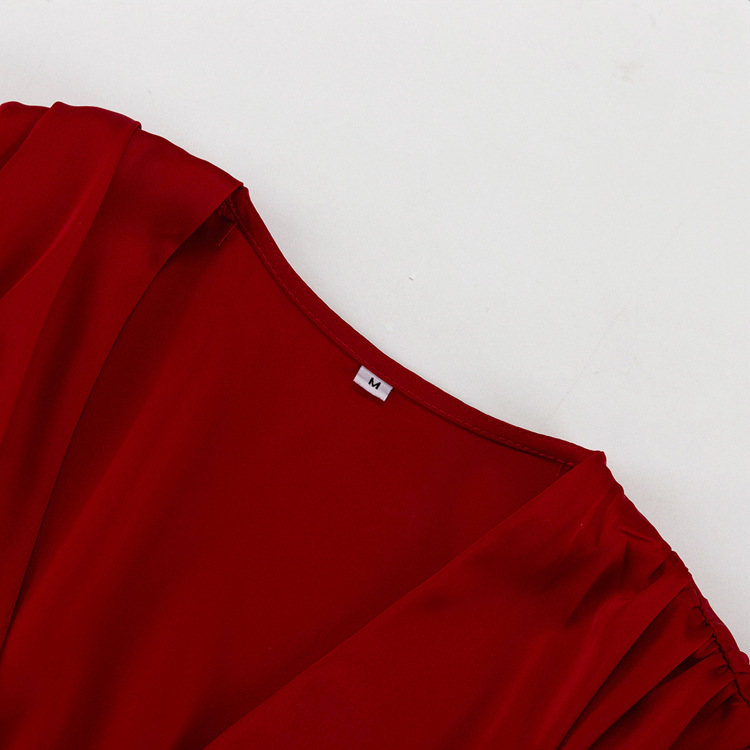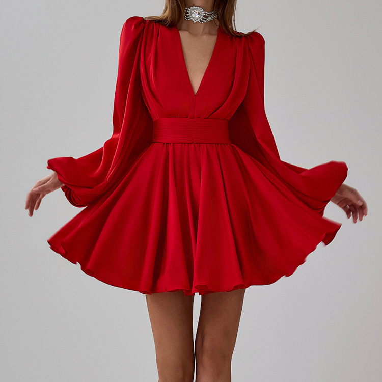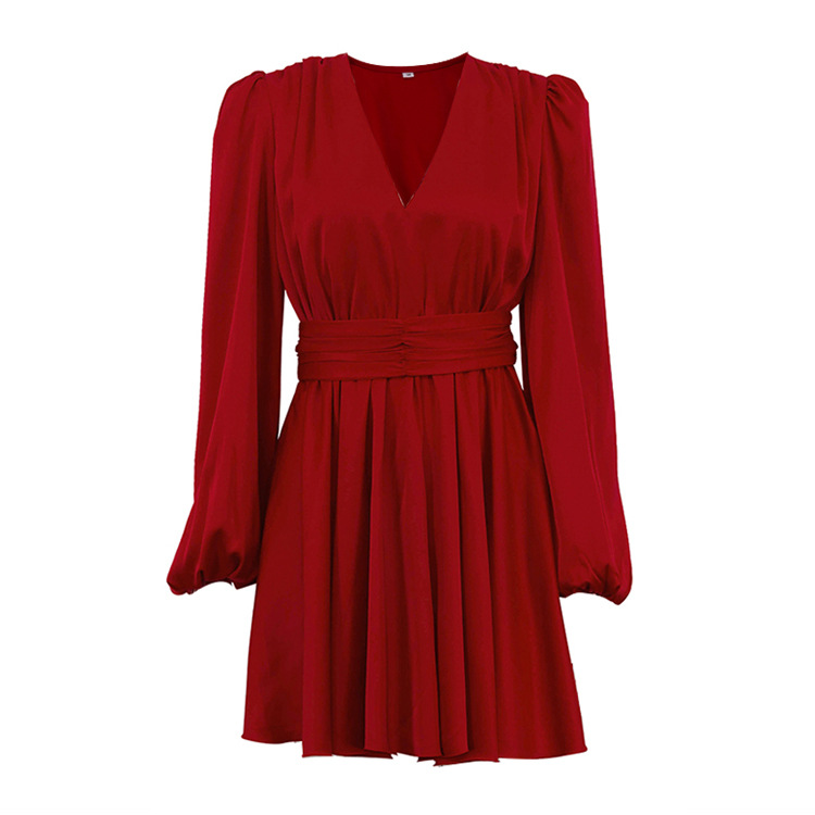 유럽과 미국의 국경 간 프랑스 Pleated 원피스 여성 하이 엔드 버블 슬리브 V 넥 허리 씰 슬리밍 새틴 A 라인 스커트
