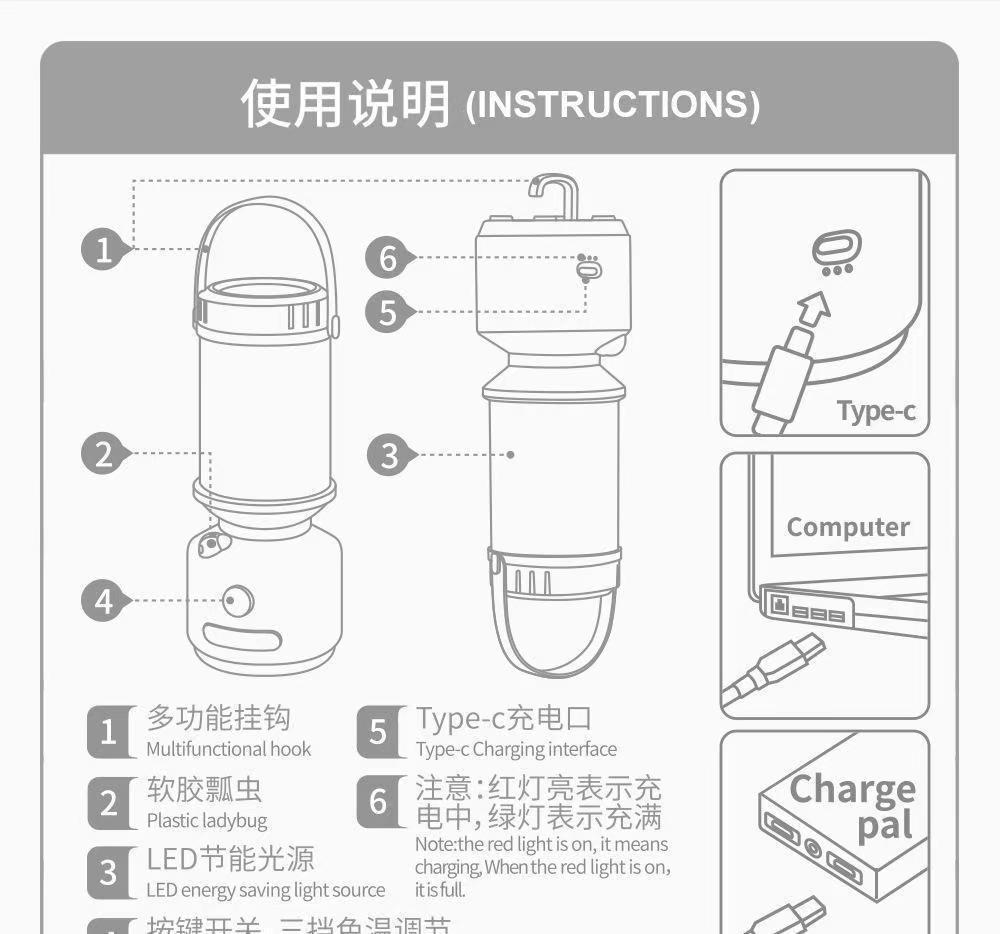 무당 벌레 야외 빛 캠핑 빛 창조적 인 캠핑 조명 비상 조명 휴대용 충전 수면 LED 야간 조명