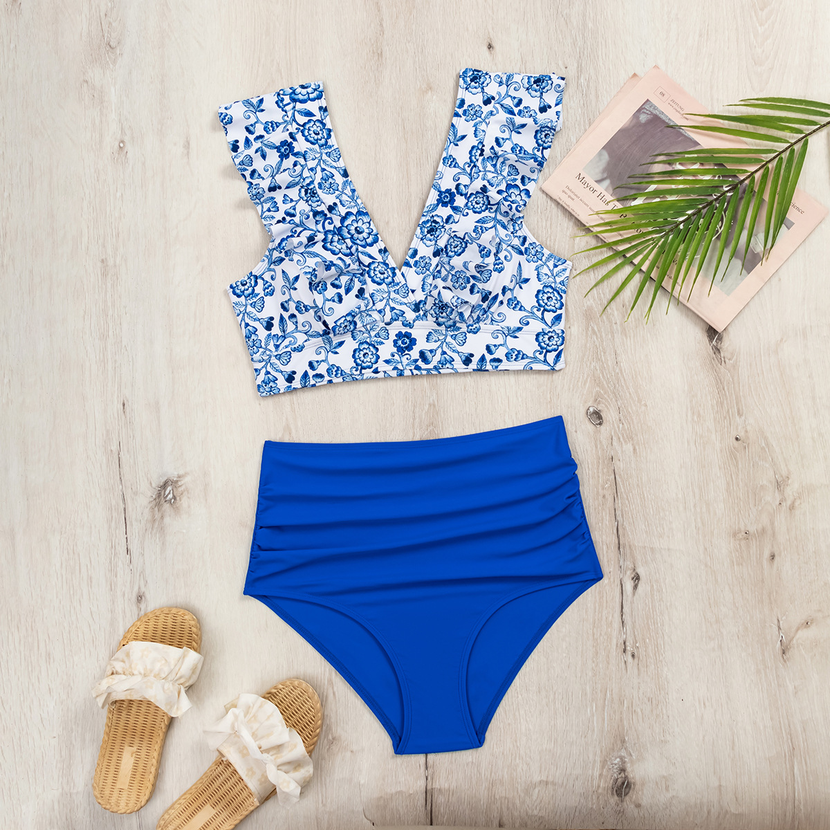 유럽과 미국의 국경 새로운 여성 패션 인쇄 러플 활 높은 허리 삼각형 비키니 분할 수영복스토어 가기
