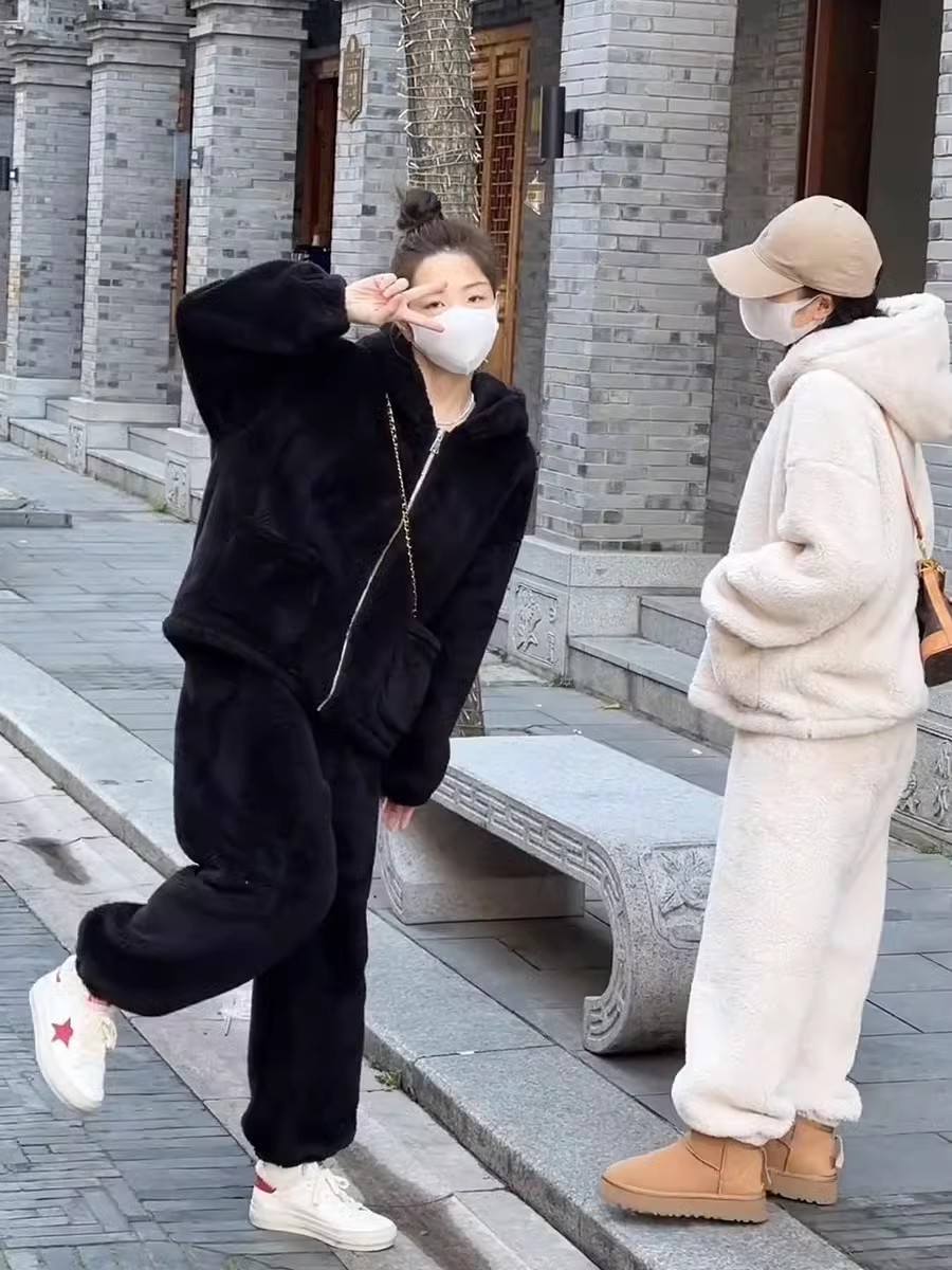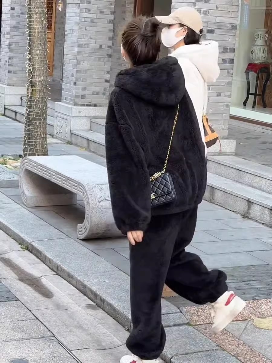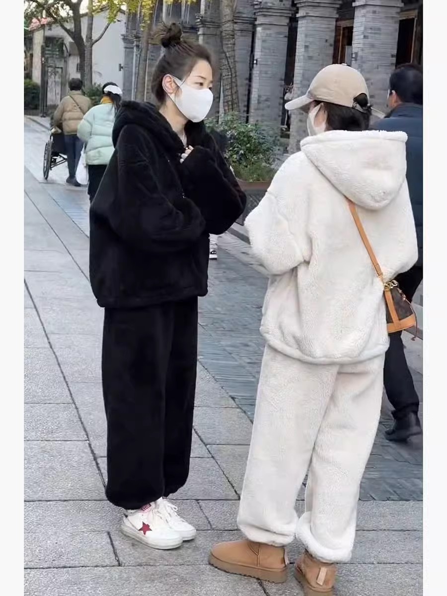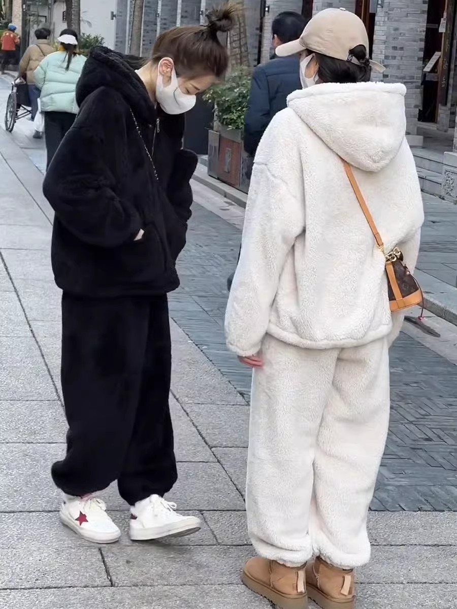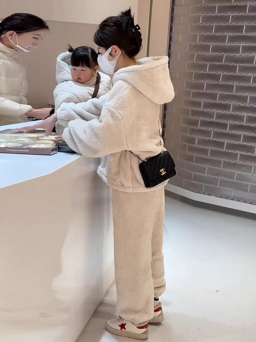 한국 스타일 캐주얼 후드 봉제 자켓 여성 2024 년 겨울 새 느슨한 기모 홈 옷 투피스 세트스토어 가기